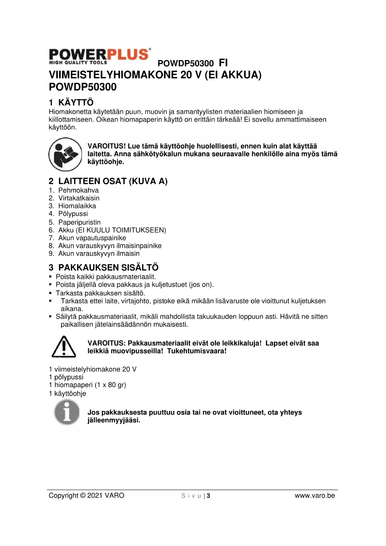 Copyright © 2021 VARO S i v u | 3 www.varo.be VIIMEISTELYHIOMAKONE 20 V (EI AKKUA) POWDP50300 1 KÄYTTÖ Hiomakonetta käytetään puun, muovin ja samantyylisten materiaalien hiomiseen ja kiillottamiseen. Oikean hiomapaperin käyttö on erittäin tärkeää! Ei sovellu ammattimaiseen käyttöön. VAROITUS! Lue tämä käyttöohje huolellisesti, ennen kuin alat käyttää laitetta. Anna sähkötyökalun mukana seuraavalle henkilölle aina myös tämä käyttöohje. 2 LAITTEEN OSAT (KUVA A)