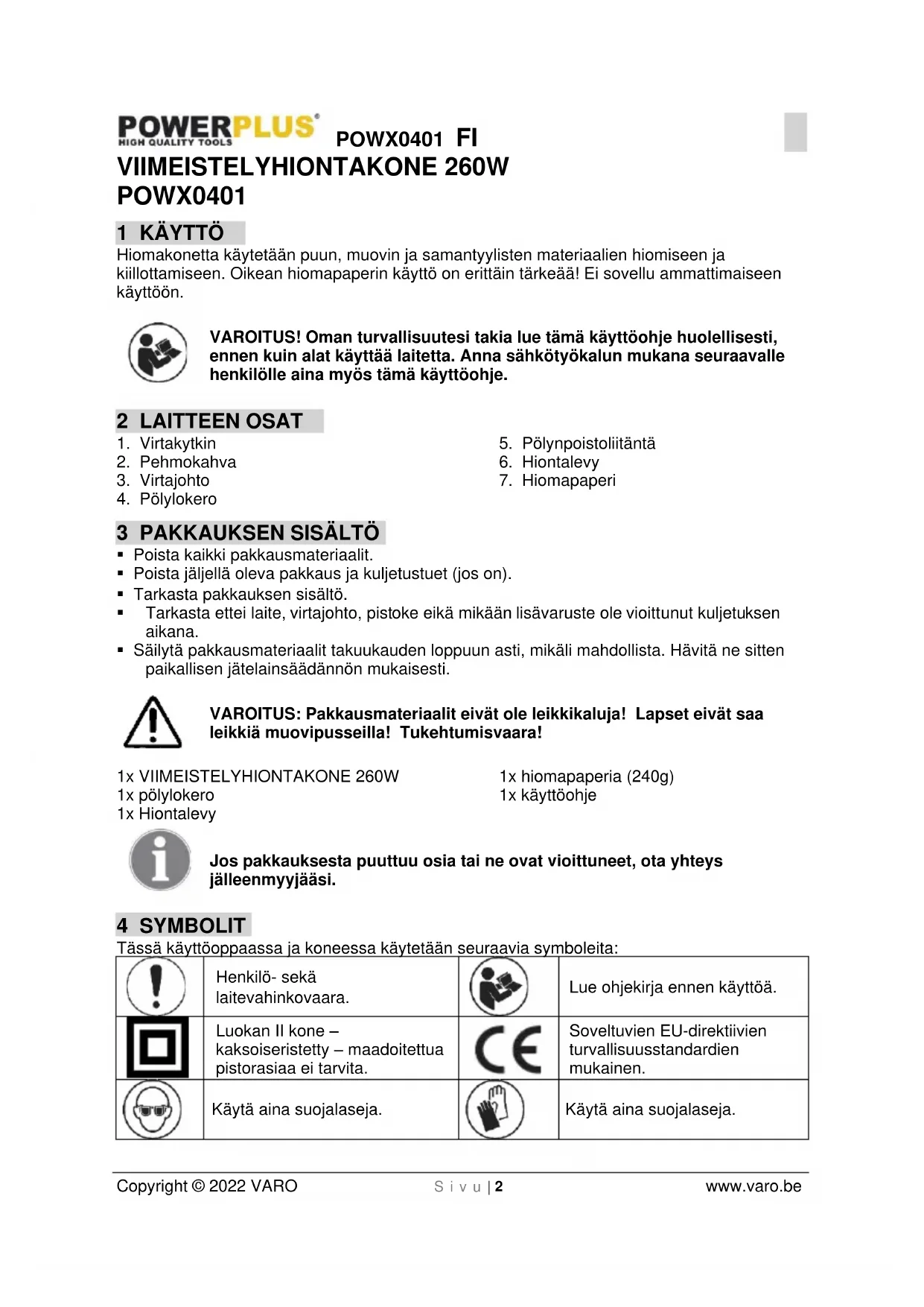 Copyright © 2022 VARO S i v u | 2 www.varo.be VIIMEISTELYHIONTAKONE 260W POWX0401 1 KÄYTTÖ Hiomakonetta käytetään puun, muovin ja samantyylisten materiaalien hiomiseen ja kiillottamiseen. Oikean hiomapaperin käyttö on erittäin tärkeää! Ei sovellu ammattimaiseen käyttöön. VAROITUS! Oman turvallisuutesi takia lue tämä käyttöohje huolellisesti, ennen kuin alat käyttää laitetta. Anna sähkötyökalun mukana seuraavalle henkilölle aina myös tämä käyttöohje. 2 LAITTEEN OSAT