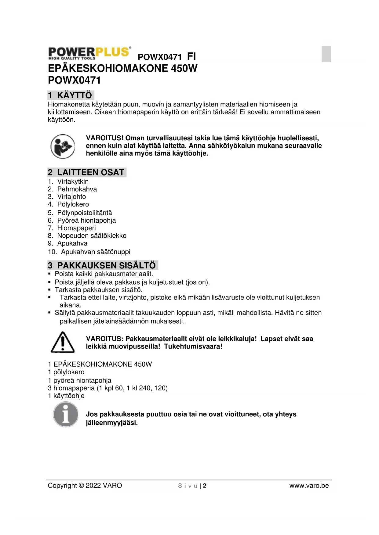 POWX0471 1 KÄYTTÖ Hiomakonetta käytetään puun, muovin ja samantyylisten materiaalien hiomiseen ja kiillottamiseen. Oikean hiomapaperin käyttö on erittäin tärkeää! Ei sovellu ammattimaiseen käyttöön. VAROITUS! Oman turvallisuutesi takia lue tämä käyttöohje huolellisesti, ennen kuin alat käyttää laitetta. Anna sähkötyökalun mukana seuraavalle henkilölle aina myös tämä käyttöohje. 2 LAITTEEN OSAT