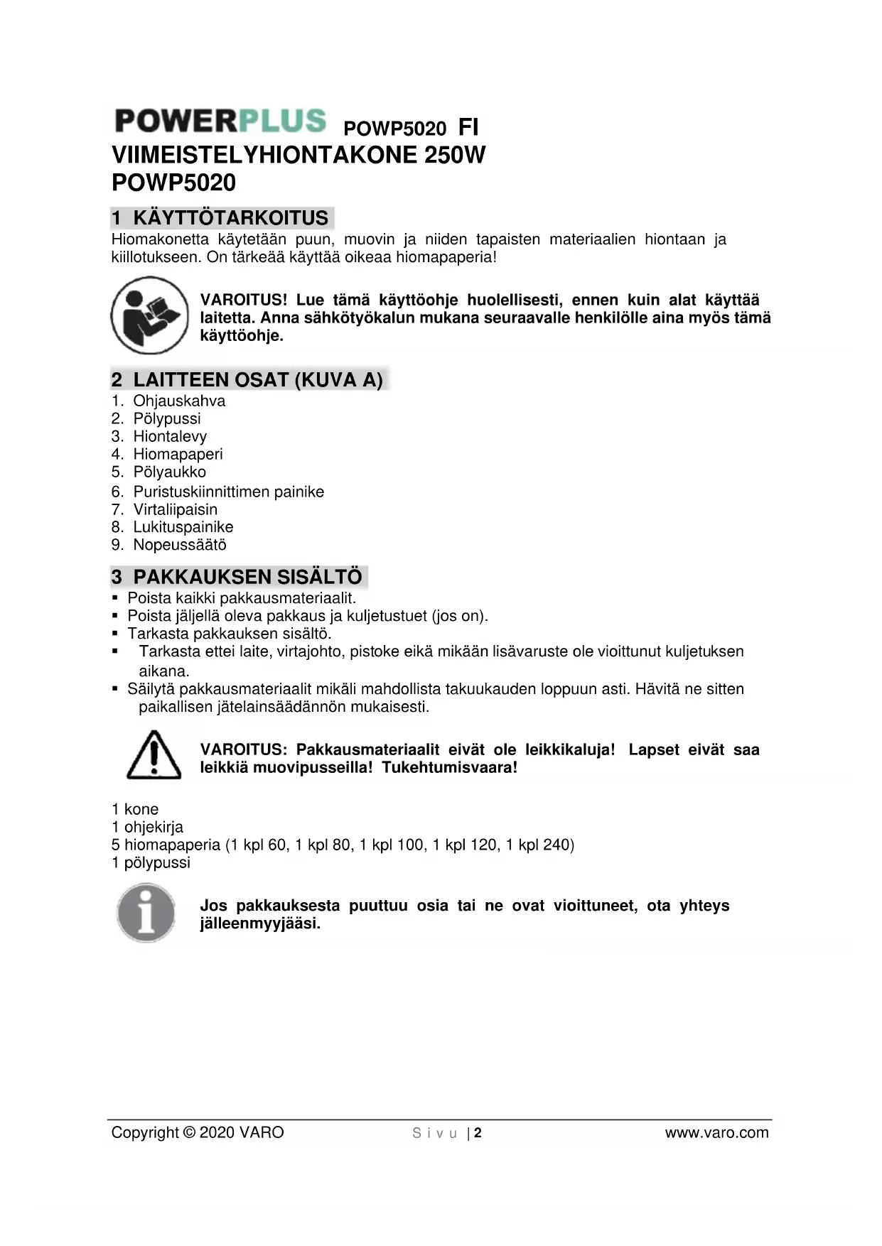 - Säilytä pakkausmateriaalit mikäli mahdollista takuukauden loppuun asti. Hävitä ne sitten paikallisen jätelainsäädännön mukaisesti. VAROITUS: Pakkausmateriaalit eivät ole leikkikaluja! Lapset eivät saa leikkiä muovipusseilla! Tukehtumisvaara! 1 kone 1 ohjekirja 5 hiomapaperia (1 kpl 60, 1 kpl 80, 1 kpl 100, 1 kpl 120, 1 kpl 240) 1 pölypussi Jos pakkauksesta puuttuu osia tai ne ovat vioittuneet, ota yhteys jälleenmyyjääsi.POWP5020 FI Copyright © 2020 VARO S i v u | 3 www.varo.com 4 SYMBOLIT Tässä käyttöoppaassa ja koneessa käytetään seuraavia symboleita: