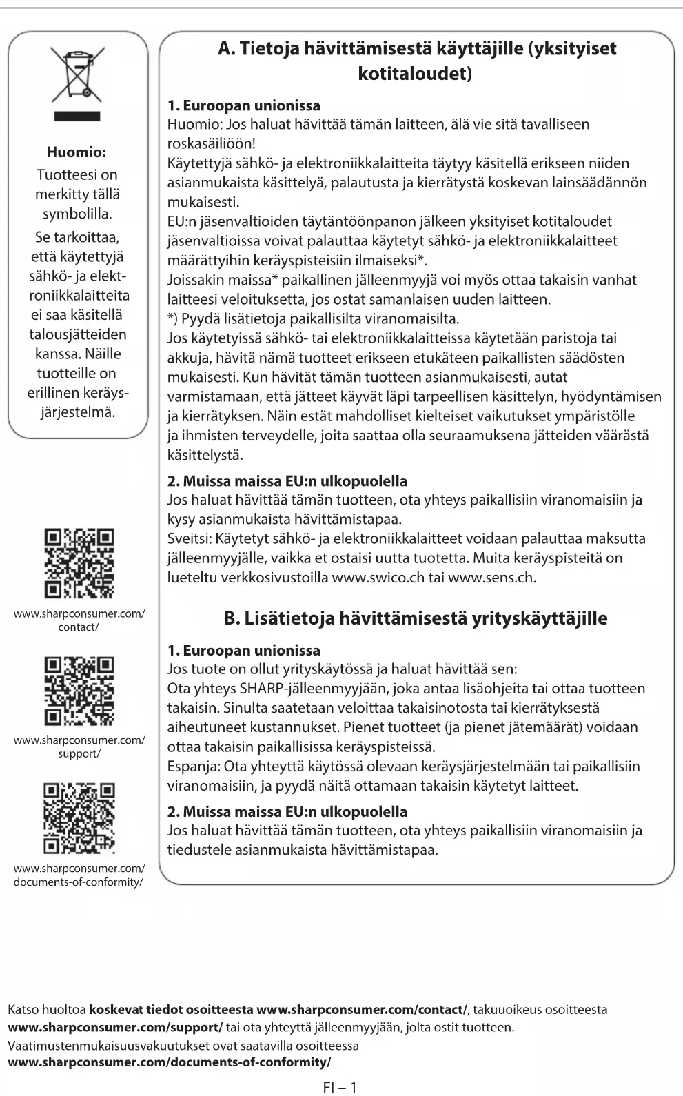 Jos haluat hävittää tämän tuotteen, ota yhteys paikallisiin viranomaisiin ja tiedustele asianmukaista hävittämistapaa. Huomio: Tuotteesi on merkitty tällä symbolilla. Se tarkoittaa, että käytettyjä sähkö- ja elekt- roniikkalaitteita ei saa käsitellä talousjätteiden kanssa. Näille tuotteille on erillinen keräys- järjestelmä. www.sharpconsumer.com/ support/ www.sharpconsumer.com/ documents-of-conformity/ www.sharpconsumer.com/ contact/ Katso huoltoa koskevat tiedot osoitteesta www.sharpconsumer.com/contact/, takuuoikeus osoitteesta www.sharpconsumer.com/support/ tai ota yhteyttä jälleenmyyjään, jolta ostit tuotteen. Vaatimustenmukaisuusvakuutukset ovat saatavilla osoitteessa www.sharpconsumer.com/documents-of-conformity/FI FI – 1FI – 1 A. Tietoja hävittämisestä käyttäjille (yksityiset kotitaloudet)