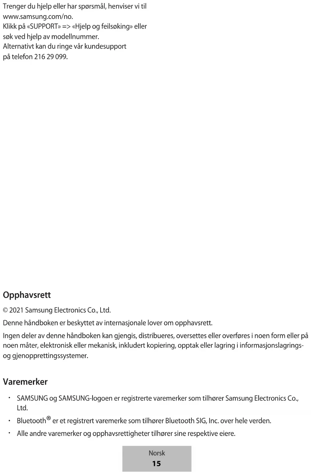 Samsung ei ole vastuussa vahingoista tai menetyksistä (sopimuksessa olevista tai vahingonkorvausvastuista, mukaan lukien laiminlyönti), jotka voivat aiheutua näiden varoitusten ja ohjeiden täsmällisesti noudattamatta jättämisestä, Samsungin laiminlyönnistä aiheutuvaa kuolemaa tai henkilövahinkoa lukuun ottamatta. Suomi 14Jos tarvitset apua tai on kysyttävää, käy sivullamme www.samsung.fi. Klikkaa ”TUKI”=>”Ongelmanratkaisu” ja valitse tuoteryhmä ja tuote. Vaihtoehtoisesti soita asiakastukeemme puhelinnumeroon: 030-6227 515 Tekijänoikeus Copyright © 2021 Samsung Electronics Co., Ltd. Tämä opas on kansainvälisten tekijänoikeuslakien suojaama. Mitään osaa tästä käyttöoppaasta ei saa kopioida, jakaa, kääntää tai lähettää missään muodossa tai millään keinolla, sähköisesti tai mekaanisesti, mukaan lukien valokopiointi, nauhoitus ja tallennus tiedontallennus- ja noutojärjestelmään. Tavaramerkit