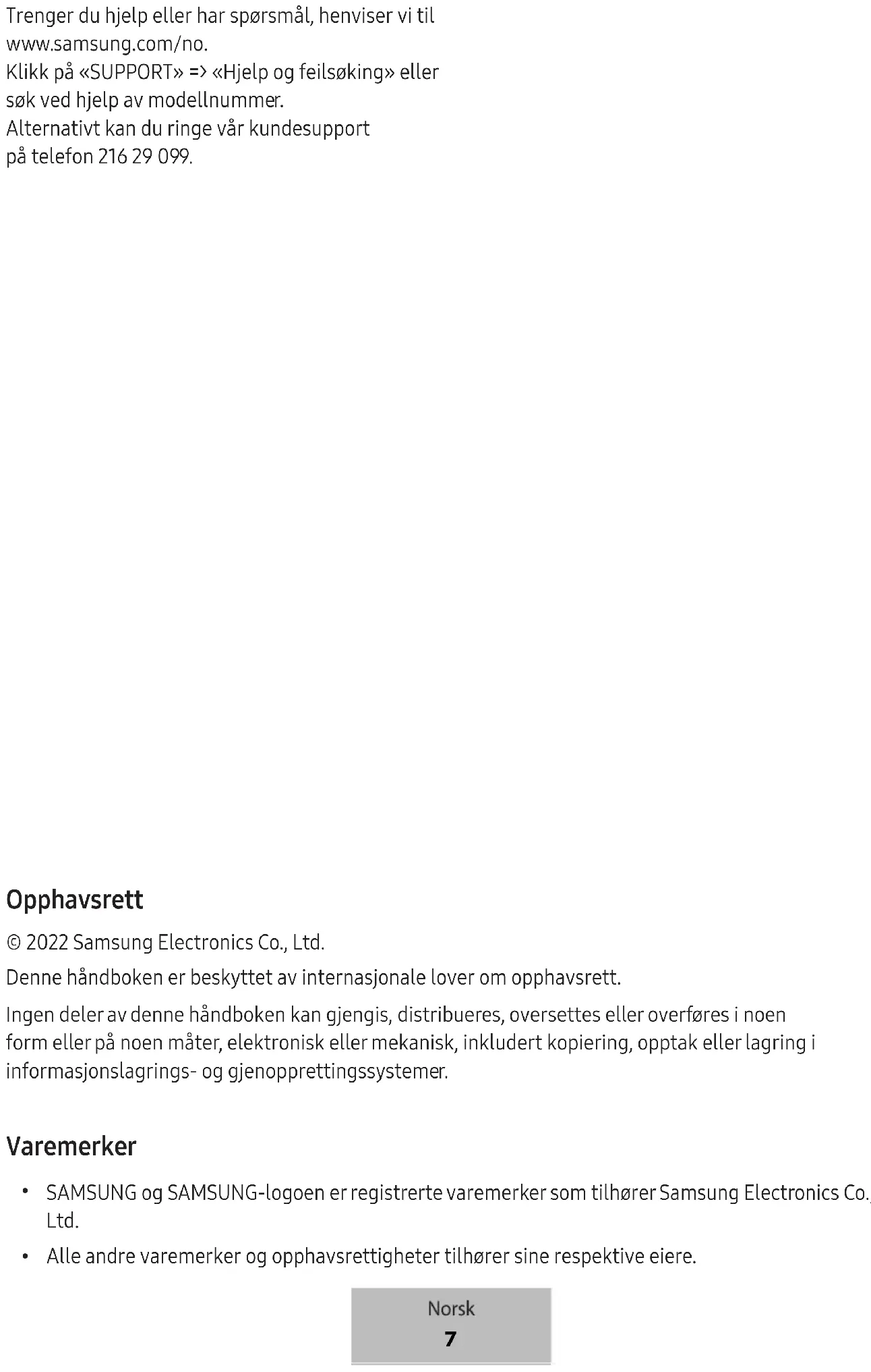 Kaikkien lisävarusteiden saatavuus on kokonaan niitä valmistavien vastaavien yhtiöiden vastuulla. Lisätietoja saatavilla olevista lisävarusteista on Samsungin sivustossa. Suomi 6Jos tarvitset apua tai on kysyttävää, käy sivullamme www.samsung.fi. Klikkaa ”TUKI”=>”Ongelmanratkaisu” ja valitse tuoteryhmä ja tuote. Vaihtoehtoisesti soita asiakastukeemme puhelinnumeroon: 030-6227 515 Tekijänoikeus Copyright © 2022 Samsung Electronics Co., Ltd. Tämä opas on kansainvälisten tekijänoikeuslakien suojaama. Mitään osaa tästä käyttöoppaasta ei saa kopioida, jakaa, kääntää tai lähettää missään muodossa tai millään keinolla, sähköisesti tai mekaanisesti, mukaan lukien valokopiointi, nauhoitus ja tallennus tiedontallennus- ja noutojärjestelmään. Tavaramerkit