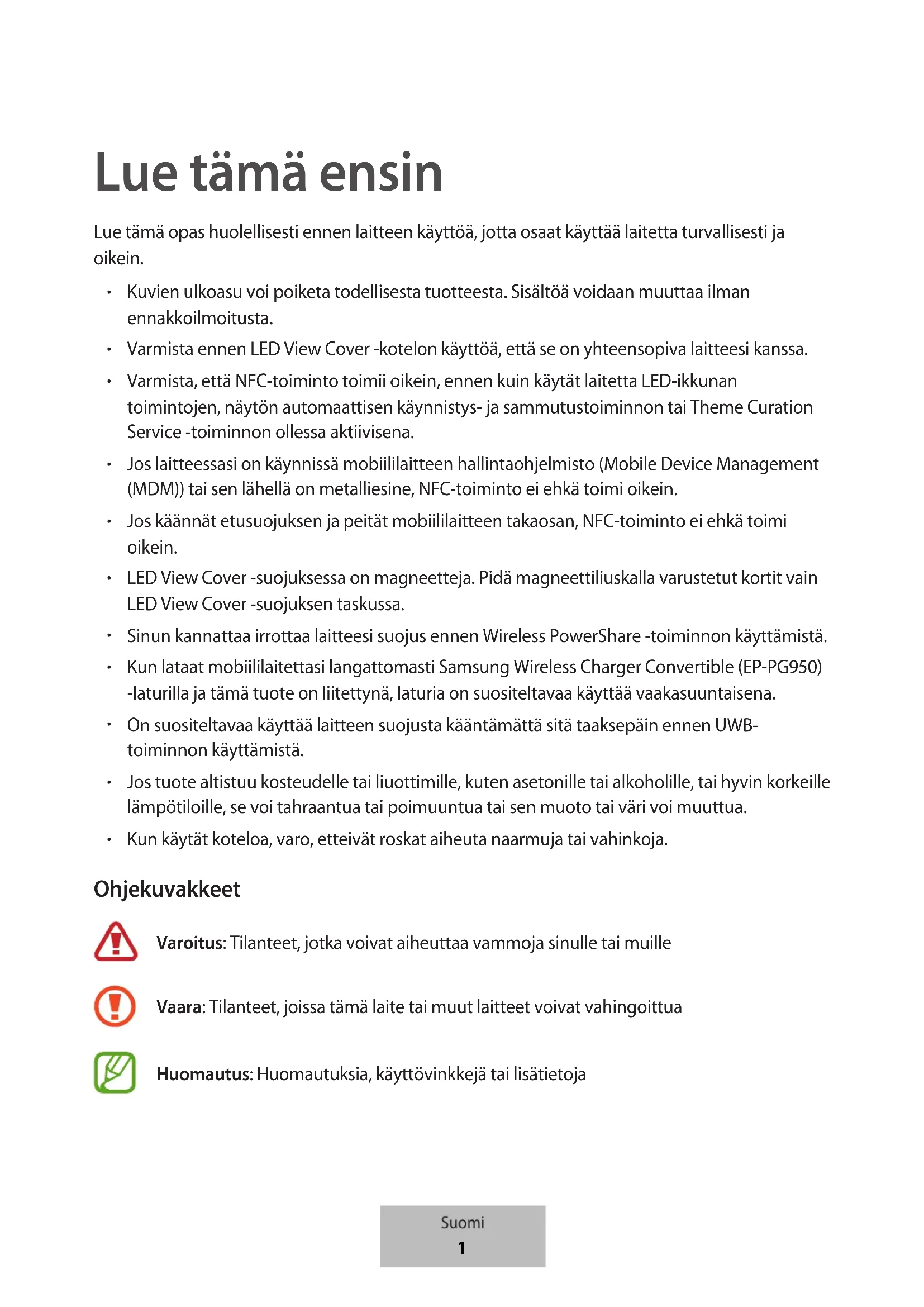 Kun käytät koteloa, varo, etteivät roskat aiheuta naarmuja tai vahinkoja. Ohjekuvakkeet Varoitus: Tilanteet, jotka voivat aiheuttaa vammoja sinulle tai muille Vaara: Tilanteet, joissa tämä laite tai muut laitteet voivat vahingoittua Huomautus: Huomautuksia, käyttövinkkejä tai lisätietoja Suomi