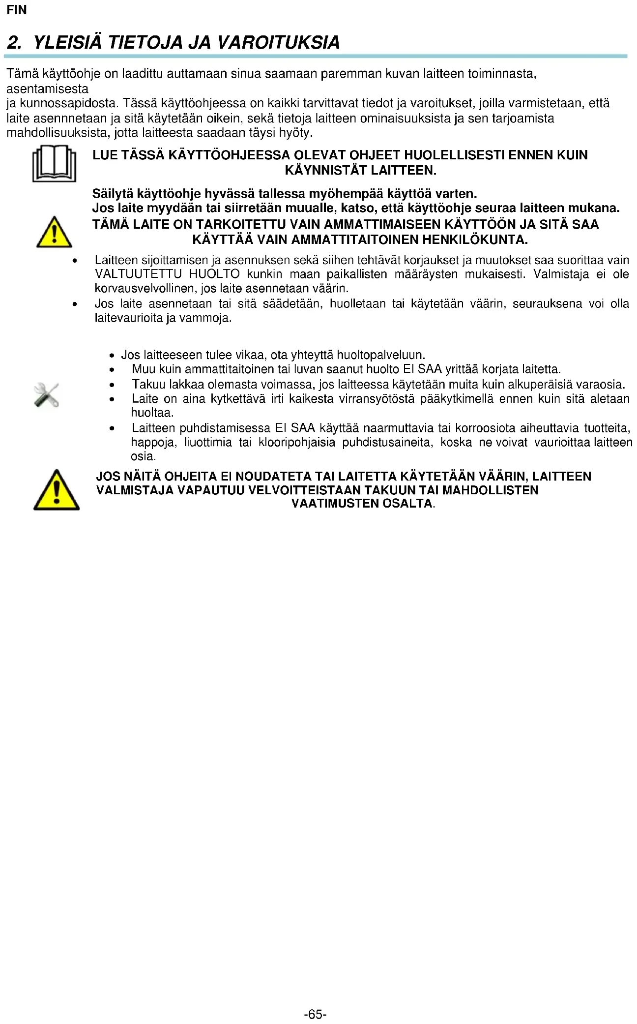 - Muu kuin ammattitaitoinen tai luvan saanut huolto EI SAA yrittää korjata laitetta.