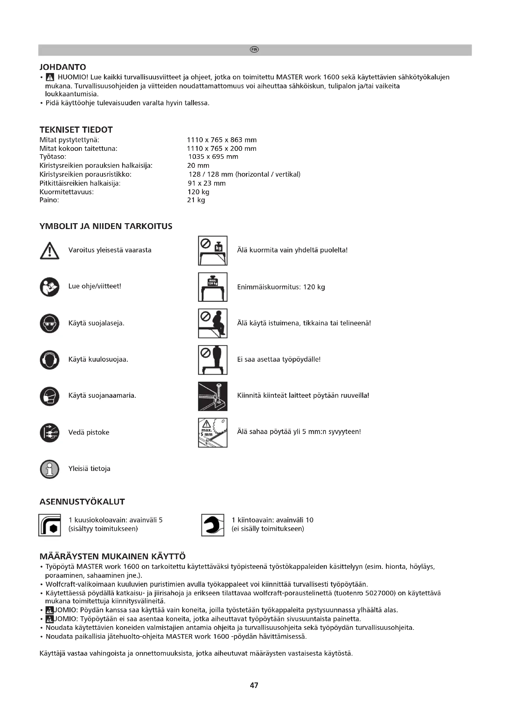 - Pidä käyttöohje tulevaisuuden varalta hyvin tallessa. TEKNISET TIEDOT Mitat pystytettynä: 1110 x 765 x 863 mm Mitat kokoon taitettuna: 1110 x 765 x 200 mm Työtaso: 1035 x 695 mm Kiristysreikien porauksien halkaisija: 20 mm Kiristysreikien porausristikko: 128 / 128 mm (horizontal / vertikal) Pitkittäisreikien halkaisija: 91 x 23 mm Kuormitettavuus: 120 kg Paino: 21 kg