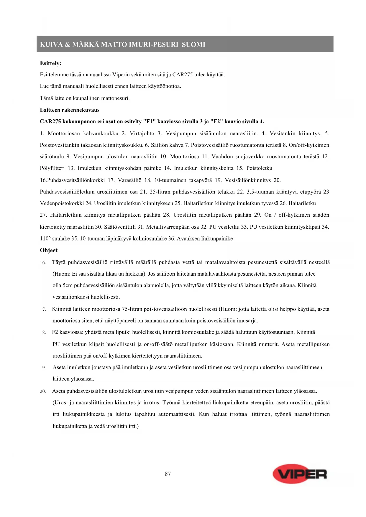 Esittely: Esittelemme tässä manuaalissa Viperin sekä miten sitä ja CAR275 tulee käyttää. Lue tämä manuaali huolellisesti ennen laitteen käyttöönottoa. Tämä laite on kaupallinen mattopesuri. Laitteen rakennekuvaus CAR275 kokoonpanon eri osat on esitelty "F1" kaaviossa sivulla 3 ja "F2" kaavio sivulla 4.