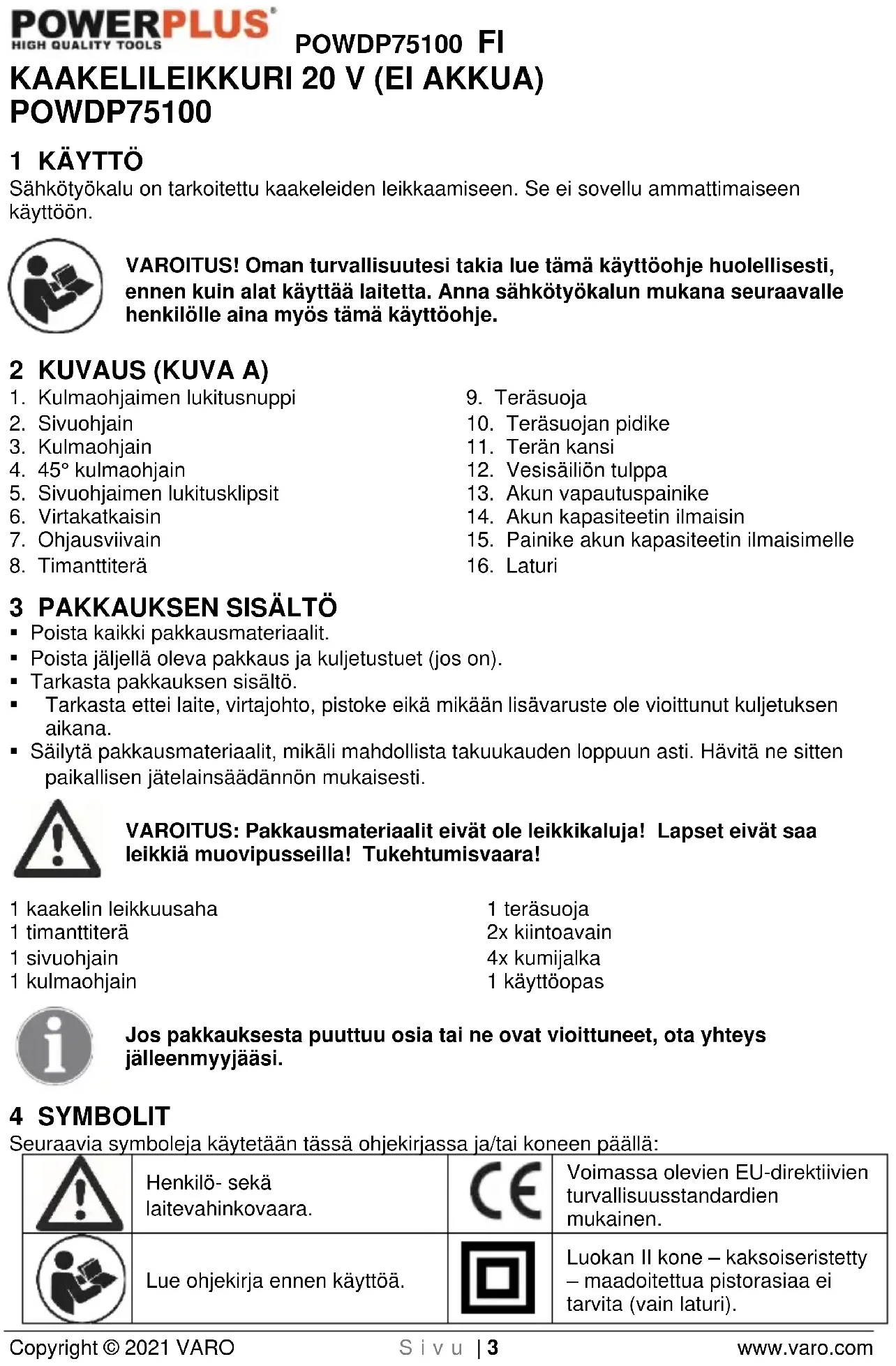 Copyright © 2021 VARO S i v u | 3 www.varo.com KAAKELILEIKKURI 20 V (EI AKKUA) POWDP75100 1 KÄYTTÖ Sähkötyökalu on tarkoitettu kaakeleiden leikkaamiseen. Se ei sovellu ammattimaiseen käyttöön. VAROITUS! Oman turvallisuutesi takia lue tämä käyttöohje huolellisesti, ennen kuin alat käyttää laitetta. Anna sähkötyökalun mukana seuraavalle henkilölle aina myös tämä käyttöohje. 2 KUVAUS (KUVA A)