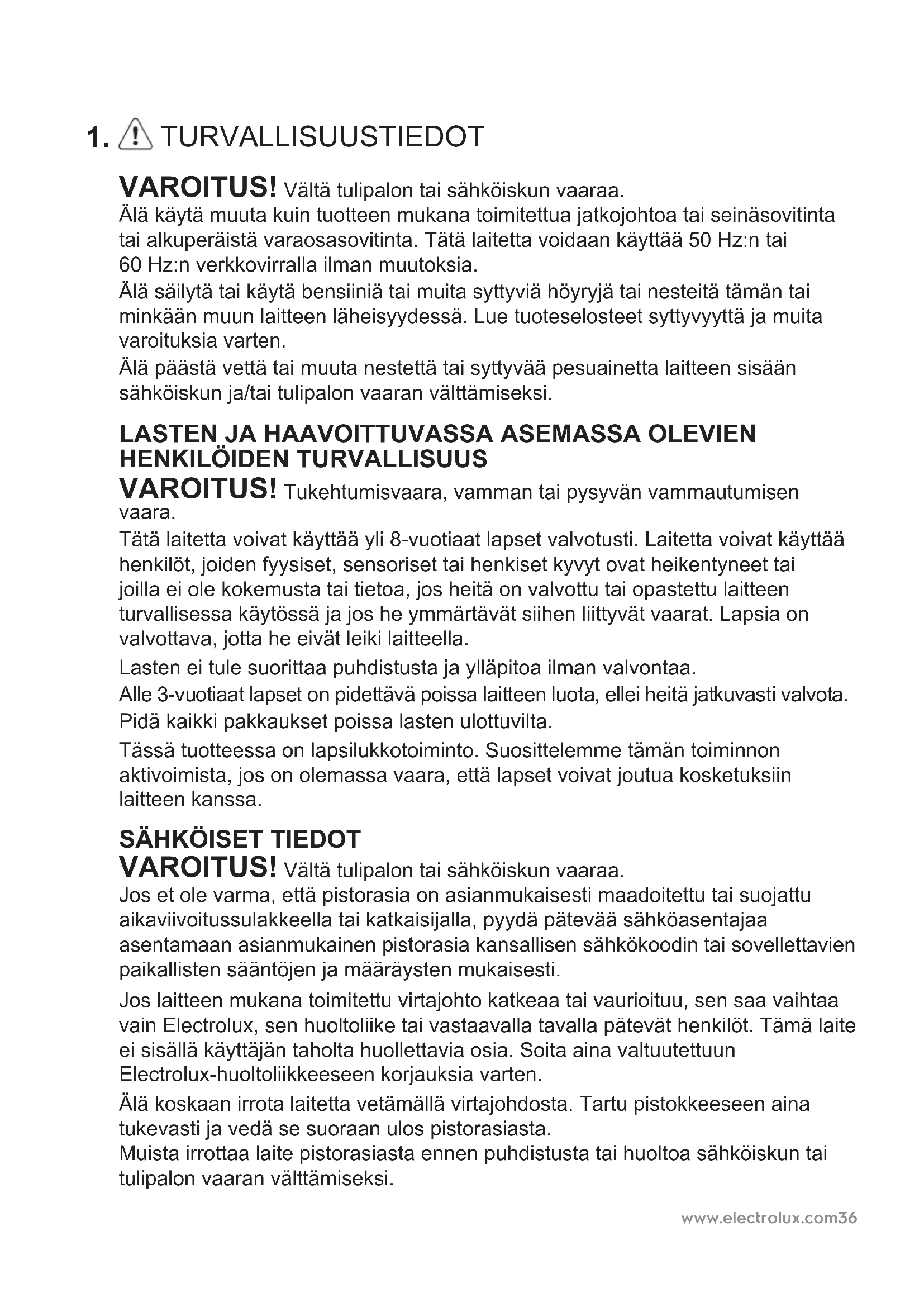 VAROITUS! Tukehtumisvaara, vamman tai pysyvän vammautumisen vaara. Tätä laitetta voivat käyttää yli 8-vuotiaat lapset valvotusti. Laitetta voivat käyttää henkilöt, joiden fyysiset, sensoriset tai henkiset kyvyt ovat heikentyneet tai joilla ei ole kokemusta tai tietoa, jos heitä on valvottu tai opastettu laitteen turvallisessa käytössä ja jos he ymmärtävät siihen liittyvät vaarat. Lapsia on valvottava, jotta he eivät leiki laitteella. Lasten ei tule suorittaa puhdistusta ja ylläpitoa ilman valvontaa. Alle 3-vuotiaat lapset on pidettävä poissa laitteen luota, ellei heitä jatkuvasti valvota. Pidä kaikki pakkaukset poissa lasten ulottuvilta. Tässä tuotteessa on lapsilukkotoiminto. Suosittelemme tämän toiminnon aktivoimista, jos on olemassa vaara, että lapset voivat joutua kosketuksiin laitteen kanssa.