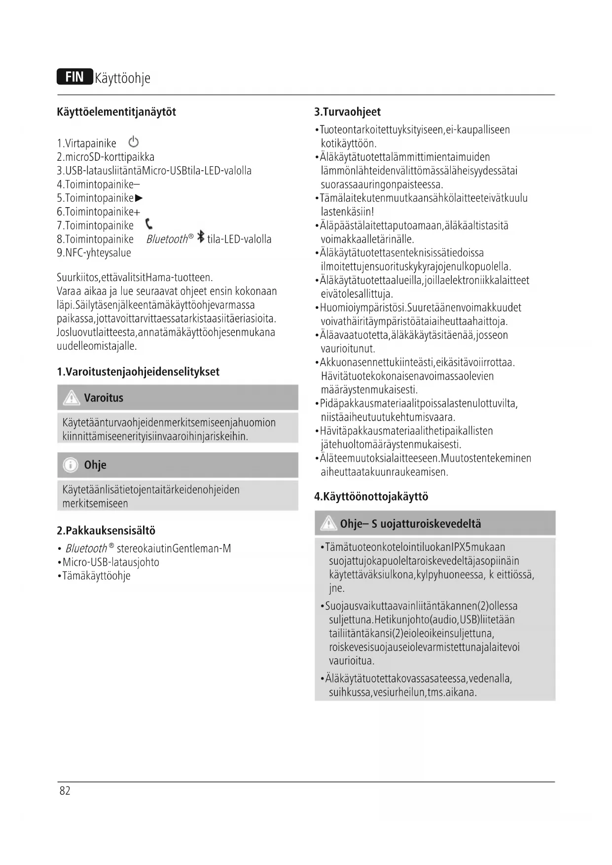- Älä käytä tuotetta kovassa sateessa, veden alla, suihkussa, vesiurheilun, tms. aikana. L Käyttöohje83