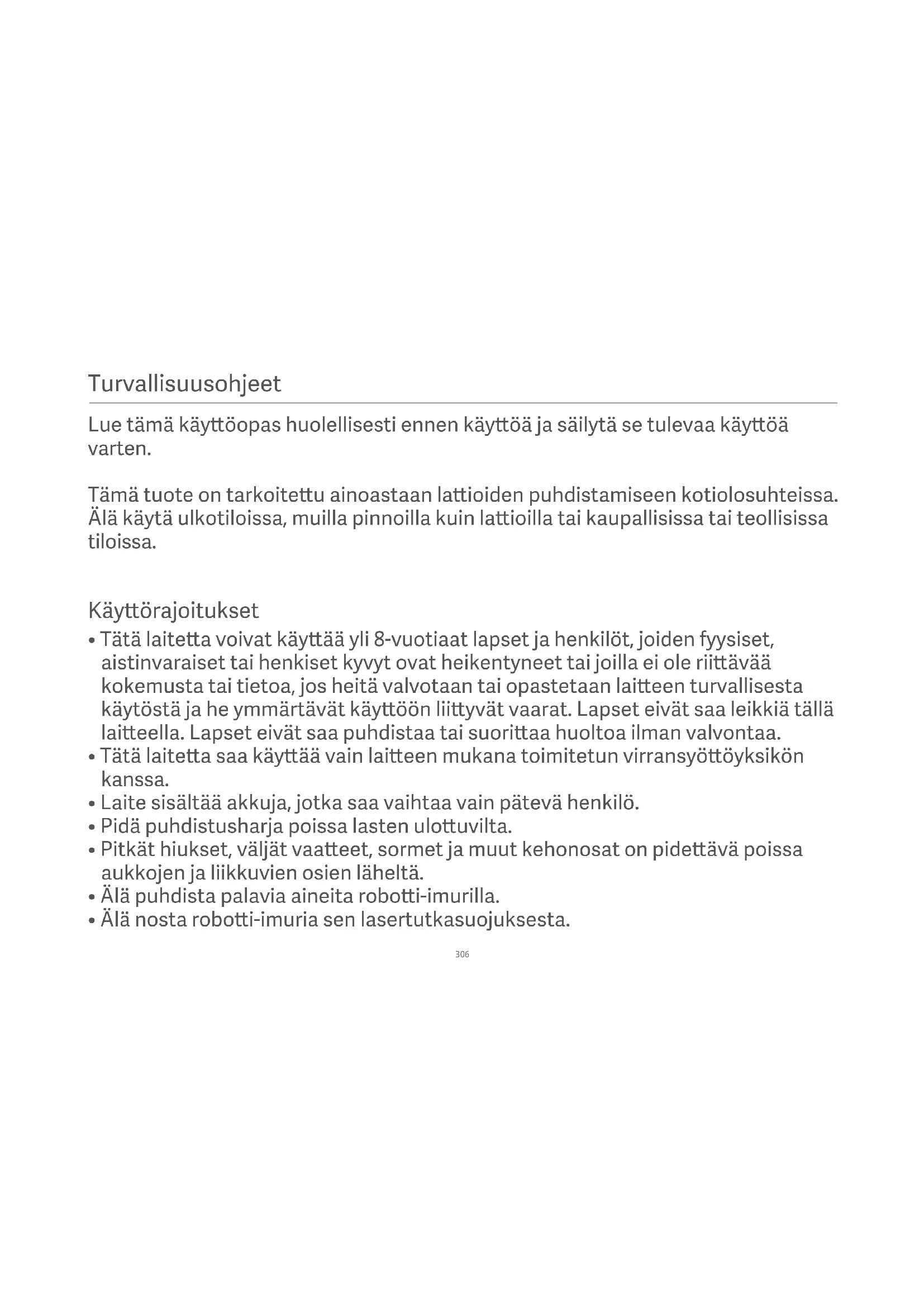 - Älä nosta roboi-imuria sen lasertutkasuojuksesta. Lue tämä käyöopas huolellisesti ennen käyöä ja säilytä se tulevaa käyöä varten. Tämä tuote on tarkoiteu ainoastaan laioiden puhdistamiseen kotiolosuhteissa. Älä käytä ulkotiloissa, muilla pinnoilla kuin laioilla tai kaupallisissa tai teollisissa tiloissa. 306• Varmista, eä roboi-imuri on sammuteu ja eä virta-adapteri on irroteu pistorasiasta ennen puhdistusta tai huoltoa.