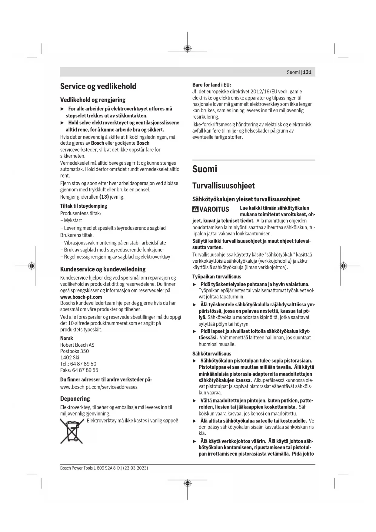 Samanpituisten työkappaleiden helppoa sahausta varten voit käyttää vasenta tai oikeaa pituusohjainta (36). – Käännä pituusohjainta (36) ylöspäin. – Säädä sahapöydän pidennysosa (25) halutun työkappa- leen pituiseksi. Erikoismalliset työkappaleet Kun sahaat kaarevia tai pyöreitä työkappaleita, niiden paikal- taan siirtyminen on estettävä erityisen huolellisesti.Sahaus- linjan kohdalla ei saa olla rakoa työkappaleen, ohjainkiskon ja sahapöydän välillä. Tarvittaessa on valmistettava tehtävään räätälöityjä pidik- keitä. Kulutuslevyjen vaihtaminen (katso kuva S) Kulutuslevyt (16) kuluvat sähkötyökalun käytön myötä. Vaihda vialliset kulutuslevyt. – Aseta sähkötyökalu käyttöasentoon. – Irrota ruuvit (54) tavallisella ristipääruuvitaltalla ja ota vanha kulutuslevy (16) pois. – Asenna uusi kulutuslevy ja kiristä ruuvit (54). Laserin säätö Huomautus: lasertoiminnon testaamiseksi sähkötyökalu on kytkettävä virtalähteeseen. u Älä missään tapauksessa paina käynnistyskytkintä, kun säädät laseria (esimerkiksi sahausvartta liikut- 1 609 92A 8HX | (23.03.2023) Bosch Power ToolsSuomi | 141 taessasi). Loukkaantumisvaara, jos sähkötyökalu käyn- nistyy tahattomasti. – Aseta sähkötyökalu käyttöasentoon. – Käännä sahapöytää (14) 0°-loveen (22) asti. Vivun (19) tulee lukkiutua kunnolla loveen. Raskaan käytön jälkeen lasersäteet tulee tarkastaa ja tarvit- taessa säätää uudelleen tarkkojen sahaustulosten varmista- miseksi. Siihen tarvitaan kokemusta ja asianmukaista erikoistyökalua. Valtuutetut Bosch-huoltopisteet suorittavat nämä tehtävät nopeasti ja luotettavasti. Tarkistus (katso kuva T1) – Piirrä työkappaleeseen suora merkkiviiva. – Ohjaa sahausvartta kahvan(9) avulla hitaasti alaspäin. – Suuntaa työkappale niin, että sahanterän hampaat ovat merkkiviivan kohdalla. – Pidä työkappaletta tässä asennossa ja ohjaa sahausvarsi hitaasti takaisin yläasentoon. – Kiinnitä työkappale. – Sytytä lasersäteet kytkimellä (5). Vasemman ja oikean lasersäteen tulee olla koko matkalla sa- malla etäisyydellä työkappaleen merkkiviivasta, myös ohja- tessasi sahausvartta alaspäin. Lasersuojuksen irrottaminen (katso kuva T2) – Avaa lasersuojuksen (10) kaksi ruuvia (55) kuusiokoloa- vaimella/ruuvitaltalla (43) ja ota lasersuojus pois. Sahausvarren liikkeestä aiheutuvan sivupoikkeaman säätäminen (katso kuvat T3−T4) – Löysää kiinnitysruuvia (56) (n. 1–2kierrosta). Älä kierrä ruuvia kokonaan ulos. – Siirrä laserin koteloa (57) oikealle tai vasemmalle, kunnes lasersäteet eivät enää poikkea sivusuunnassa sahausvar- ren laskuliikkeen yhteydessä. – Pidä laserin koteloa (57) paikallaan tässä asennossa ja ki- ristä kiinnitysruuvi (56). – Kiinnitä lasersuojus (10) takaisin paikalleen. Perusasetusten tarkistus ja säätö Raskaan käytön jälkeen sähkötyökalun perusasetukset täy- tyy tarkastaa ja tarvittaessa säätää tarkkojen sahaustulosten varmistamiseksi. Siihen tarvitaan kokemusta ja asianmukaista erikoistyökalua. Valtuutetut Bosch-huoltopisteet suorittavat nämä tehtävät nopeasti ja luotettavasti. Kulmaosoittimen (vaakasuuntainen) kohdistaminen (katso kuva U) – Aseta sähkötyökalu käyttöasentoon. – Käännä sahapöytää (14) 0°-loveen (22) asti. Vivun (19) täytyy napsahtaa tuntuvasti kiinni loveen. Tarkistus Kulmaosoittimen (58) täytyy olla kohdakkain asteikon (23) 0°-merkin kanssa. Säätäminen – Löysää ruuvia (59) ristipääruuvitaltalla ja kohdista kul- maosoitin 0°-merkkiin. – Kiristä ruuvi. Pystysuuntaisen kulman osoittimen kohdistaminen (katso kuva V) – Aseta sähkötyökalu käyttöasentoon. – Avaa lukituspyörä (45). – Vedä lukitusvipua (46) ulospäin ja säädä sahausvarrella pystysuuntainen 0°:n jiirikulma. – Vapauta lukitusvipu (46). Lukitusvivun tulee lukittua tun- tuvasti paikalleen – Kiristä lukituspyörä (45). Tarkistus Kulmaosoittimen (30) täytyy olla kohdakkain asteikon (29) 0°-merkin kanssa. Säätäminen – Löysää ruuvia (60) ristipääruuvitaltalla ja kohdista kul- maosoitin 0°-merkkiin. – Kiristä ruuvi. Sähkötyökalun kuljettaminen (katso kuva W) Seuraavat toimenpiteet on suoritettava ennen sähkötyöka- lun kuljetusta: – Avaa lukitusruuvi(1), jos se on kiinni. Vedä sahausvarsi eteenpäin ääriasentoon ja kiristä lukitusruuvi. – Varmista, että syvyydenrajoitin (39) on käännetty koko- naan taaksepäin ja ettei säätöruuvi (38) kosketa mihin- kään, kun liikutat sahausvartta. – Aseta sähkötyökalu kuljetusasentoon. – Poista kaikki lisätarvikkeet, joita ei voi kiinnittää kunnolla sähkötyökaluun. Kuljeta käyttämättömiä sahanteriä mie- luiten suljetussa kotelossa. – Aseta kuljetuskahva (3) pystysuoraan asentoon. – Kanna sähkötyökalua kuljetuskahvan(3) avulla tai saha- pöydän kylkien kädensijoista(61). u Käytä sähkötyökalun kuljetukseen vain kuljetusvarus- teita. Älä missään tapauksessa kanna sitä suojuksien tai työkappaletukien varassa. Hoito ja huolto Huolto ja puhdistus u Irrota pistotulppa pistorasiasta ennen kaikkia sähkö- työkaluun kohdistuvia töitä. u Pidä sähkötyökalu ja tuuletusaukot puhtaina luotetta- van ja turvallisen työskentelyn varmistamiseksi. Jos virtajohto täytyy vaihtaa, turvallisuussyistä tämän saa tehdä vain Bosch tai valtuutettu Bosch-sähkötyökalujen huoltopiste. Heilurisuojuksen täytyy aina liikkua esteettömästi ja sulkeu- tua automaattisesti. Pidä siksi heilurisuojuksen ympäristö aina puhtaana. Bosch Power Tools 1 609 92A 8HX | (23.03.2023)142 | Ελληνικά Poista jokaisen työkerran jälkeen pöly ja purut paineilmalla tai siveltimellä. Puhdista liukurulla (13) säännöllisin väliajoin. Toimenpiteet melun vähentämiseen Valmistajan toimenpiteet: – Pehmeä käynnistys – Toimitetaan melua vähentävällä sahanterällä Käyttäjän toimenpiteet: – Asennus tärinää estäv