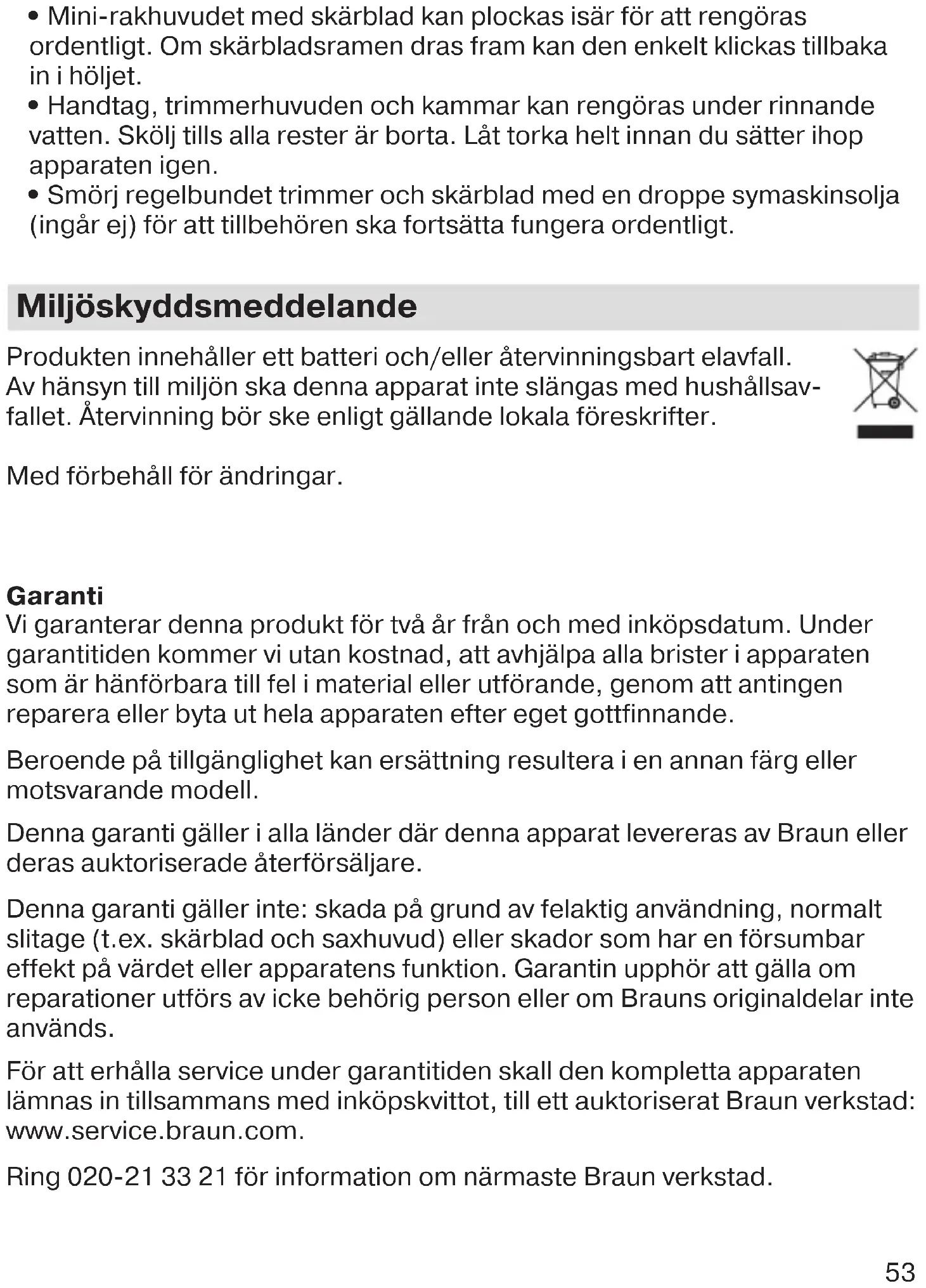 - Jotta lisäosat toimivat kunnolla, voitele trimmerit ja teräverkot säännöllisesti pisaralla ohutta koneöljyä (ei sisälly toimitukseen). Ympäristönsuojeluun liittyviä seikkoja Tuote sisältää akun/pariston ja/tai kierrätettäviä sähköosia. Ympäristönsuojelullisista syistä tuotetta ei saa hävittää kotitalousjät- teen mukana käyttöiän päättyessä. Hävitä tuote viemällä se asianmu- kaiseen keräyspisteeseen. Tiedot voivat muuttua ilman ennakkoilmoitusta. Takuu Tälle tuotteelle myönnämme 2 vuoden takuun ostopäivästä lukien Suomessa voimassa olevien alan takuuehtojen TE90 mukaan. Takuuaikana korvataan veloituksetta kaikki viat, jotka aiheutuvat materiaaliviasta tai valmistusvirheestä. Saatavuudesta riippuen laite saatetaan korvata erivärisellä tai vastaavalla laitteella. Korvaus tapahtuu harkintamme mukaan korjaamalla, vaihtamalla viallinen osa tai vaihtamalla koko laite uuteen. Takuu on voimassa kaikkialla maail- massa sillä edellytyksellä, että laitetta myydään ko. maassa Braunin tai virallisen maahantuojan toimesta. Takuun piiriin eivät kuulu viat, jotka johtuvat virheellisestä käytöstä tai normaalista kulumisesta (esim. teräverkko tai leikkuuterä). Takuu ei myöskään kata sellaisia vikoja, jotka eivät merkittävästi vaikuta laitteen arvoon tai toimintaan. Takuun voimassaolo lakkaa, jos laitetta korjataan muualla kuin valtuutetussa Braun-huoltoliikkeessä tai jos laitteessa käytetään muita kuin alkuperäisiä varaosia. Yksilöity ostokuitti riittää takuun voimassaolon osoittamiseksi: www.service.braun.com. Lisätietoa takuuseen liittyvistä asioista saa asiakaspalvelukeskuksestamme numerosta 020-377 877. 90012280_Type5542_BT_7350_7340_7330_7320_5365_5360_5342_5340_MN_ANZ.indd 5790012280_Type5542_BT_7350_7340_7330_7320_5365_5360_5342_5340_MN_ANZ.indd 57 13.09.21 09:1913.09.21 09:1958