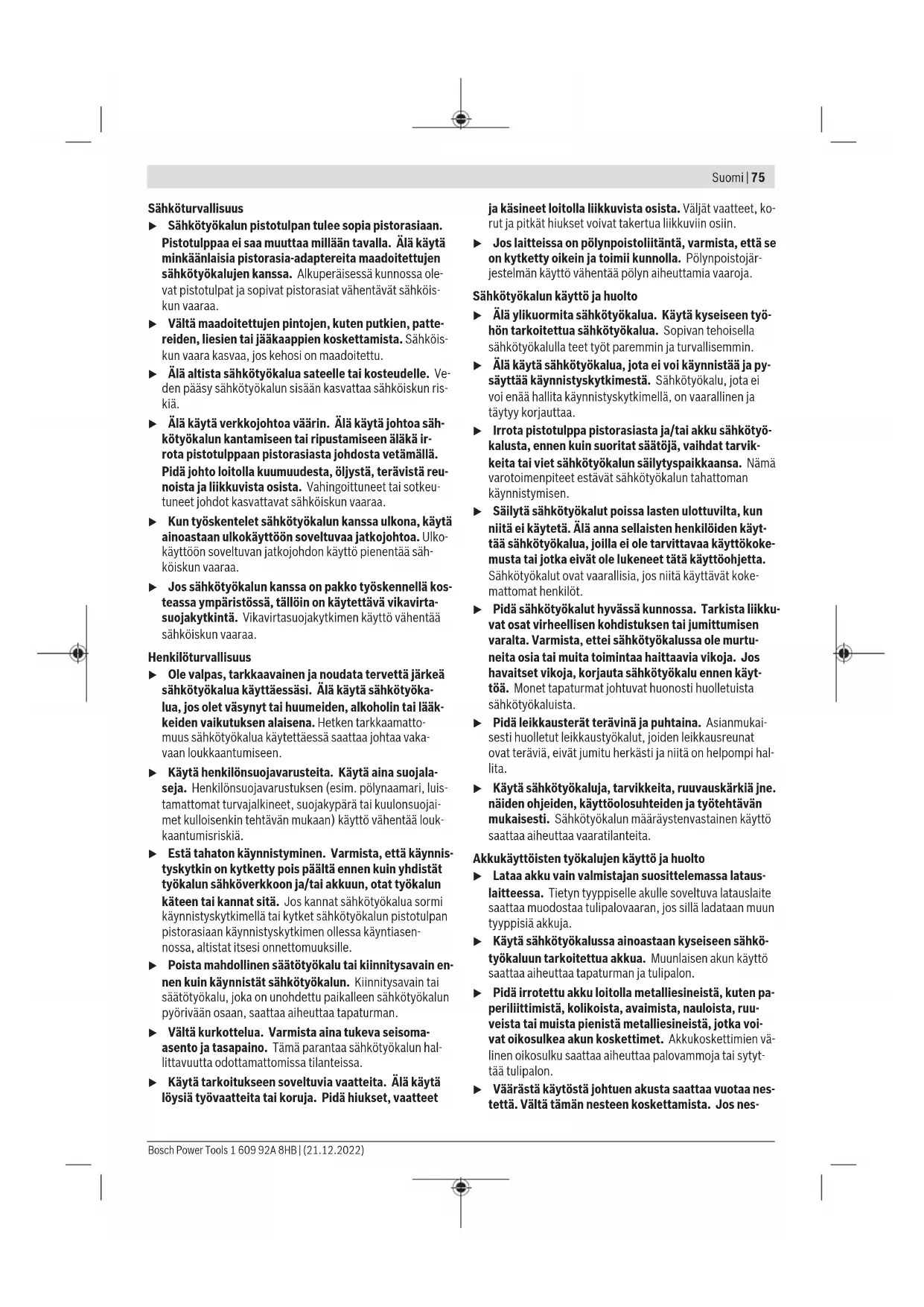 informasjonen fra produsenten av innsatsverktøyet. Dette må ikke være under det maksimale turtallet til elektroverktøyet. Støv-/sponavsuging Støv fra materialer som blyholdig maling, noen tresorter, mineraler og metall kan være helsefarlige. Berøring eller innånding av støv kan utløse allergiske reaksjoner og/eller åndedrettssykdommer hos brukeren eller personer som befinner seg i nærheten. Visse typer støv som eik- eller bøkstøv gjelder som kreftfremkallende, spesielt i kombinasjon med tilsetningsstoffer til trebearbeidelse (kromat, trebeskyttelsesmidler). Asbestholdig materiale må kun bearbeides av fagfolk. – Sørg for god ventilasjon av arbeidsplassen. – Det anbefales å bruke en støvmaske med filterklasse P2. Følg ditt lands gyldige forskrifter for de materialene som skal bearbeides. u Unngå støv på arbeidsplassen. Støv kan lett antennes. Bruk Igangsetting Slå på/av Når du skal bruke elektroverktøyet, skyver du utløserspaken (6) frem og trykker deretter av/på-bryteren (7) opp. For å slå av elektroverktøyet slipper du av/på-bryteren (7). Turtallsinnstilling (se bildeB) Med de to knappene for turtallsinnstilling(3) kan du stille inn nødvendig turtall også under arbeidet. Det nødvendige turtallet avhenger av emnet og arbeidsbetingelsene. Prøv deg frem for å finne frem til dette. Lysdioder [o/min] Lyser kontinuerlig 1 x hvitt 5000 Lyser kontinuerlig 2 x hvitt 7500 Lyser kontinuerlig 3 x hvitt 10000 Lyser kontinuerlig 4 x hvitt 12500 Lyser kontinuerlig 5 x hvitt 15000 u Det nominelle turtallet til tilbehøret må som minimum være likt maksimumsturtallet som er angitt på elektroverktøyet . Tilbehør som kjøres raskere enn det nominelle turtallet, kan gå i stykker og sprenges. LED-indikatorer (se bildeB) Tabellen nedenfor gir en forklaring til de mulige LED- indikatorene(2). Farge Tilstand Betydning/årsak Løsning Hvit Lyser kontinuerlig (1x...5x) Turtallsinnstilling (se „Turtallsinnstilling (se bildeB)“, Side73) Grønn Lyser kontinuerlig (2x...5x) Batteriet er ladet (se „Indikator for batteriladenivå“, Side72) Gul Lyser kontinuerlig (1x) Batteriet er nesten tomt (se „Indikator for batteriladenivå“, Side72) Skift eller lad batteriet snart Blinkende lys (5x) Kritisk temperatur er nådd (motor, elektronikk, batteri) La elektroverktøyet gå på tomgang og avkjøles Rød Lyser kontinuerlig (1x) Tomt batteri (se „Indikator for batteriladenivå“, Side72) Skift eller lad batteriet Blinkende lys (5x) Elektroverktøyet er overopphetet og slås av Avkjøl elektroverktøyet, og slå det på igjen Elektroverktøyet er blokkert og slås av Fjern blokkeringen, og slå på elektroverktøyet igjen Spindellåsen er aktivert, og elektroverktøyet slås av Deaktiver spindellåsen, og slå på elektroverktøyet igjen Bosch Power Tools 1 609 92A 8HB | (21.12.2022)74 | Suomi Konstantelektronikk Konstantelektronikken holder turtallet så å si konstant under tomgang og last og sikrer jevn effekt. Arbeidshenvisninger Beveg støttetallerkenen med skiven jevnt frem og tilbake med lett trykk for å oppnå et optimalt resultat. For stort trykk reduserer elektroverktøyets yteevne og fører til raskere slitasje på slipeskiven. u Oppbevar slipeverktøyet slik at det er beskyttet mot støt. Service og vedlikehold Vedlikehold og rengjøring u Ta alltid batteriet ut av elektroverktøyet før arbeider på elektroverktøyet utføres (f.eks. vedlikehold, verktøyskifte osv.) og før transport og oppbevaring. Det er fare for skader hvis du trykker på av/på-bryteren ved en feiltagelse. u Hold selve elektroverktøyet og ventilasjonsslissene alltid rene, for å kunne arbeide bra og sikkert. Kundeservice og kundeveiledning Kundeservice hjelper deg ved spørsmål om reparasjon og vedlikehold av produktet ditt og reservedelene. Du finner også sprengskisser og informasjon om reservedeler på www.bosch-pt.com Boschs kundeveilederteam hjelper deg gjerne hvis du har spørsmål om våre produkter og tilbehør. Ved alle forespørsler og reservedelsbestillinger må du oppgi det 10‑sifrede produktnummeret som er angitt på produktets typeskilt. Norsk Robert Bosch AS Postboks 350 1402 Ski Tel.: 64 87 89 50 Faks: 64 87 89 55 Du finner adresser til andre verksteder på: www.bosch-pt.com/serviceaddresses Transport De anbefalte li-ion-batteriene underligger kravene for farlig gods. Batteriene kan transporteres på veier av brukeren uten ytterligere krav. Ved forsendelse gjennom tredje personer (f.eks.: lufttransport eller spedisjon) må det oppfylles spesielle krav til emballasje og merking. Du må konsultere en ekspert for farlig gods ved forberedelse av forsendelsen. Send batterier kun hvis huset ikke er skadet. Lim igjen de åpne kontaktene og pakk batteriet slik at det ikke beveger seg i emballasjen. Ta også hensyn til videreførende nasjonale forskrifter. Deponering Elektroverktøy, batterier, tilbehør og emballasje må leveres inn til miljøvennlig gjenvinning. Elektroverktøy og batterier må ikke kastes i vanlig søppel! Bare for land i EU: Ifølge det europeiske direktivet 2012/19/EU om brukt elektrisk og elektronisk utstyr og gjennomføringen av dette i nasjonalt lovverk må elektroverktøy som ikke lenger kan brukes, og ifølge det europeiske direktivet 2006/66/EC må defekte eller brukte oppladbare batterier / engangsbatterier, sorteres og gjenvinnes på en miljøvennlig måte. Ikke-forskriftsmessig håndtering av elektrisk og elektronisk avfall kan føre til miljø- og helseskader på grunn av eventuelle farlige stoffer. (Oppladbare) batterier: Li-ion: Se informasjonen i avsnittet Transport (se „Transport“, Side74). Suomi Turvallisuusohjeet Sähkötyökalujen yleiset turvallisuusohjeet VAROITUS Lue kaikki turvallisuus- ja käyttö- ohjeet. Turvallisuus- ja käyttöohjei- den noudattamisen laiminlyönti saattaa johtaa sähköiskuun, tulipaloon ja/tai vakavaan loukkaantumiseen. Säilytä kaikki turvallisuus- ja käyttöohjeet tulevaa käyt- töä varten. Tu