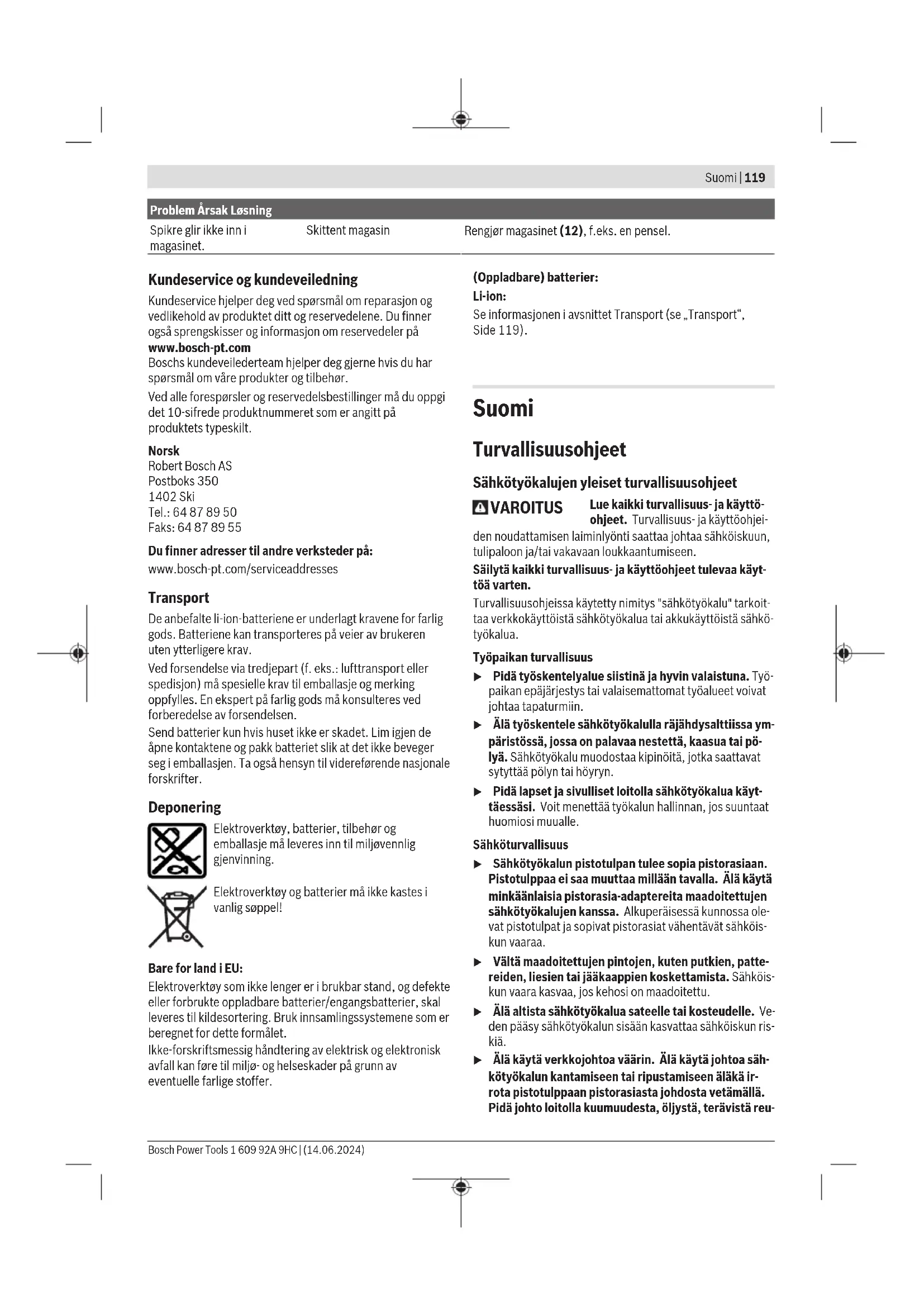 for oppgaven. For hardt underlag På betong med harde aggregater forsøker du å feste på et annet sted. Ellers bruker du alternative festemetoder som f.eks. plugger. Spikrene sitter ikke i stål. For tynt stålunderlag Bruk alternative festemetoder som f.eks. skruer. Spiker kommer ikke ut av kontaktelementet, eller kontaktelementet blir værende i inntrykt posisjon. Blokkering i kontaktelementet (f.eks. fremmedlegemer eller smuss) Fjern blokkeringen (se „Fjerne blokkering/tilbakestille“, Side116). For høy feilfrekvens For hardt underlag Bruk alternative festemetoder som f.eks. plugger. Slitt slagstempel Få reparert elektroverktøyet i et autorisert serviceverksted for Bosch elektroverktøy. 1 609 92A 9HC | (14.06.2024) Bosch Power ToolsSuomi | 119 Problem Årsak Løsning Spikre glir ikke inn i magasinet. Skittent magasin Rengjør magasinet(12), f.eks. en pensel. Kundeservice og kundeveiledning Kundeservice hjelper deg ved spørsmål om reparasjon og vedlikehold av produktet ditt og reservedelene. Du finner også sprengskisser og informasjon om reservedeler på www.bosch-pt.com Boschs kundeveilederteam hjelper deg gjerne hvis du har spørsmål om våre produkter og tilbehør. Ved alle forespørsler og reservedelsbestillinger må du oppgi det 10‑sifrede produktnummeret som er angitt på produktets typeskilt. Norsk Robert Bosch AS Postboks 350 1402 Ski Tel.: 64 87 89 50 Faks: 64 87 89 55 Du finner adresser til andre verksteder på: www.bosch-pt.com/serviceaddresses Transport De anbefalte li-ion-batteriene er underlagt kravene for farlig gods. Batteriene kan transporteres på veier av brukeren uten ytterligere krav. Ved forsendelse via tredjepart (f.eks.: lufttransport eller spedisjon) må spesielle krav til emballasje og merking oppfylles. En ekspert på farlig gods må konsulteres ved forberedelse av forsendelsen. Send batterier kun hvis huset ikke er skadet. Lim igjen de åpne kontaktene og pakk batteriet slik at det ikke beveger seg i emballasjen. Ta også hensyn til videreførende nasjonale forskrifter. Deponering Elektroverktøy, batterier, tilbehør og emballasje må leveres inn til miljøvennlig gjenvinning. Elektroverktøy og batterier må ikke kastes i vanlig søppel! Bare for land i EU: Elektroverktøy som ikke lenger er i brukbar stand, og defekte eller forbrukte oppladbare batterier/engangsbatterier, skal leveres til kildesortering. Bruk innsamlingssystemene som er beregnet for dette formålet. Ikke-forskriftsmessig håndtering av elektrisk og elektronisk avfall kan føre til miljø- og helseskader på grunn av eventuelle farlige stoffer. (Oppladbare) batterier: Li-ion: Se informasjonen i avsnittet Transport (se „Transport“, Side119). Suomi Turvallisuusohjeet Sähkötyökalujen yleiset turvallisuusohjeet VAROITUS Lue kaikki turvallisuus- ja käyttö- ohjeet. Turvallisuus- ja käyttöohjei- den noudattamisen laiminlyönti saattaa johtaa sähköiskuun, tulipaloon ja/tai vakavaan loukkaantumiseen. Säilytä kaikki turvallisuus- ja käyttöohjeet tulevaa käyt- töä varten. Turvallisuusohjeissa käytetty nimitys "sähkötyökalu" tarkoit- taa verkkokäyttöistä sähkötyökalua tai akkukäyttöistä sähkö- työkalua. Työpaikan turvallisuus u Pidä työskentelyalue siistinä ja hyvin valaistuna. Työ- paikan epäjärjestys tai valaisemattomat työalueet voivat johtaa tapaturmiin. u Älä työskentele sähkötyökalulla räjähdysalttiissa ym- päristössä, jossa on palavaa nestettä, kaasua tai pö- lyä. Sähkötyökalu muodostaa kipinöitä, jotka saattavat sytyttää pölyn tai höyryn. u Pidä lapset ja sivulliset loitolla sähkötyökalua käyt- täessäsi. Voit menettää työkalun hallinnan, jos suuntaat huomiosi muualle. Sähköturvallisuus u Sähkötyökalun pistotulpan tulee sopia pistorasiaan. Pistotulppaa ei saa muuttaa millään tavalla. Älä käytä minkäänlaisia pistorasia-adaptereita maadoitettujen sähkötyökalujen kanssa. Alkuperäisessä kunnossa ole- vat pistotulpat ja sopivat pistorasiat vähentävät sähköis- kun vaaraa. u Vältä maadoitettujen pintojen, kuten putkien, patte- reiden, liesien tai jääkaappien koskettamista. Sähköis- kun vaara kasvaa, jos kehosi on maadoitettu. u Älä altista sähkötyökalua sateelle tai kosteudelle. Ve- den pääsy sähkötyökalun sisään kasvattaa sähköiskun ris- kiä. u Älä käytä verkkojohtoa väärin. Älä käytä johtoa säh- kötyökalun kantamiseen tai ripustamiseen äläkä ir- rota pistotulppaan pistorasiasta johdosta vetämällä. Pidä johto loitolla kuumuudesta, öljystä, terävistä reu- Bosch Power Tools 1 609 92A 9HC | (14.06.2024)120 | Suomi noista ja liikkuvista osista. Vahingoittuneet tai sotkeu- tuneet johdot kasvattavat sähköiskun vaaraa. u Kun työskentelet sähkötyökalun kanssa ulkona, käytä ainoastaan ulkokäyttöön soveltuvaa jatkojohtoa. Ulko- käyttöön soveltuvan jatkojohdon käyttö pienentää säh- köiskun vaaraa. u Jos sähkötyökalun kanssa on pakko työskennellä kos- teassa ympäristössä, tällöin on käytettävä vikavirta- suojakytkintä. Vikavirtasuojakytkimen käyttö vähentää sähköiskun vaaraa. Henkilöturvallisuus u Ole valpas, tarkkaavainen ja noudata tervettä järkeä sähkötyökalua käyttäessäsi. Älä käytä sähkötyöka- lua, jos olet väsynyt tai huumeiden, alkoholin tai lääk- keiden vaikutuksen alaisena. Hetken tarkkaamatto- muus sähkötyökalua käytettäessä saattaa johtaa vaka- vaan loukkaantumiseen. u Käytä henkilönsuojavarusteita. Käytä aina suojala- seja. Henkilönsuojavarustuksen (esim. pölynaamari, luis- tamattomat turvajalkineet, suojakypärä tai kuulonsuojai- met kulloisenkin tehtävän mukaan) käyttö vähentää louk- kaantumisriskiä. u Estä tahaton käynnistyminen. Varmista, että käynnis- tyskytkin on kytketty pois päältä ennen kuin yhdistät työkalun sähköverkkoon ja/tai akkuun, otat työkalun käteen tai kannat sitä. Jos kannat sähkötyökalua sormi käynnistyskytkimellä tai kytk