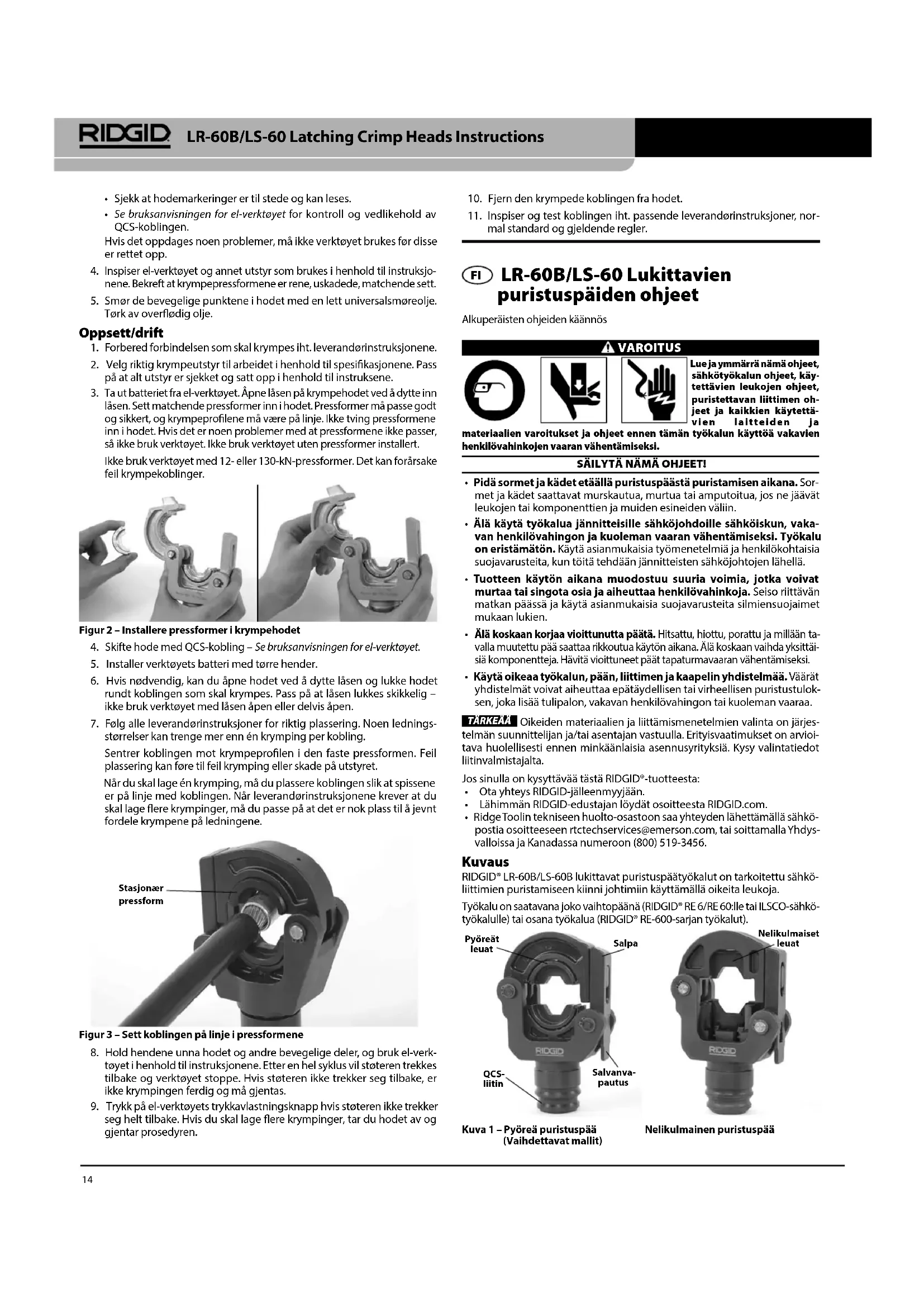 - Ridge Toolin tekniseen huolto-osastoon saa yhteyden lähettämällä sähkö- postia osoitteeseen rtctechservic es@emerson.com, tai soittamalla Yhdys- valloissa ja Kanadassa numeroon (800) 519-3456. Kuvaus RIDGID® LR-60B/LS-60B lukittavat puristuspäätyökalut on tarkoitettu sähkö- liittimien puristamiseen kiinni johtimiin käyttämällä oikeita leukoja. Työkalu on saatavana joko vaihtopäänä (RIDGID® RE 6/RE 60:lle tai ILSCO-sähkö- työkalulle) tai osana työkalua (RIDGID® RE-600-sarjan työkalut). Pyöreät leuatSalpaNelikulmaiset leuatQCS- liitinSalvanva-pautus Kuva 1 – Pyöreä puristuspää Nelikulmainen puristuspää (Vaihdettavat mallit)LR-60B/LS-60 Latching Crimp Heads Instructions