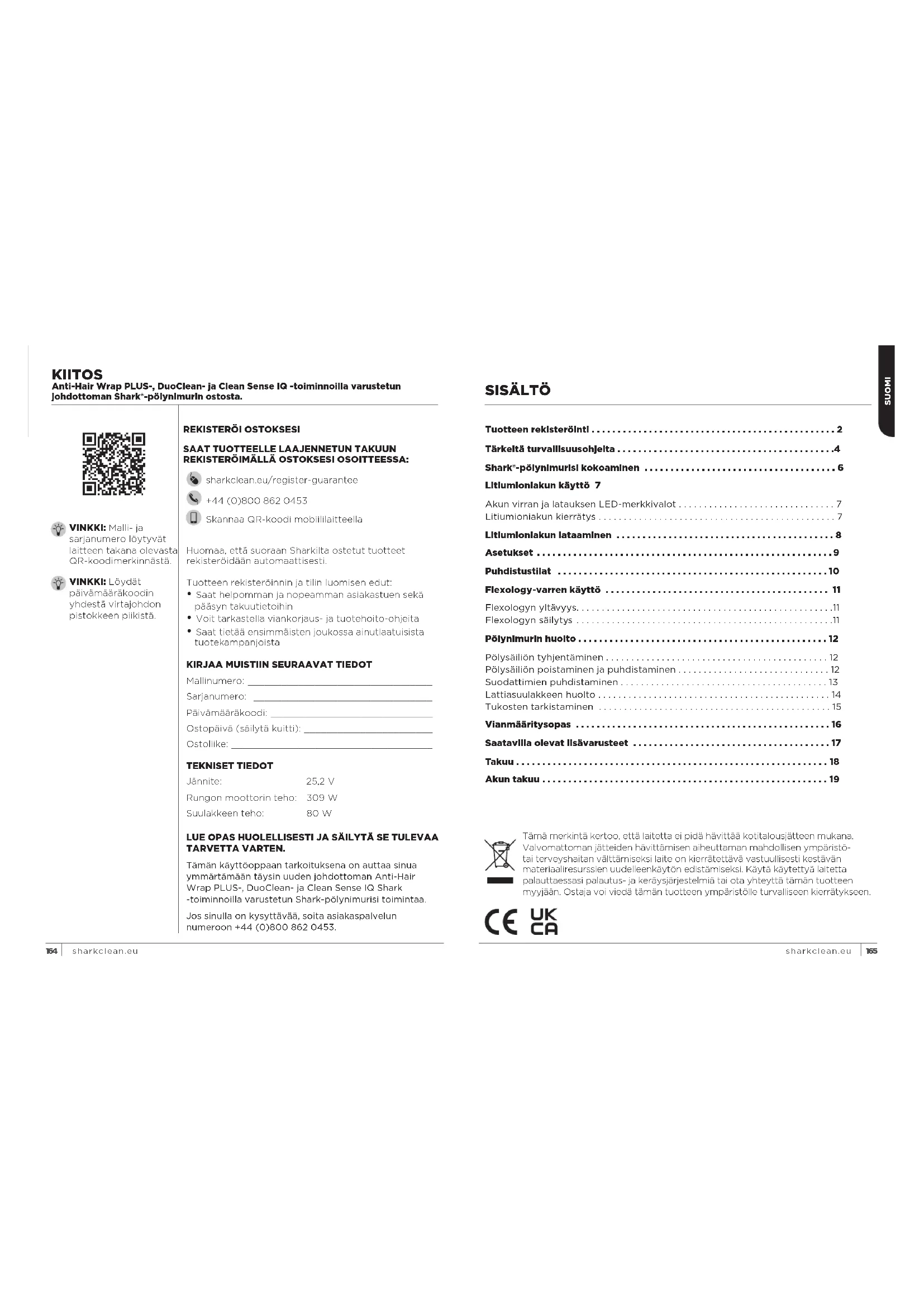 REKISTERÖIMÄLLÄ OSTOKSESI OSOITTEESSA: sharkclean.eu/register-guarantee +44 (0)800 862 0453 Skannaa QR-koodi mobiililaitteella KIITOS Anti-Hair Wrap PLUS-, DuoClean- ja Clean Sense IQ -toiminnoilla varustetun johdottoman Shark®-pölynimurin ostosta. LUE OPAS HUOLELLISESTI JA SÄILYTÄ SE TULEVAA TARVETTA VARTEN. Tämän käyttöoppaan tarkoituksena on auttaa sinua ymmärtämään täysin uuden johdottoman Anti-Hair Wrap PLUS-, DuoClean- ja Clean Sense IQ Shark -toiminnoilla varustetun Shark-pölynimurisi toimintaa Jos sinulla on kysyttävää, soita asiakaspalvelun numeroon +44 (0)800 862 0453 Tuotteen rekisteröinnin ja tilin luomisen edut:
