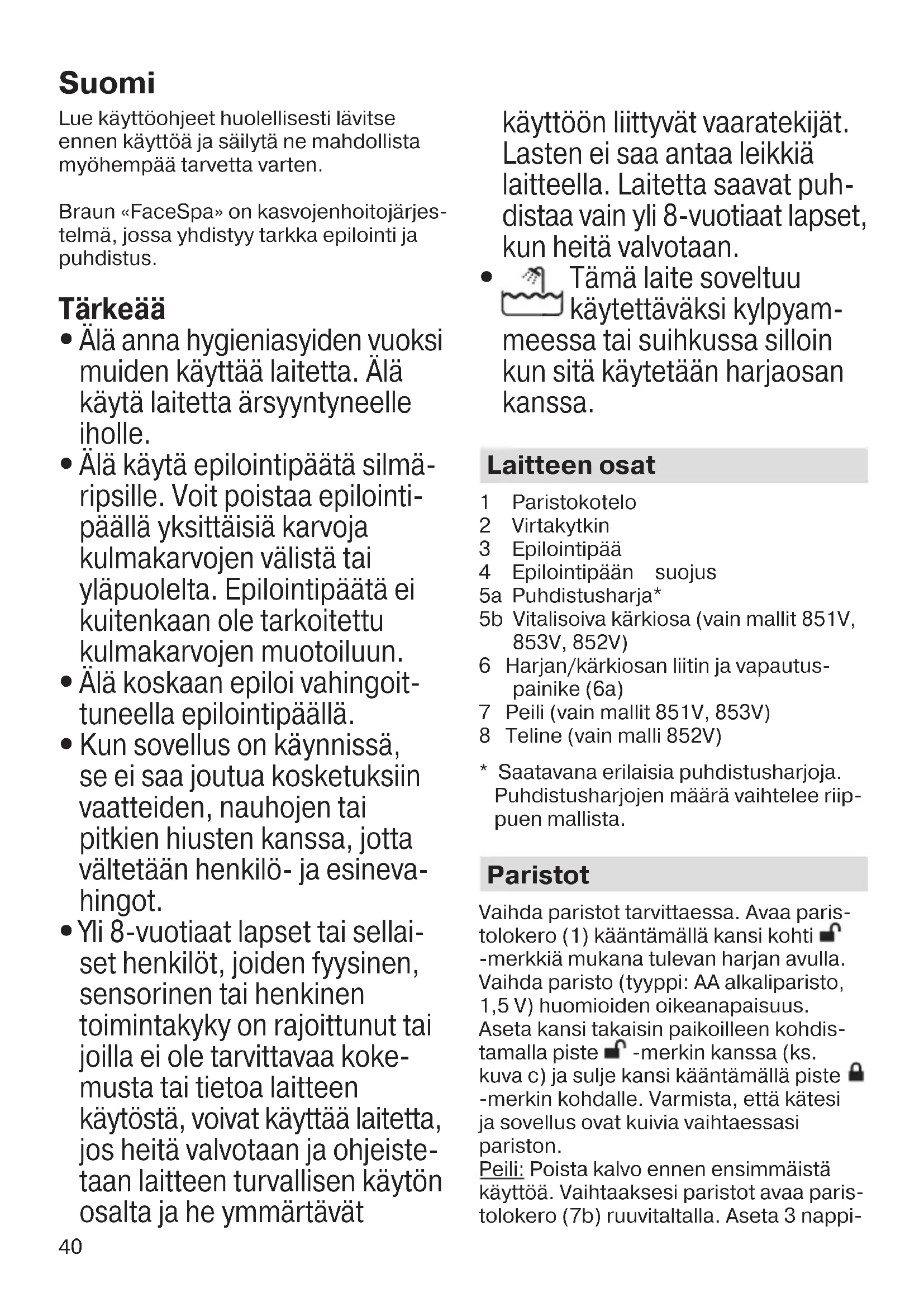 - Vitalisoiva kärkiosa hieroo myös inten- siivisesti tuoden esiin ihon heleyden. Ohjaa harjaa/kärkiosaa iholla helläva- raisesti, pyörivin liikkein. Vältä silmien aluetta ja hiusrajaa. Huuhtele harja/kärkiosa (5a/5b) käytön jälkeen lämpimällä vedellä. Voit irrottaa harjan/kärkiosayksikön painamalla vapautuspainiketta (6a). Anna osien kui- vua täysin ennen kuin kokoat laitteen uudelleen. Parhaan tuloksen saamiseksi, vaihda harja/kärkiosa (5a/b) kolmen kuukauden välein. Erilaisia vaihto-osia (viitenro 80 Face) on saatavilla laitteen myyneeltä jäl- leenmyyjältä, Braun-huoltoliikkeistä tai osoitteesta www.braun.com. Ympäristönsuojeluun liittyviä seikkoja Tuote sisältää pattereita ja/tai kierrätettävää sähköjätettä. Suojellaksesi ympäristöä älä hävitä talousjätteen mukana, vaan vie maassasi oleviin sähköjätteen keräyspisteisiin. Oikeudet muutoksiin pidätetään. Takuu Tälle tuotteelle myönnämme 2 vuoden takuun ostopäivästä lukien Suomessa voimassa olevien alan takuuehtojen TE90 mukaan. Takuuaikana korvataan veloituksetta kaikki viat, jotka aiheutuvat materiaaliviasta tai valmistusvirheestä. Korvaus tapahtuu harkintamme mukaan korjaamalla, vaihtamalla viallinen osa tai vaihtamalla koko laite uuteen. Takuu on voimassa kaikkialla maailmassa sillä edellytyksellä, että laitetta myydään ko. maassa Braunin tai virallisen maahantuo- jan toimesta. Takuun piiriin eivät kuulu seuraavat viat: viat, jotka johtuvat virheellisestä käytö- stä, normaalista kulumisesta tai viat, jolla on vähäinen merkitys laitteen arvoon tai toimintaan. Takuun voimassaolo lakkaa, jos laitetta korjataan muualla kuin valtuu- tetussa Braun-huoltoliikkeessä tai jos laitteessa käytetään muita kuin alkupe- räisiä varaosia. Yksilöity ostokuitti riittää takuun voimas- saolon osoittamiseksi: www.service.braun.com. Lisätietoa takuuseen liittyvistä asioista saa asiakaspalvelukeskuksestamme numerosta 020-377 877. 90846664_Velvet_Face_851-853_EMEA_S4-98.indd 4290846664_Velvet_Face_851-853_EMEA_S4-98.indd 42 25.04.16 11:3025.04.16 11:30 CSS APPROVED Effective Date 22Aug2016 GMT - Printed 27Sep2016 Page 42 of 9843 Polski Przed rozpoczęciem korzystania z urzą- dzenia dokładnie zapoznaj się z instrukcją obsługi i zachowaj ją do wykorzystania w przyszłości. Braun «FaceSpa» jest systemem do pie- lęgnacji twarzy, który łączy dwa zabiegi kosmetyczne, precyzyjną depilację z oczyszczaniem. Uwaga