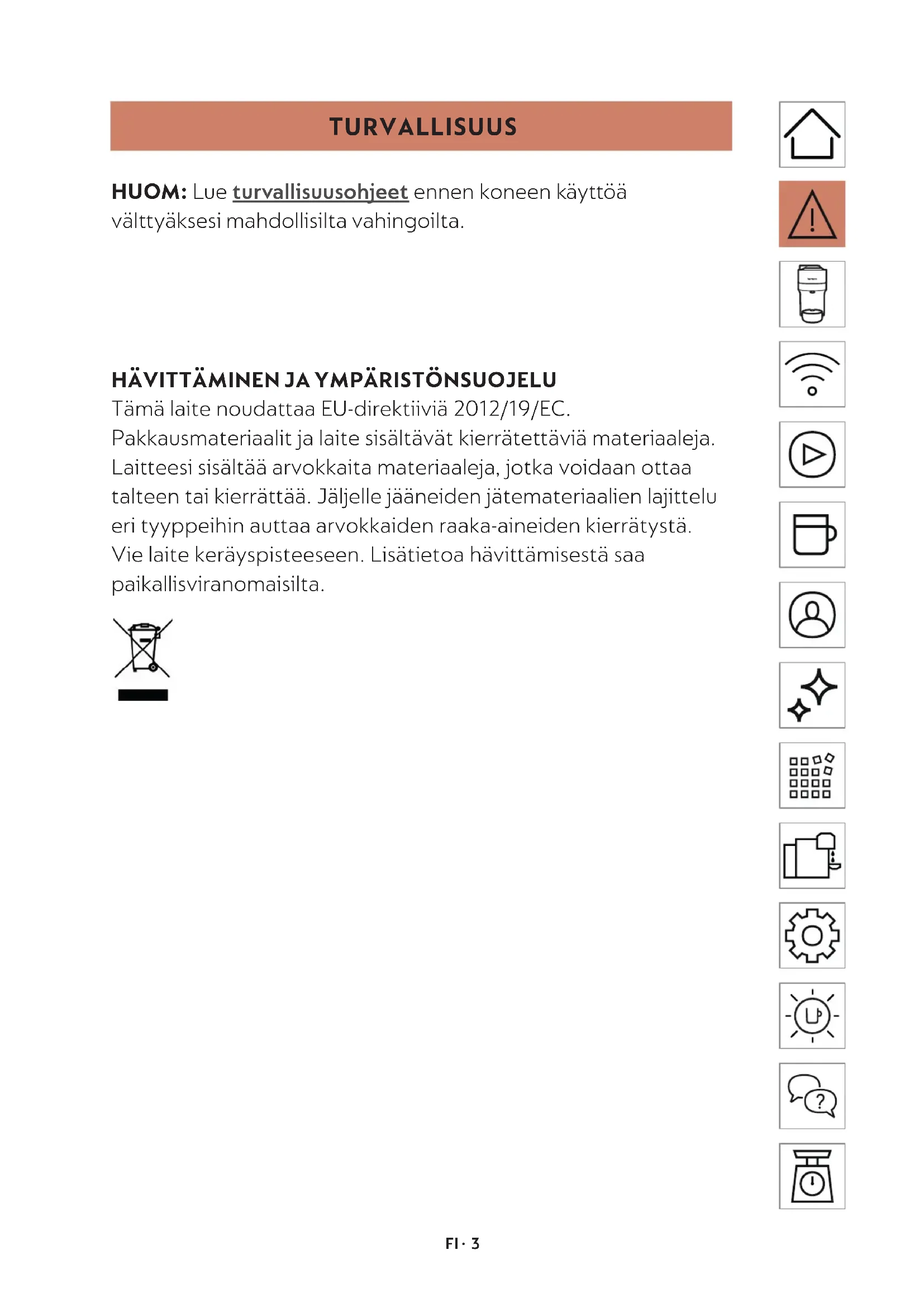 TURVALLISUUS HUOM: Lue turvallisuusohjeet ennen koneen käyöä välyäksesi mahdollisilta vahingoilta. HÄVITTÄMINEN JA YMPÄRISTÖNSUOJELU Tämä laite noudaaa EU-direktiiviä 2012/19/EC. Pakkausmateriaalit ja laite sisältävät kierräteäviä materiaaleja. Laieesi sisältää arvokkaita materiaaleja, jotka voidaan oaa talteen tai kierräää. Jäljelle jääneiden jätemateriaalien lajielu eri tyyppeihin auaa arvokkaiden raaka-aineiden kierrätystä. Vie laite keräyspisteeseen. Lisätietoa häviämisestä saa paikallisviranomaisilta.FI