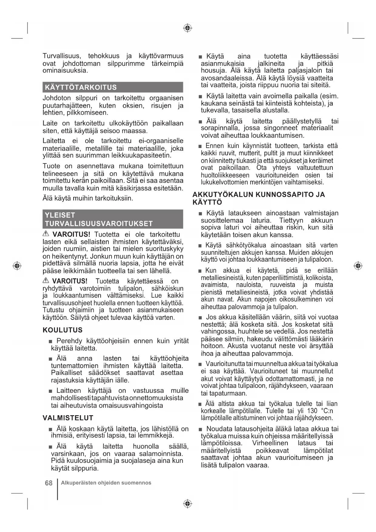 Alkuperäisten ohjeiden suomennosHUOLTO ■ Huollata työkone pätevällä huoltomiehellä, joka käyttää ainoastaan asianmukaisia varaosia. Tämä varmistaa, että sähkötyökalu on turvallinen. ■ Vaurioituneita akkuja ei koskaan saa huoltaa. Akkuja saa huoltaa vain valmistaja tai valtuutettu huoltoliike. JOHDOTTOMAN SILPPURIN TURVALLISUUSVAROITUKSET ■ Kun valmistelet laitetta käyttöä varten, varmista, että laite seisoo tukevasti paikallaan eikä vaaraa kaatumisesta ole. Jos laitteesta katkaistaan virta liian aikaisessa vaiheessa, jäljellä olevat materiaali voi tukkia teräkokoonpanon ja pysäyttää moottorin, kun laitteeseen seuraavan kerran kytketään virta. ■ Ennen kuin aloitat laitteen käytön, tarkista, että kerääjä on tyhjä. ■ Pidä kasvosi ja vartalosi kaukana ottoaukosta. ■ Älä päästä käsiä, muita ruumiinosia tai vaatteita pyörivien syöttökammioon, poistoaukkoon tai liikkuvien osien lähelle. ■ Seiso aina tukevasti. Pysyttele tukevasti jaloillasi äläkä kurkota käsivartta liian kauas. Älä kurkota liian pitkälle. Kun syötät materiaalia laitteeseen, älä koskaan seiso sen pohjaa korkeammalla tasolla. Kävele, älä koskaan juokse. ■ Pysyttele aina turvallisen matkan päässä sivussa purkualueelta, kun käytät laitetta. ■ Kun syötät laitteeseen materiaalia, varo, ettei mukana mene metallipaloja, kiviä, pulloja, tölkkejä tai muita vierasesineitä. ■ Jos leikkurimekanismi osuu vierasesineisiin tai laitteesta alkaa kuulua outoa ääntä tai se tärisee oudosti, sammuta laite ja anna leikkureiden pysähtyä kokonaan. Irrota akku laitteesta. Suorita seuraavat vaiheet: ● Tutki laite vaurioiden varalta. ● Tarkista laite ja kiristä mahdollisesti löysällä olevat osat. ● vaihda tai korjaa kaikki vioittuneet osat ■ Älä anna käsitellyn materiaalin kerääntyä poistokuiluun; tämä voi estää asianmukaisen tyhjentymisen tai aiheuttaa tukoksen ja saada materiaalia sinkoamaan ulos syöttöaukosta. ■ Jos laite tukkeutuu, sammuta se ja anna leikkureiden pysähtyä kokonaan. Irrota akku ennen roskien poistamista. ■ Älä koskaan käytä tuotetta, jos suojukset, luukut, keräin tai muut suojalaitteet ovat viallisia, poissa paikoiltaan tai epäkunnossa. ■ Älä siirrä tai kuljeta laitetta sen ollessa käynnissä. ■ Katkaise virta ja irrota akku. Varmista, että kaikki liikkuvat osat ovat pysähtyneet täysin: ● ennen laitteen luota poistumista ● ennen tukoksen poistamista ● ennen tuotteen tarkastusta, puhdistusta ja huoltoa ■ Älä kallista laitetta sen ollessa käynnissä. ■ Laitteen pitkittynyt käyttö voi aiheuttaa tai vaikeuttaa vammoja. Jos käytät laitetta jatkuvasti pitkään, muista pitää työssä säännöllisiä taukoja. ■ Älä muunna laitetta millään tavoin tai käytä osia tai lisävarusteita, jotka eivät ole valmistajan suosittelemia. Se voi lisätä riskiä vakavasta henkilövahingosta. ■ Varmista aina, että ilmanvaihtoaukot ovat roskista puhtaat. Moottori voi ylikuumentua, mikä taas voi vaurioittaa laitetta tai lisätä tulipalon vaaraa. ■ Sammuta tuote ennen keräimen asennusta ja irrottamista. ■ Katkaise laitteesta virta välittömästi onnettomuuden tai toimintahäiriön sattuessa. Älä käytä laitetta ennen kuin se on perusteellisesti tutkittu valtuutetussa huoltoliikkeessä. SILPPUAMISOPAS Noudata alla olevan taulukon ohjeita taataksesi parhaat silppuamistulokset. MATERIAALI SILPPUAMISTAPA Enintään 40 mm:n paksuiset oksat. Leikkaa kaikki sivukasvut pois leikkureilla ennen kuin syötät materiaalin syöttösuppiloon. Taimet, rikkaruohot ja pensaat Napauta maa ja kivet irti juurista, jotta terät eivät vioitu. SUOMI