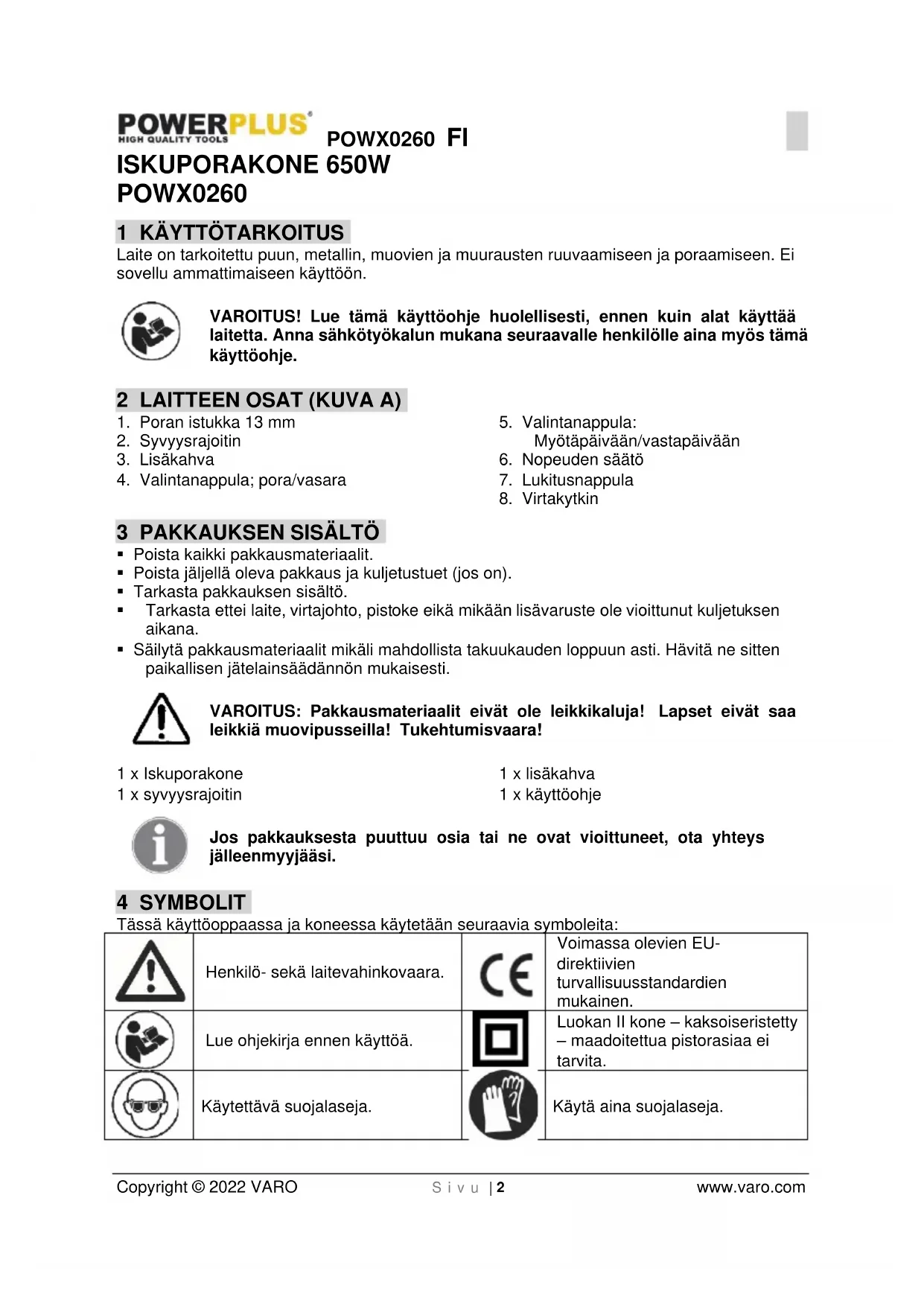 - Käytä vain alkuperäisiä varaosiaPOWX0260 FI Copyright © 2022 VARO S i v u | 5 www.varo.com