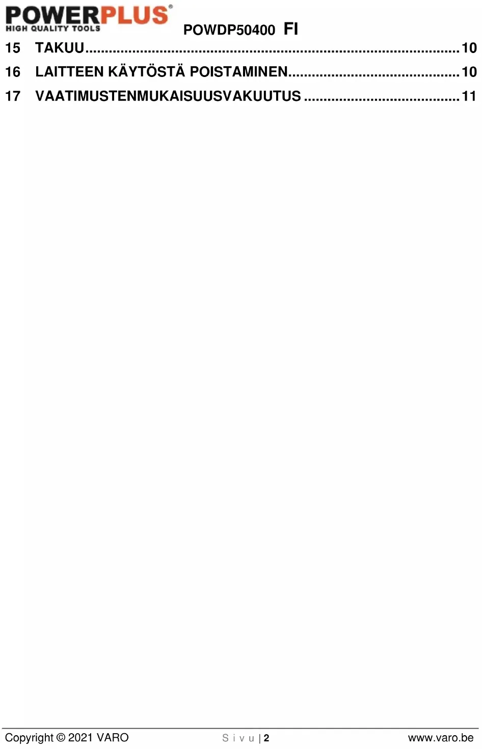 - Jos joudut poistamaan laitteen käytöstä pitkäaikaisen käytön jälkeen, älä hävitä sitä tavallisen kotitalousjätteen mukana, vaan huolehdi sen hävittämisestä ympäristöä suojaavalla tavalla. Sähkölaitteiden tuottamia jätteitä ei saa käsitellä samalla tavalla kuin tavallisia kotitalousjätteitä. Hoida niiden kierrätys asianmukaisessa jätteen käsittelylaitoksessa. Kysy neuvoa talteenotosta ja romutuksesta paikalliselta viranomaiselta tai jälleenmyyjältä.POWDP50400 FI Copyright © 2021 VARO S i v u | 11 www.varo.be 17 VAATIMUSTENMUKAISUUSVAKUUTUS VARO – Vic. Van Rompuy N.V. - Joseph Van Instraat 9 - BE2500 Lier - BELGIA ilmoittaa, että Tuote: Epäkeskohiomakone 20 V – Akkukäyttöinen Tavaramerkki: PowerPlus Malli: POWDP50400 on yhdenmukaistettuihin eurooppalaisiin standardien soveltamiseen perustuvien sovellettavien eurooppalaisten direktiivien olennaisten vaatimusten ja muiden asiaankuuluvien säännösten mukainen. Laitteen luvaton muokkaaminen johtaa tämän vakuutuksen mitätöitymiseen. Euroopan yhteisön direktiivit (sekä niiden mahdolliset muutokset allekirjoituspäivään saakka): 2011/65/EU 2006/42/EC 2014/30/EU Eurooppalaiset yhdenmukaistetut standardit (sekä niiden mahdolliset muutokset allekirjoituspäivään saakka): EN62841-1 : 2015 EN62841-2-4 : 2014 EN55014-1 : 2017 EN55014-2 : 2015 Teknisten asiakirjojen haltija: Philippe Vankerkhove, VARO – Vic Van Rompuy N.V. Allekirjoittanut toimii yrityksen toimitusjohtajan puolesta, Ludo Mertens Sertifiointijohtaja 11/06/2021, Lier - BelgiumPOWDP50400 EL Copyright © 2021 VARO Σ ε λ ί δ α | 1 www.varo.be 1 ΕΦΑΡΜΟΓΗ p. 3