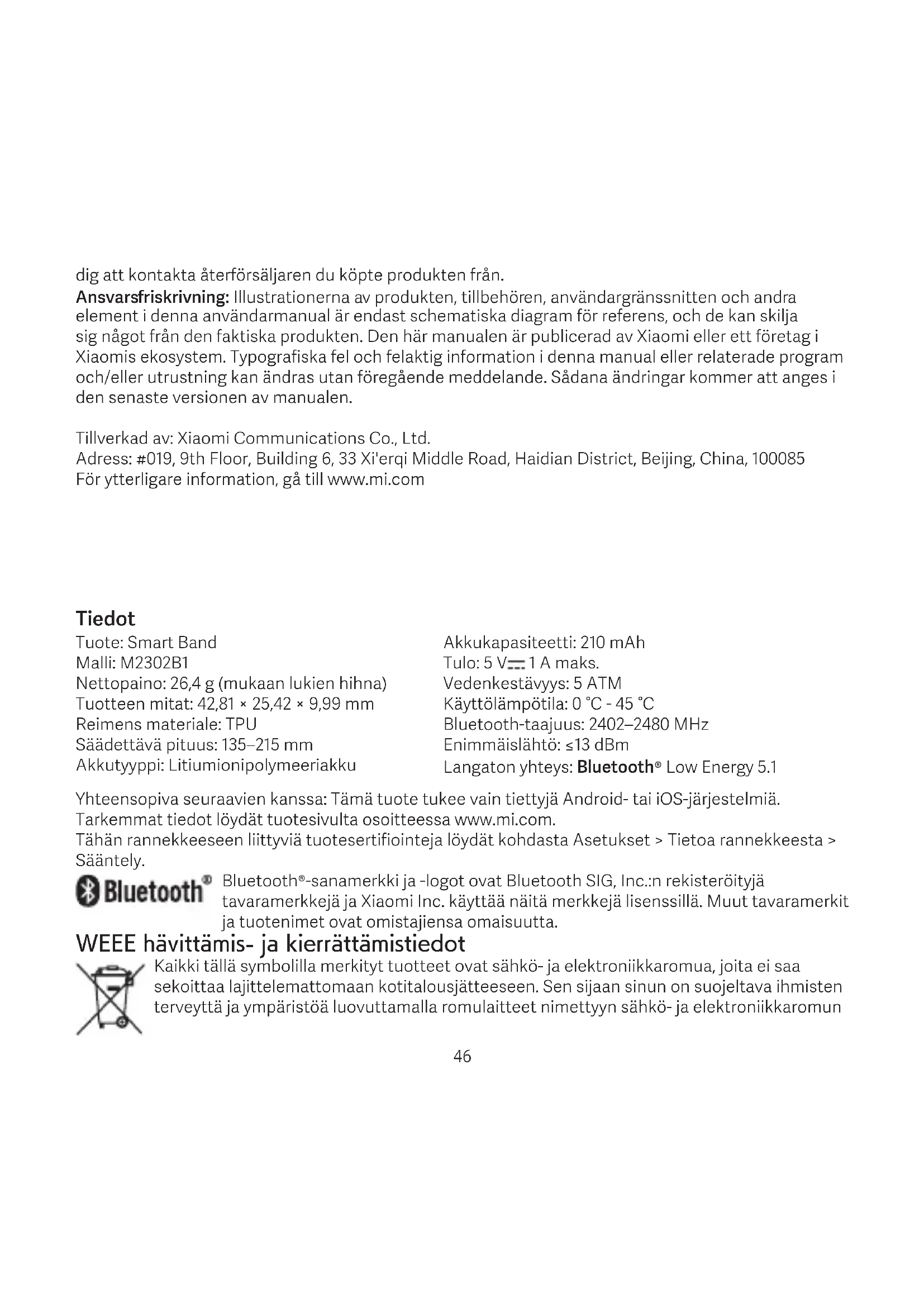 - Akun altistaminen erittäin matalalle ilmanpaineelle voi johtaa räjähdykseen tai syttyvän nesteen tai kaasun vuotamiseen. Takuutiedot Xiaomin käyttäjänä hyödyt tietyissä olosuhteissa lisätakuista. Xiaomi tarjoaa tiettyjä kuluttajatakuuetuja, jotka ovat olemassa kansallisen kuluttajalain tarjoamien lainmukaisten takuiden lisäksi, ei niiden sijaan. Vastaavissa paikallisissa laeissa määrätään lainmukaisiin takuisiin liittyvä kesto ja ehdot. Katso lisätietoja kuluttajatakuueduista Xiaomin virallisella verkkosivustolla https://www. mi.com/en/service/warranty/. Ellei laissa kielletä tai Xiaomi muutoin lupaa, jälkimarkkinointipalvelut rajoittuvat alkuperäisen oston maahan tai alueeseen. Xiaomi korjaa, vaihtaa tai korvaa tuotteesi lain sallimassa laajuudessa kuluttajatakuun nojalla. Normaali kuluminen, ylivoimainen este, väärinkäyttö tai käyttäjän huolimattomuudesta tai viasta johtuvat vahingot eivät kuulut takuuseen. Jälkimarkkinointipalvelun yhteyshenkilö voi olla kuka tahansa Xiaomin valtuutetussa huoltoverkossa oleva henkilö, Xiaomin valtuutetut jakelijat tai lopullinen myyjä, joka myi tuotteet sinulle. Jos olet epävarma, ota yhteyttä asianmukaiseen Xiaomin nimeämään henkilöön. Nykyiset takuut eivät päde Hongkongissa ja Taiwanissa. Tuotteet, joita ei ole tuotu maahan asianmukaisesti ja/tai joita Xiaomi ei ole valmistanut asianmukaisesti ja/tai joita ei ole hankittu asianmukaisesti Xiaomilta tai Xiaomin virallisilta myyjiltä, eivät kuulu tämän takuun piiriin. Sovellettavan lain mukaan saatat hyötyä tuotteen myyneen epävirallisen jälleenmyyjän takuista. Siksi Xiaomi kehottaa sinua ottamaan yhteyttä jälleenmyyjään, jolta ostit tuotteen. Huomautus: Tuotteen, lisätarvikkeiden ja käyttöliittymän kuvat käyttöohjeessa ovat vain viitteellisiä. Todellinen tuote ja toiminnot Vastuuvapautuslauseke: Tuotteen, lisävarusteiden, käyttöliittymien ja muiden elementtien kuvat tässä käyttöoppaassa ovat vain viitteellisiä kaavioesityksiä ja saattavat poiketa hieman varsinaisesta tuotteesta. Tämän käsikirjan julkaisija on Xiaomi tai Xiaomin ekosysteemiin kuuluva yritys. Tämän käsikirjan tai siihen liittyvien ohjelmien ja/tai laitteiden kirjoitusvirheet ja epätarkat tiedot saattavat muuttua ilman ennakkoilmoitusta. Tällaiset muutokset merkitään käsikirjan uusimpaan versioon.voivat vaihdella tuoteparannusten takia. Valmistaja: Xiaomi Communications Co., Ltd. Osoite: #019, 9th Floor, Building 6, 33 Xi'erqi Middle Road, Haidian District, Beijing, China, 100085 Lisätietoja löydät osoitteesta www.mi.com 48Kompatibel med: Dette produktet støtter kun visse Android- eller iOS-systemer. For detaljert informasjon, sjekk produktsiden på www.mi.com. For produktsertifiseringer relatert til dette båndet, gå til Innstillinger > Om båndet > Juridisk. Bluetooth®-ordmerket og logoer er registrerte varemerker som eies av Bluetooth SIG, Inc. og all bruk av slike merker av Xiaomi Inc. er under lisens. Andre varemerker og varenavn tilhører sine respektive eiere. Informasjon om avhending og resirkulering av WEEE Alle produkter som bærer dette symbolet er elektrisk og elektronisk avfall som ikke skal blandes med usortert husholdningsavfall. I stedet bør du beskytte menneskers helse og miljø ved å overlevere e-avfallet til et utpekt innsamlingssted for resirkulering av elektrisk og elektronisk utstyr, oppnevnt av myndighetene eller lokale myndigheter. Riktig avhending og resirkulering vil bidra til å forhindre potensielle negative konsekvenser for miljøet og menneskers helse. Ta kontakt med installatøren eller lokale myndigheter for mer informasjon om stedet samt vilkår og betingelser for slike innsamlingspunkter. EU-samsvarserklæring Herved erklærer Xiaomi Communications Co., Ltd. at radioutstyrstypen M2302B1 er i samsvar med direktiv 2014/53/EU. Den fullstendige teksten i EUs samsvarserklæring er tilgjengelig på følgende Internett-adresse: http://www.mi.com/global/service/support/ declaration.html Forholdsregler