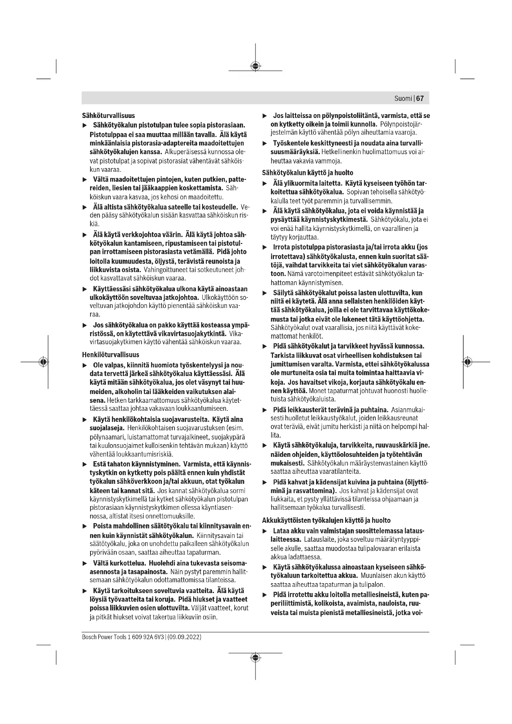 6mm 2–20 8mm 10–40 10mm 20–60 12mm 30–80 – Still inn slagkraften på det høyeste trinnet. – Legg inn et passende stiftbånd(14). – Klikk spissene til papirhefteren/avstandsholderen(13) på plass i utsparingene for papirhefter(11) på elektroverktøyet. Merk at bare utsparing 1 passer for hefting av papir. – Legg papirbunken i papirhefteren/ avstandsholderen(13), og plasser spissen på stiftepistolen over papirområdet som skal heftes. – Trykk elektroverktøyet hardt ned til spissen på stiftepistolen(1) er trykt helt inn. – Oppretthold presstrykket, og trykk på utløseren(2). – Etter at stiftene er trykt helt inn, slipper du utløseren(2) og løfter spissen på stiftepistolen(1) opp fra papirbunken. Stifting med jevn avstand til materialkanten (sebildeC1−C2) Merknad: Avstandsholderen(13) må klikkes på plass i utsparingene(10) på elektroverktøyet for stifting med jevn avstand. Utsparing 2–7(10) Avstand Utsparing 2 1cm Utsparing 3 3cm Utsparing 4 5cm Utsparing 5 7cm Utsparing 6 9cm Utsparing 7 11cm – Legg inn et passende stiftbånd(14) eller spikerbånd(15). – Klikk spissene til papirhefteren/avstandsholderen(13) på plass i en utsparing(10) på elektroverktøyet som gir en passende avstand til materialkanten. Merk at utsparing 1 ikke passer for stifting med jevn avstand. – Trykk den fleksible undersiden til papirhefteren/ avstandsholderen(13) mot elektroverktøyet til den klikker på plass. Bosch Power Tools 1 609 92A 6V3 | (09.09.2022)66 | Suomi – Før elektroverktøyet flatt over emnet til emnekanten ligger inntil forkanten på papirhefteren/ avstandsholderen(13). – Trykk elektroverktøyet hardt ned til spissen på stiftepistolen(1) er trykt helt inn. – Oppretthold presstrykket, og trykk på utløseren(2). – Etter at stiftene/spikeren er trykt helt inn, slipper du utløseren(2), og skyver spissen på stiftepistolen(1) langs emnekanten. – Plasser den neste stiften eller spikeren. Service og vedlikehold Vedlikehold og rengjøring u Ta alltid batteriet ut av elektroverktøyet før arbeider på elektroverktøyet utføres (f.eks. vedlikehold, verktøyskifte osv.) og før transport og oppbevaring. Det er fare for skader hvis du trykker på av/på-bryteren ved en feiltagelse. u Hold selve elektroverktøyet og ventilasjonsslissene alltid rene, for å kunne arbeide bra og sikkert. Kundeservice og kundeveiledning Kundeservice hjelper deg ved spørsmål om reparasjon og vedlikehold av produktet ditt og reservedelene. Du finner også sprengskisser og informasjon om reservedeler på www.bosch-pt.com Boschs kundeveilederteam hjelper deg gjerne hvis du har spørsmål om våre produkter og tilbehør. Ved alle forespørsler og reservedelsbestillinger må du oppgi det 10‑sifrede produktnummeret som er angitt på produktets typeskilt. Norsk Robert Bosch AS Postboks 350 1402 Ski Tel.: 64 87 89 50 Faks: 64 87 89 55 Du finner adresser til andre verksteder på: www.bosch-pt.com/serviceaddresses Transport De anbefalte li-ion-batteriene underligger kravene for farlig gods. Batteriene kan transporteres på veier av brukeren uten ytterligere krav. Ved forsendelse gjennom tredje personer (f.eks.: lufttransport eller spedisjon) må det oppfylles spesielle krav til emballasje og merking. Du må konsultere en ekspert for farlig gods ved forberedelse av forsendelsen. Send batterier kun hvis huset ikke er skadet. Lim igjen de åpne kontaktene og pakk batteriet slik at det ikke beveger seg i emballasjen. Ta også hensyn til videreførende nasjonale forskrifter. Deponering Elektroverktøy, batterier, tilbehør og emballasje må leveres inn til miljøvennlig gjenvinning. Elektroverktøy og batterier må ikke kastes i vanlig søppel! Bare for land i EU: Ifølge det europeiske direktivet 2012/19/EU om brukt elektrisk og elektronisk utstyr og gjennomføringen av dette i nasjonalt lovverk må elektroverktøy som ikke lenger kan brukes, og ifølge det europeiske direktivet 2006/66/EC må defekte eller brukte oppladbare batterier / engangsbatterier, sorteres og gjenvinnes på en miljøvennlig måte. Ikke-forskriftsmessig håndtering av elektrisk og elektronisk avfall kan føre til miljø- og helseskader på grunn av eventuelle farlige stoffer. (Oppladbare) batterier: Li-ion: Se informasjonen i avsnittet Transport (se „Transport“, Side66). Suomi Turvallisuusohjeet Yleiset sähkötyökalujen turvaohjeet VAROITUS Lue kaikki tämän sähkötyökalun mukana toimitetut varoitukset, oh- jeet, kuvat ja tekniset tiedot. Alla mainittujen ohjeiden noudattamisen laiminlyönti saattaa aiheuttaa sähköiskun, tu- lipalon ja/tai vakavan loukkaantumisen. Säilytä kaikki turvallisuusohjeet ja muut ohjeet tulevai- suutta varten. Turvallisuusohjeissa käytetty käsite "sähkötyökalu" käsittää verkkokäyttöisiä sähkötyökaluja (verkkojohdolla) ja akku- käyttöisiä sähkötyökaluja (ilman verkkojohtoa). Työpaikan turvallisuus u Pidä työskentelyalue puhtaana ja hyvin valaistuna. Työpaikan epäjärjestys tai valaisemattomat työalueet voi- vat johtaa tapaturmiin. u Älä työskentele sähkötyökalulla räjähdysalttiissa ym- päristössä, jossa on palavaa nestettä, kaasua tai pö- lyä. Sähkötyökalu muodostaa kipinöitä, jotka saattavat sytyttää pölyn tai höyryn. u Pidä lapset ja sivulliset loitolla sähkötyökalua käyt- täessäsi. Voit menettää laitteen hallinnan, jos suuntaat huomiosi muualle. 1 609 92A 6V3 | (09.09.2022) Bosch Power ToolsSuomi | 67 Sähköturvallisuus u Sähkötyökalun pistotulpan tulee sopia pistorasiaan. Pistotulppaa ei saa muuttaa millään tavalla. Älä käytä minkäänlaisia pistorasia-adaptereita maadoitettujen sähkötyökalujen kanssa. Alkuperäisessä kunnossa ole- vat pistotulpat ja sopivat pistorasiat vähentävät sähköis- kun vaaraa. u Vältä maadoitettujen pintojen, kuten putkien, patte- reiden, liesien tai jääkaappien koskettamista. Säh- köiskun vaara kasvaa, jos kehosi on maadoitettu. u Älä altista sähkötyökalua s