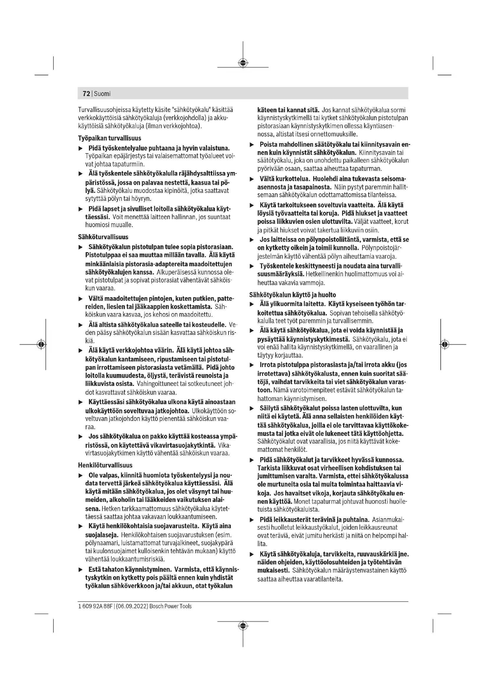 Ta av firkantede slipeplaten(12). Spesialslipeplater Du kan skifte ut den medfølgende slipeplaten (10) med en spesialslipeplate som kan fås som tilbehør. Spesialslipeplaten monteres på samme måte som slipeplaten som følger med. Slipebladet tas av og settes på på samme måte som ved skifte av det originale slipebladet. Bruk av spesialslipeplatene er kun tillatt med montert bakre slipeplate(11). Lamellslipeforsats (se bilde H) Med lamellslipeforsatsen (18) er det mulig å slipe på vanskelig tilgjengelige steder, for eksempel lameller på skap, vinduer eller dører. Slipetunge, flat (se bilde I) Den flate slipetungen (20) gjør det mulig å slipe smale slisser og trange mellomrom. Slipebladet for slipetungen(19) monteres som det fremre slipebladet(17). Slipetunge, oval (se bilde I) Den ovale slipetungen (21) gjør det mulig å slipe avrundinger og hule gjenstander eller flater som er buet innover, for eksempel på møbler, gelendre eller radiatorer. Slipebladet for slipetungen(19) monteres som det fremre slipebladet(17). Bruk Igangsetting Inn-/utkobling u Kontroller at du kan trykke på av/på-bryteren uten å slippe håndtaket. For å slå på elektroverktøyet vipper du av/på-bryteren (2) mot høyre til stillingen "I". For å slå av elektroverktøyet vipper du av/på-bryteren (2) mot høyre til stillingen "O". Temperaturavhengig overbelastningsvern Ved forskriftsmessig bruk kan ikke elektroverktøyet overbelastes. Ved for stor belastning eller overskridelse av tillatt batteritemperatur slår elektronikken elektroverktøyet av helt til det igjen har optimal driftstemperatur. Forhåndsinnstilling av oscillasjonshastighet Med hjulet for innstilling av oscillasjonshastigheten (1) kan du stille inn nødvendig oscillasjonshastighet også under drift. Nødvendig oscillasjonshastighet avhenger av materialet og arbeidsbetingelsene og kan bestemmes gjennom praktiske forsøk. 1 609 92A 88F | (06.09.2022) Bosch Power ToolsSuomi | 71 Arbeidshenvisninger u Ta alltid batteriet ut av elektroverktøyet før arbeider på elektroverktøyet utføres (f.eks. vedlikehold, verktøyskifte osv.) og før transport og oppbevaring. Det er fare for skader hvis du trykker på av/på-bryteren ved en feiltagelse. u Vent til elektroverktøyet er stanset helt før du legger det fra deg. Bruk lavt turtall ved polering, slik at for sterk oppvarming av overflaten unngås. Materialfjerningskapasiteten ved sliping avhenger i stor grad av hvilket slipeblad og hvilken oscillasjonshastighet (1) som brukes. Bare feilfrie slipeblad gir gode sliperesultater og skåner elektroverktøyet. Slipebladene varer lenger hvis du passer på at presstrykket er jevnt. Hvis det brukes svært høyt presstrykk, fører det til større slitasje på elektroverktøyet og slipebladet, og ikke til at slipekapasiteten blir større. For nøyaktig sliping av hjørner, kanter og vanskelig tilgjengelige steder kan du også bruke bare spissen eller en kant på slipeplaten. Bruk ikke et slipeblad som har blitt brukt til bearbeiding av metall, på andre materialer. Bruk bare originalt Bosch-slipetilbehør. Service og vedlikehold Vedlikehold og rengjøring u Ta alltid batteriet ut av elektroverktøyet før arbeider på elektroverktøyet utføres (f.eks. vedlikehold, verktøyskifte osv.) og før transport og oppbevaring. Det er fare for skader hvis du trykker på av/på-bryteren ved en feiltagelse. u Hold selve elektroverktøyet og ventilasjonsslissene alltid rene, for å kunne arbeide bra og sikkert. Kundeservice og kundeveiledning Kundeservice hjelper deg ved spørsmål om reparasjon og vedlikehold av produktet ditt og reservedelene. Du finner også sprengskisser og informasjon om reservedeler på www.bosch-pt.com Boschs kundeveilederteam hjelper deg gjerne hvis du har spørsmål om våre produkter og tilbehør. Ved alle forespørsler og reservedelsbestillinger må du oppgi det 10‑sifrede produktnummeret som er angitt på produktets typeskilt. Norsk Robert Bosch AS Postboks 350 1402 Ski Tel.: 64 87 89 50 Faks: 64 87 89 55 Du finner adresser til andre verksteder på: www.bosch-pt.com/serviceaddresses Transport De anbefalte li-ion-batteriene underligger kravene for farlig gods. Batteriene kan transporteres på veier av brukeren uten ytterligere krav. Ved forsendelse gjennom tredje personer (f.eks.: lufttransport eller spedisjon) må det oppfylles spesielle krav til emballasje og merking. Du må konsultere en ekspert for farlig gods ved forberedelse av forsendelsen. Send batterier kun hvis huset ikke er skadet. Lim igjen de åpne kontaktene og pakk batteriet slik at det ikke beveger seg i emballasjen. Ta også hensyn til videreførende nasjonale forskrifter. Deponering Elektroverktøy, batterier, tilbehør og emballasje må leveres inn til miljøvennlig gjenvinning. Elektroverktøy og batterier må ikke kastes i vanlig søppel! Bare for land i EU: Ifølge det europeiske direktivet 2012/19/EU om brukt elektrisk og elektronisk utstyr og gjennomføringen av dette i nasjonalt lovverk må elektroverktøy som ikke lenger kan brukes, og ifølge det europeiske direktivet 2006/66/EC må defekte eller brukte oppladbare batterier / engangsbatterier, sorteres og gjenvinnes på en miljøvennlig måte. Ikke-forskriftsmessig håndtering av elektrisk og elektronisk avfall kan føre til miljø- og helseskader på grunn av eventuelle farlige stoffer. (Oppladbare) batterier: Li-ion: Se informasjonen i avsnittet Transport (se „Transport“, Side71). Suomi Turvallisuusohjeet Yleiset sähkötyökalujen turvaohjeet VAROITUS Lue kaikki tämän sähkötyökalun mukana toimitetut varoitukset, oh- jeet, kuvat ja tekniset tiedot. Alla mainittujen ohjeiden noudattamisen laiminlyönti saattaa aiheuttaa sähköiskun, tu- lipalon ja/tai vakavan loukkaantumisen. Säilytä kaikki turvallisuusohjeet ja muut ohjeet tulevai- suutta varten. Bosch Power Tools 1 609 92A 88F | (06.09.2022)72 | Suomi Turvallisuusohjeissa käytetty käsite "sähkötyökalu" käsittää verkkokäyttöisiä s