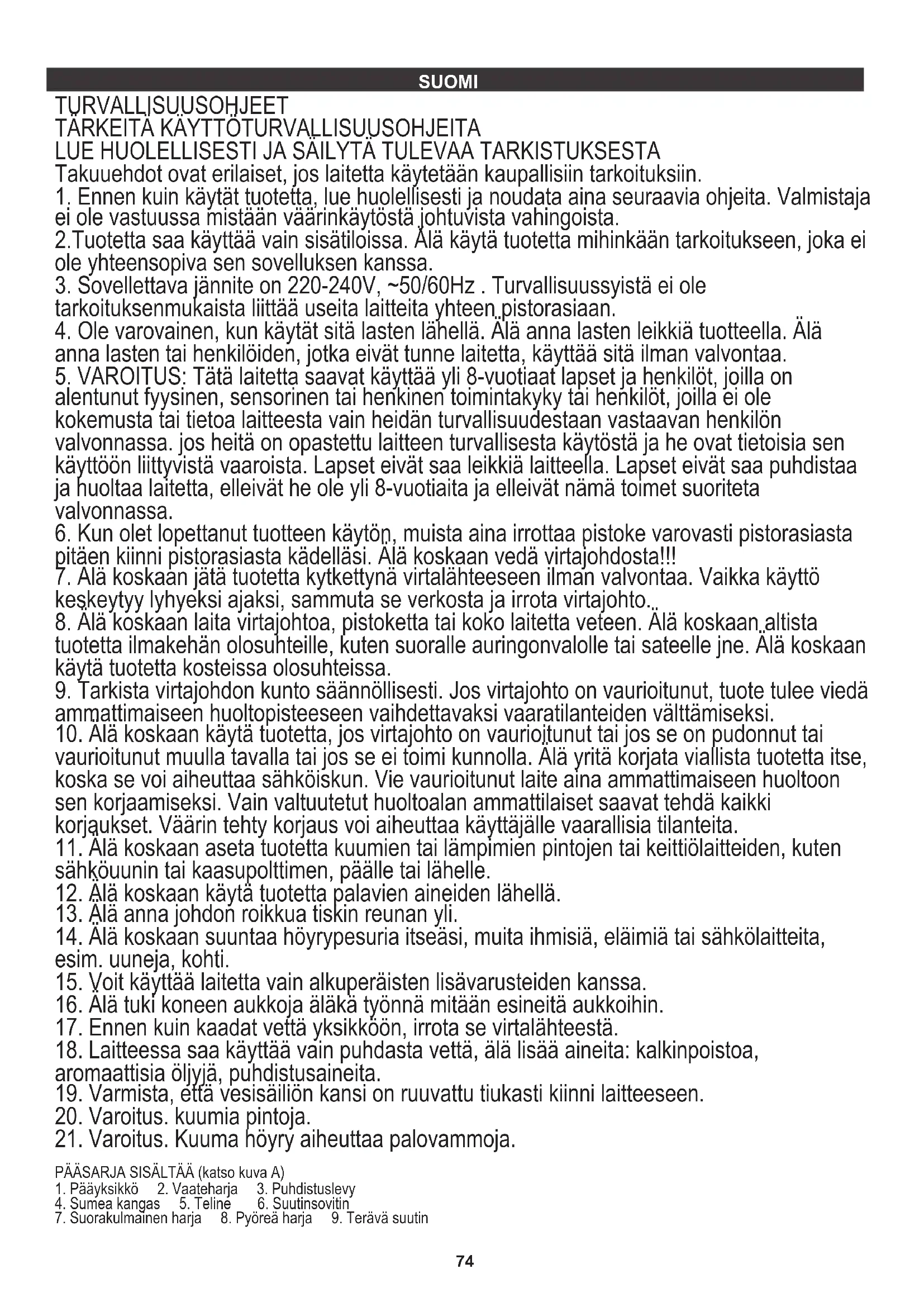 14. Älä koskaan suuntaa höyrypesuria itseäsi, muita ihmisiä, eläimiä tai sähkölaitteita,