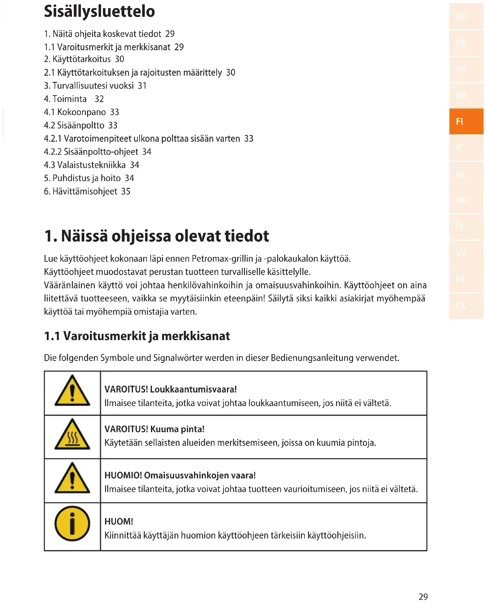 Lue käyttöohjeet kokonaan läpi ennen Petromax-grillin ja -palokaukalon käyttöä. Käyttöohjeet muodostavat perustan tuotteen turvalliselle käsittelylle. Vääränlainen käyttö voi johtaa henkilövahinkoihin ja omaisuusvahinkoihin. Käyttöohjeet on aina liitettävä tuotteeseen, vaikka se myytäisiinkin eteenpäin! Säilytä siksi kaikki asiakirjat myöhempää käyttöä tai myöhempiä omistajia varten.