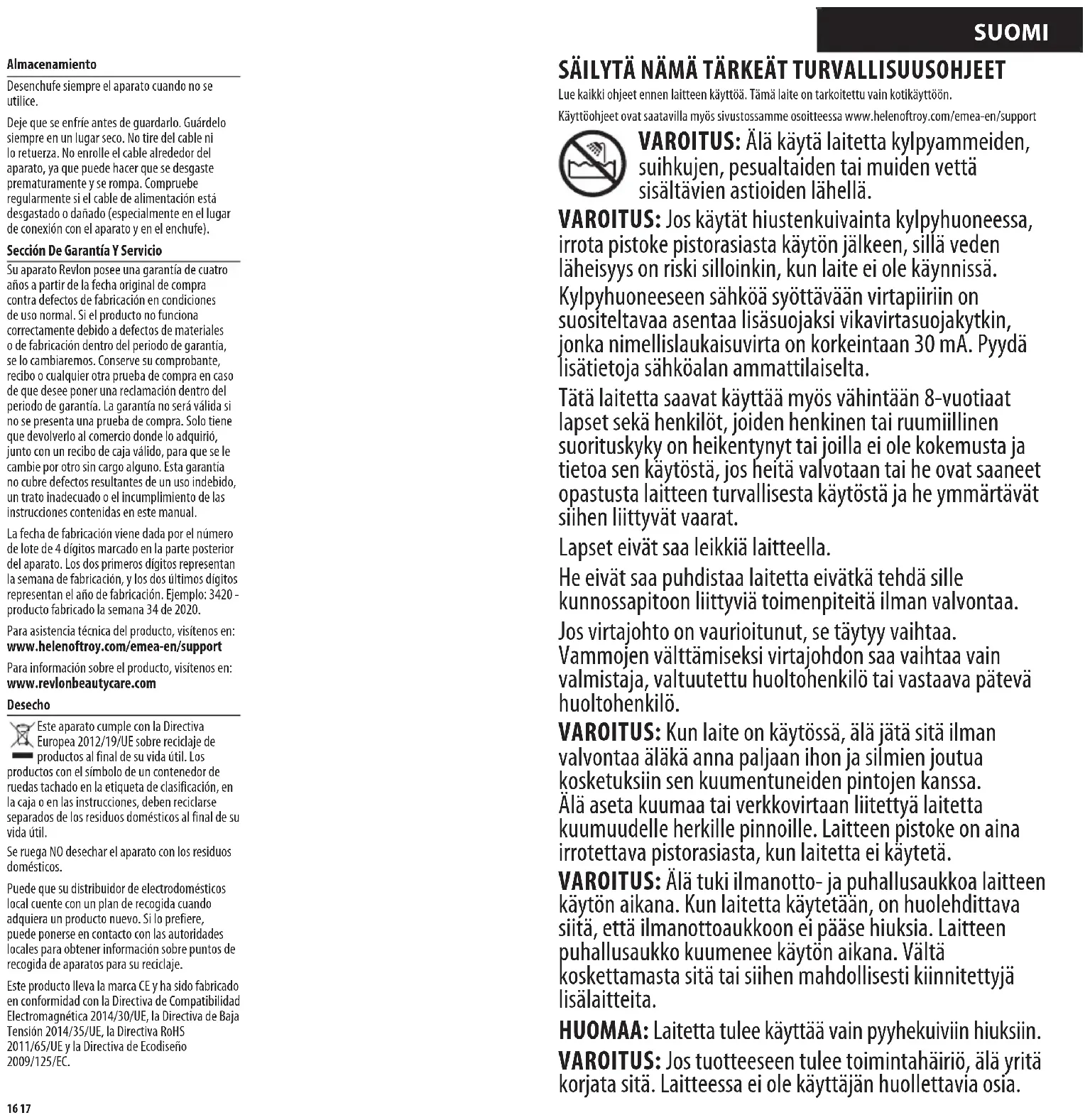 - Para volver a colocarlo, siga el procedimiento anterior pero a la inversa. La apariencia de este aparato puede diferir de la ilustración. Limpieza Desconecte siempre el aparato de la corriente después de su uso y deje que se enfríe antes de limpiarlo. Limpie la superficie exterior con un paño ligeramente humedecido y séquelo después. Puede eliminar el polvo y la pelusa de las aberturas de entrada de aire con un cepillo pequeño o un aspirador con un accesorio de cepillo.16 17 Almacenamiento Desenchufe siempre el aparato cuando no se utilice. Deje que se enfríe antes de guardarlo. Guárdelo siempre en un lugar seco. No tire del cable ni lo retuerza. No enrolle el cable alrededor del aparato, ya que puede hacer que se desgaste prematuramente y se rompa. Compruebe regularmente si el cable de alimentación está desgastado o dañado (especialmente en el lugar de conexión con el aparato y en el enchufe). Sección De Garantía Y Servicio Su aparato Revlon posee una garantía de cuatro años a partir de la fecha original de compra contra defectos de fabricación en condiciones de uso normal. Si el producto no funciona correctamente debido a defectos de materiales o de fabricación dentro del periodo de garantía, se lo cambiaremos. Conserve su comprobante, recibo o cualquier otra prueba de compra en caso de que desee poner una reclamación dentro del periodo de garantía. La garantía no será válida si no se presenta una prueba de compra. Solo tiene que devolverlo al comercio donde lo adquirió, junto con un recibo de caja válido, para que se le cambie por otro sin cargo alguno. Esta garantía no cubre defectos resultantes de un uso indebido, un trato inadecuado o el incumplimiento de las instrucciones contenidas en este manual. La fecha de fabricación viene dada por el número de lote de 4 dígitos marcado en la parte posterior del aparato. Los dos primeros dígitos representan la semana de fabricación, y los dos últimos dígitos representan el año de fabricación. Ejemplo: 3420 - producto fabricado la semana 34 de 2020. Para asistencia técnica del producto, visítenos en: www.helenoftroy.com/emea-en/support Para información sobre el producto, visítenos en: www.revlonbeautycare.com Desecho Este aparato cumple con la Directiva Europea 2012/19/UE sobre reciclaje de productos al final de su vida útil. Los productos con el símbolo de un contenedor de ruedas tachado en la etiqueta de clasificación, en la caja o en las instrucciones, deben reciclarse separados de los residuos domésticos al final de su vida útil. Se ruega NO desechar el aparato con los residuos domésticos. Puede que su distribuidor de electrodomésticos local cuente con un plan de recogida cuando adquiera un producto nuevo. Si lo prefiere, puede ponerse en contacto con las autoridades locales para obtener información sobre puntos de recogida de aparatos para su reciclaje. Este producto lleva la marca CE y ha sido fabricado en conformidad con la Directiva de Compatibilidad Electromagnética 2014/30/UE, la Directiva de Baja Tensión 2014/35/UE, la Directiva RoHS 2011/65/UE y la Directiva de Ecodiseño 2009/125/EC. SÄILYTÄ NÄMÄ TÄRKEÄT TURVALLISUUSOHJEET Lue kaikki ohjeet ennen laitteen käyttöä. Tämä laite on tarkoitettu vain kotikäyttöön. Käyttöohjeet ovat saatavilla myös sivustossamme osoitteessa www.helenoftroy.com/emea-en/support VAROITUS: Älä käytä laitetta kylpyammeiden, suihkujen, pesualtaiden tai muiden vettä sisältävien astioiden lähellä. VAROITUS: Jos käytät hiustenkuivainta kylpyhuoneessa, irrota pistoke pistorasiasta käytön jälkeen, sillä veden läheisyys on riski silloinkin, kun laite ei ole käynnissä. Kylpyhuoneeseen sähköä syöttävään virtapiiriin on suositeltavaa asentaa lisäsuojaksi vikavirtasuojakytkin, jonka nimellislaukaisuvirta on korkeintaan 30 mA. Pyydä lisätietoja sähköalan ammattilaiselta. Tätä laitetta saavat käyttää myös vähintään 8-vuotiaat lapset sekä henkilöt, joiden henkinen tai ruumiillinen suorituskyky on heikentynyt tai joilla ei ole kokemusta ja tietoa sen käytöstä, jos heitä valvotaan tai he ovat saaneet opastusta laitteen turvallisesta käytöstä ja he ymmärtävät siihen liittyvät vaarat. Lapset eivät saa leikkiä laitteella. He eivät saa puhdistaa laitetta eivätkä tehdä sille kunnossapitoon liittyviä toimenpiteitä ilman valvontaa. Jos virtajohto on vaurioitunut, se täytyy vaihtaa. Vammojen välttämiseksi virtajohdon saa vaihtaa vain valmistaja, valtuutettu huoltohenkilö tai vastaava pätevä huoltohenkilö. VAROITUS: Kun laite on käytössä, älä jätä sitä ilman valvontaa äläkä anna paljaan ihon ja silmien joutua kosketuksiin sen kuumentuneiden pintojen kanssa. Älä aseta kuumaa tai verkkovirtaan liitettyä laitetta kuumuudelle herkille pinnoille. Laitteen pistoke on aina irrotettava pistorasiasta, kun laitetta ei käytetä. VAROITUS: Älä tuki ilmanotto- ja puhallusaukkoa laitteen käytön aikana. Kun laitetta käytetään, on huolehdittava siitä, että ilmanottoaukkoon ei pääse hiuksia. Laitteen puhallusaukko kuumenee käytön aikana. Vältä koskettamasta sitä tai siihen mahdollisesti kiinnitettyjä lisälaitteita. HUOMAA: Laitetta tulee käyttää vain pyyhekuiviin hiuksiin. VAROITUS: Jos tuotteeseen tulee toimintahäiriö, älä yritä korjata sitä. Laitteessa ei ole käyttäjän huollettavia osia. SUOMI18 19 SUOMI Pyöreä muotoiluharja Vallankumouksellisella Salon One-Step -muotoiluharjalla voit kuivata ja muotoilla hiuksesi yhdellä kertaa. Pyöreä harja ja keraaminen pinnoite luovat tuuheutta tyviin ja kauniit, pehmeät kiharat ja laineet nopeasti lähes kaikenpituisiin hiuksiin. Ylikuumenemiskatkaisin Laitteessa on termostaatti, joka kytkee sen POIS PÄÄLTÄ (0), jos kuivaimen lämpötila ylittää optimaalisen kuivaustason osittain tukkeutuneista ilmanotto- tai puhallusaukoista johtuen. Jos laite lakkaa toimimasta, sammuta se (0) ja anna sen jäähtyä. Kun laite jäähtyy