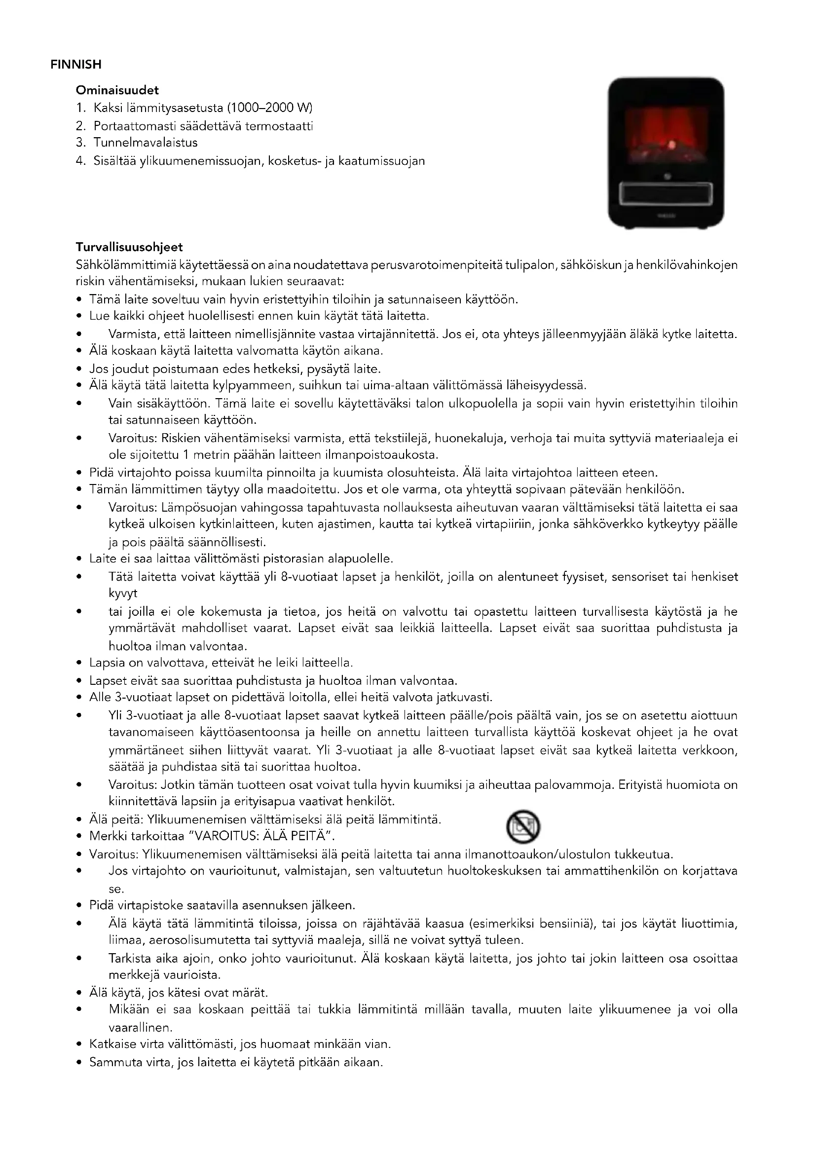 - Älä käytä tätä lämmitintä tiloissa, joissa on räjähtävää kaasua (esimerkiksi bensiiniä), tai jos käytät liuottimia, liimaa, aerosolisumutetta tai syttyviä maaleja, sillä ne voivat syttyä tuleen.