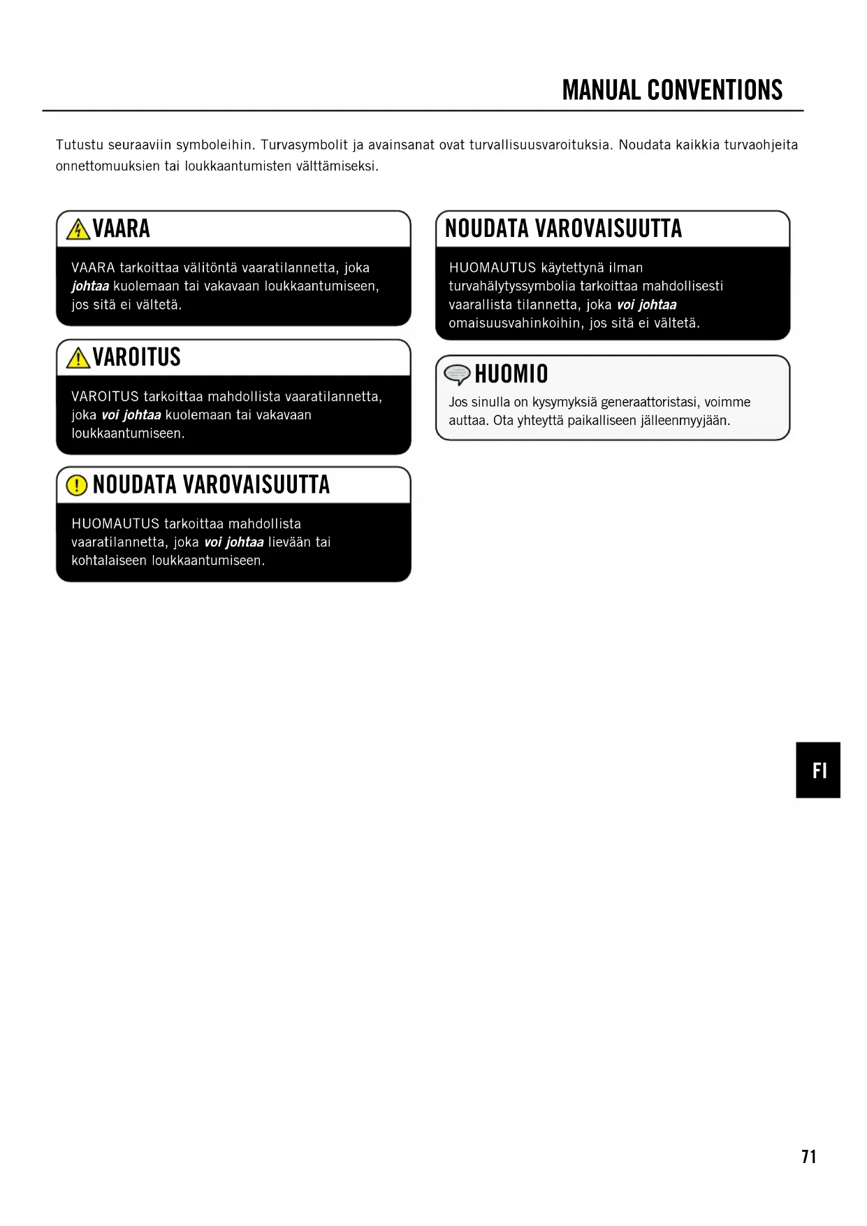 Tutustu seuraaviin symboleihin. Turvasymbolit ja avainsanat ovat turvallisuusvaroituksia. Noudata kaikkia turvaohjeita onnettomuuksien tai loukkaantumisten välttämiseksi. MANUAL CONVENTIONS HUOMAUTUS tarkoittaa mahdollista vaaratilannetta, joka voi johtaa lievään tai kohtalaiseen loukkaantumiseen. NOUDATA VAROVAISUUTTA HUOMAUTUS käytettynä ilman turvahälytyssymbolia tarkoittaa mahdollisesti vaarallista tilannetta, joka voi johtaa omaisuusvahinkoihin, jos sitä ei vältetä. NOUDATA VAROVAISUUTTA VAARA tarkoittaa välitöntä vaaratilannetta, joka johtaa kuolemaan tai vakavaan loukkaantumiseen, jos sitä ei vältetä. VAARA VAROITUS tarkoittaa mahdollista vaaratilannetta, joka voi johtaa kuolemaan tai vakavaan loukkaantumiseen. VAROITUS Jos sinulla on kysymyksiä generaattoristasi, voimme auttaa. Ota yhteyttä paikalliseen jälleenmyyjään. HUOMIO72 SAFETy RULES Generaattorin pakokaasu sisältää hiilimonoksidia eli häkää, joka on väritöntä ja hajutonta yrkkykaasua. Hiilimonoksidin hengittäminen aiheuttaa pahoinvointia, huimausta, pyörtymisen tai kuoleman. Jos huomaat huimausta tai heikotusta, siirry heti raittiiseen ilmaan. Käytä generaattoria ulkona hyvin tuulettuvassa tilassa. ÄLÄ käytä generaattoria rakennuksen sisällä, mukaan lukien autotallit, kellarit, ryömintätilat ja suojat, kotelot tai osastot, mukaan lukien huviajoneuvon generaattoritila. ÄLÄ päästä pakokaasuja umpinaiseen tilaan ikkunoiden, ovien, tuuletusaukkojen tai muiden aukkojen kautta. VAARALLISTA HÄKÄÄ: generaattorin käyttö sisätiloissa VOI TAPPAA MINUUTEISSA. VAARA Pyörivät osat voivat takertua käsiin, jalkoihin, hiuksiin, vaatteisiin ja/tai tarvikkeisiin. Seurauksena voi olla irti repeytyminen tai vakava avohaava. Pidä kädet ja jalat kaukana pyörivistä osista. Sido pitkät hiukset kiinni ja riisu korut. Käytä laitteita, joissa suojukset ovat paikoillaan. ÄLÄ käytä löysästi istuvia vaatteita, roikkuvia hihnoja tai mitään, mikä voi tarttua kiinni. VAARA Generaattori tuottaa tehokasta jännitettä ÄLÄ kosketa paljaita johtoja tai pistorasioita. ÄLÄ käytä sähköjohtoja, jotka ovat kuluneet, vaurioituneet tai rispaantuneet. ÄLÄ käytä generaattoria märällä säällä. ÄLÄ anna lasten tai epäpätevien henkilöiden käyttää tai huoltaa generaattoria. Käytä vikavirtasuojakytkintä (GFCI) kosteissa ja johtavaa materiaalia sisältävissä tiloissa, kuten metallikansilla. Käytä hyväksyttyjä siirtolaitteita eristämään generaattori sähkölaitteistasi ja ilmoita siitä sähköyhtiöllesi ennen generaattorin kytkemistä sähköjärjestelmään. VAARA Kipinät voivat aiheuttaa tulipalon tai sähköiskun. Generaattoria huollettaessa: Irrota sytytystulpan johto ja pistoke. ÄLÄ tarkista kipinää tulpan ollessa irrotettuna. Käytä vain hyväksyttyjä sytytystulppien testilaitteita. VAROITUS Käynnissä olevat moottorit tuottavat lämpöä. Kosketus voi aiheuttaa vakavia palovammoja. Palava materiaali voi syttyä kosketuksesta. ÄLÄ kosketa kuumia pintoja. Vältä kosketusta kuumien pakokaasujen kanssa. Anna laitteen jäähtyä ennen sen koskettamista. Jätä vähintään 3 jalan (noin 90 cm:n) etäisyys laitteen ympärille ilmankierron varmistamiseksi. Jätä vähintään 5 jalan (1,5 metrin) etäisyys syttyviin materiaaleihin. VAROITUS Lääketieteelliset ja elämää ylläpitävät käyttötarkoitukset Soita hätätilanteissa heti hätänumeroon. ÄLÄ KOSKAAN käytä tätä tuotetta elämän ylläpitämiseen tai tukemiseen tarkoitettujen laitteiden virtalähteenä. ÄLÄ KOSKAAN käytä tätä tuotetta lääkinnällisten laitteiden tai varusteiden virtalähteenä. Ilmoita heti sähköntoimittajallesi, jos sinä tai joku kotitaloudestasi olette riippuvaisia sähkölaitteista. Ilmoita välittömästi sähkötoimittajallesi, jos virran katkeaminen aiheuttaisi sinulle tai kenellekään kotitaloudessasi hätätilanteen. VAROITUS Tämän tuotteen moottorin pakokaasut sisältävät kemikaaleja, joiden tiedetään aiheuttavan vakavia terveysongelmia ja jopa kuoleman. VAROITUS Lue tämä opas huolellisesti ennen generaattorin käyttöä. Ohjeiden noudattamatta jättäminen voi johtaa vakaviin vammoihin tai kuolemaan. VAROITUS Tuote sisältää nappipariston. Nieltynä se voi aiheuttaa vakavan vamman tai kuoleman jopa 2 tunnissa. Hakeuduttava heti lääkärin hoitoon. VAROITUS73