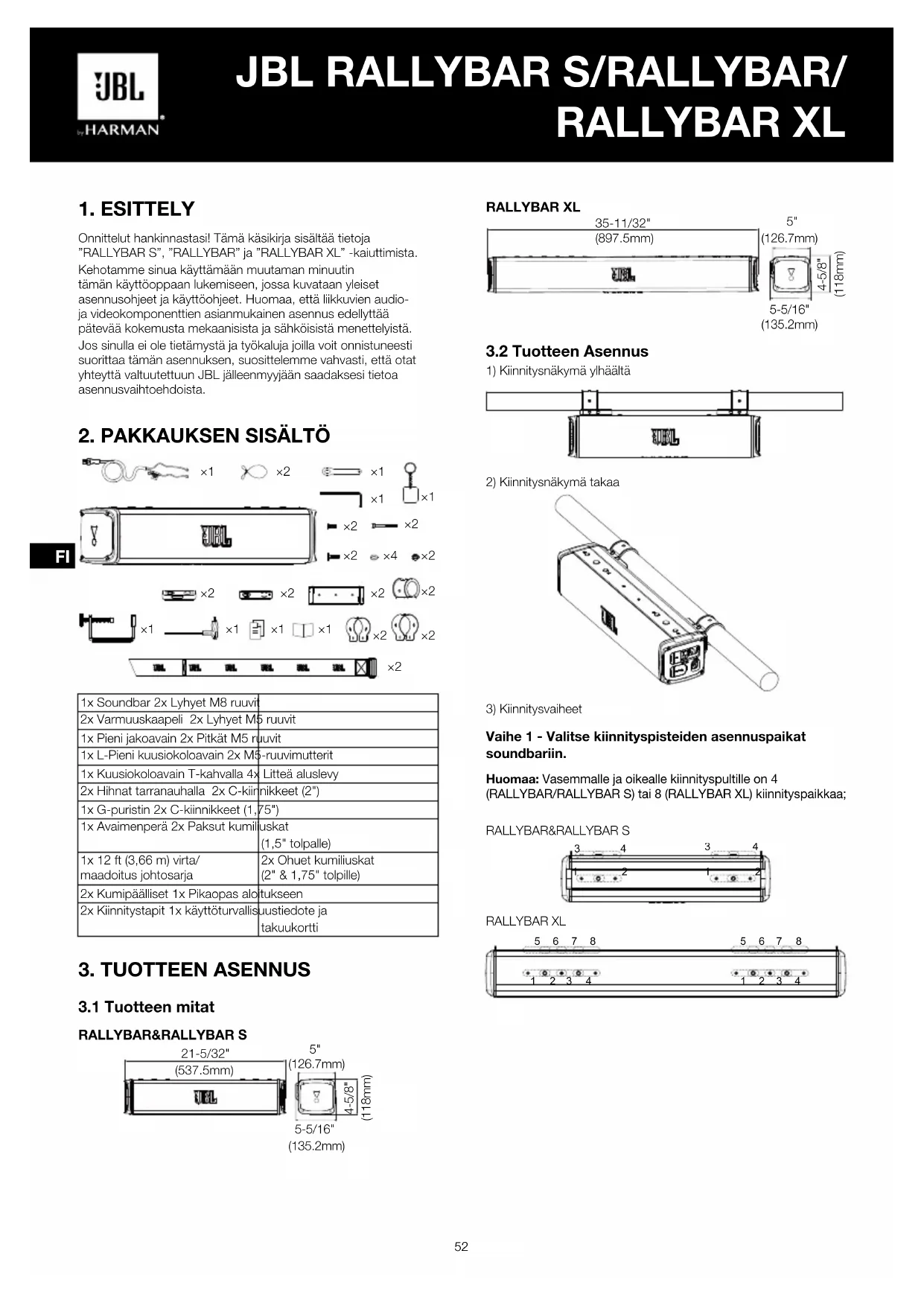 Onnittelut hankinnastasi! Tämä käsikirja sisältää tietoja ”RALLYBAR S”, ”RALLYBAR” ja ”RALLYBAR XL” -kaiuttimista. Kehotamme sinua käyttämään muutaman minuutin tämän käyttöoppaan lukemiseen, jossa kuvataan yleiset asennusohjeet ja käyttöohjeet. Huomaa, että liikkuvien audio- ja videokomponenttien asianmukainen asennus edellyttää pätevää kokemusta mekaanisista ja sähköisistä menettelyistä. Jos sinulla ei ole tietämystä ja työkaluja joilla voit onnistuneesti suorittaa tämän asennuksen, suosittelemme vahvasti, että otat yhteyttä valtuutettuun JBL jälleenmyyjään saadaksesi tietoa asennusvaihtoehdoista.