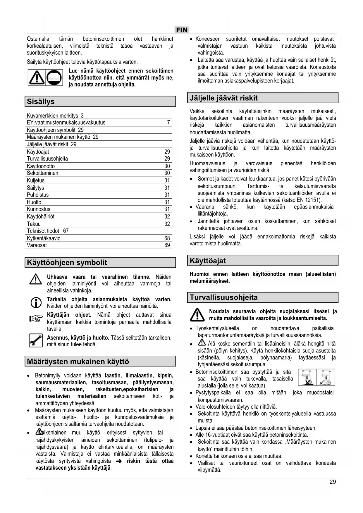 Sisällys Kuvamerkkien merkitys 3 EY-vaatimustenmukaisuusvakuutus 7 Käyttöohjeen symbolit 29 Määräysten mukainen käyttö 29 Jäljelle jäävät riskit 29 Käyttöajat 29 Turvallisuusohjeita 29 Käyttöönotto 30 Sekoittaminen 30 Kuljetus 31 Säilytys 31 Puhdistus 31 Huolto 31 Kunnostus 31 Käyttöhäiriöt 32 Takuu 32 Tekniset tiedot 67 Kytkentäkaavio 68 Varaosat 69