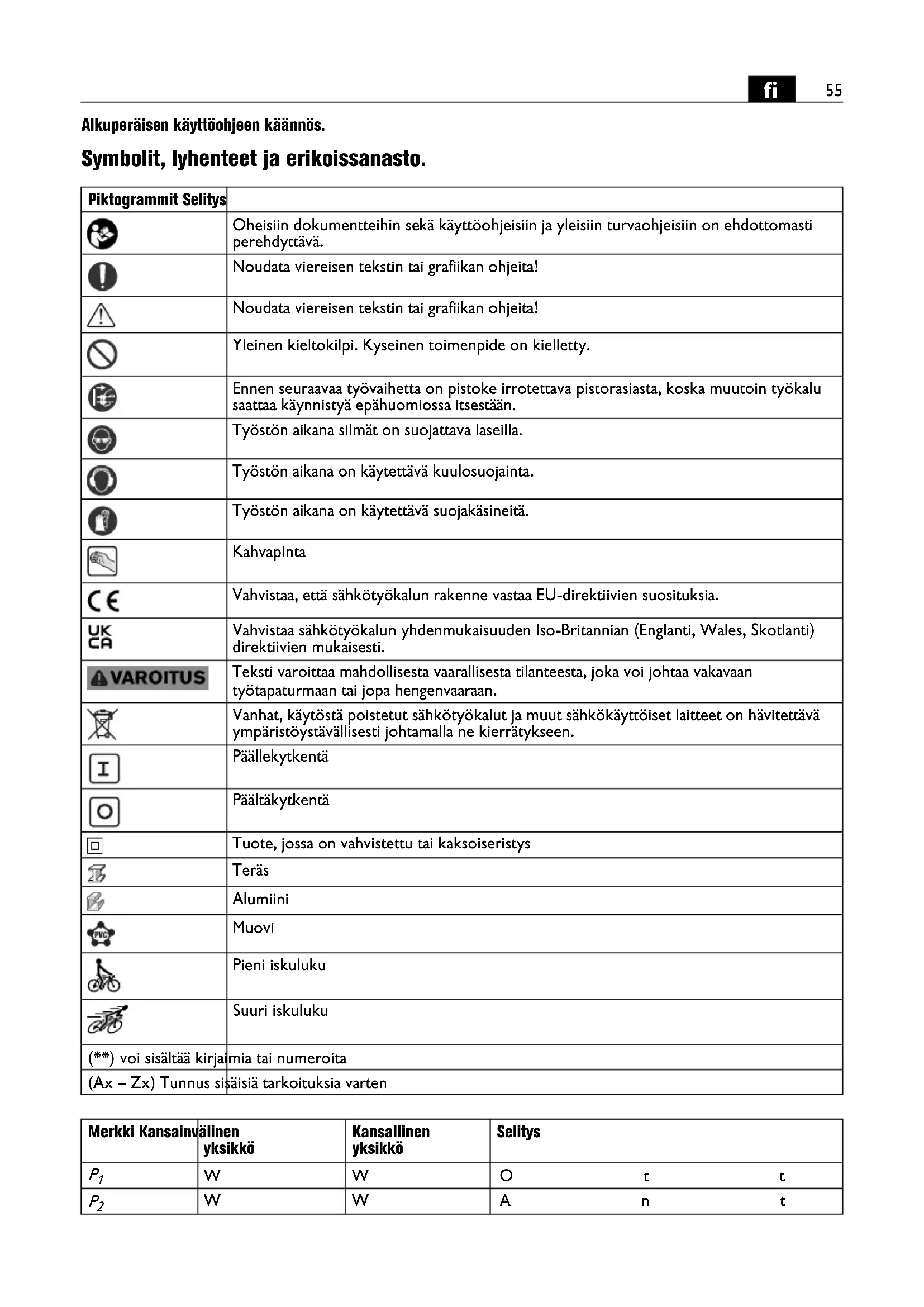 Alkuperäisen käyttöohjeen käännös. Symbolit, lyhenteet ja erikoissanasto. Piktogrammit Selitys Oheisiin dokumentteihin sekä käyttöohjeisiin ja yleisiin turvaohjeisiin on ehdottomasti perehdyttävä. Noudata viereisen tekstin tai grafiikan ohjeita! Noudata viereisen tekstin tai grafiikan ohjeita! Yleinen kieltokilpi. Kyseinen toimenpide on kielletty. Ennen seuraavaa työvaihetta on pistoke irrotettava pistorasiasta, koska muutoin työkalu saattaa käynnistyä epähuomiossa itsestään. Työstön aikana silmät on suojattava laseilla. Työstön aikana on käytettävä kuulosuojainta. Työstön aikana on käytettävä suojakäsineitä. Kahvapinta Vahvistaa, että sähkötyökalun rakenne vastaa EU-direktiivien suosituksia. Vahvistaa sähkötyökalun yhdenmukaisuuden Iso-Britannian (Englanti, Wales, Skotlanti) direktiivien mukaisesti. Teksti varoittaa mahdollisesta vaarallisesta tilanteesta, joka voi johtaa vakavaan työtapaturmaan tai jopa hengenvaaraan. Vanhat, käytöstä poistetut sähkötyökalut ja muut sähkökäyttöiset laitteet on hävitettävä ympäristöystävällisesti johtamalla ne kierrätykseen. Päällekytkentä Päältäkytkentä Tuote, jossa on vahvistettu tai kaksoiseristys Teräs Alumiini Muovi Pieni iskuluku Suuri iskuluku (**) voi sisältää kirjaimia tai numeroita (Ax – Zx) Tunnus sisäisiä tarkoituksia varten Merkki Kansainvälinen yksikkö Kansallinen yksikkö Selitys