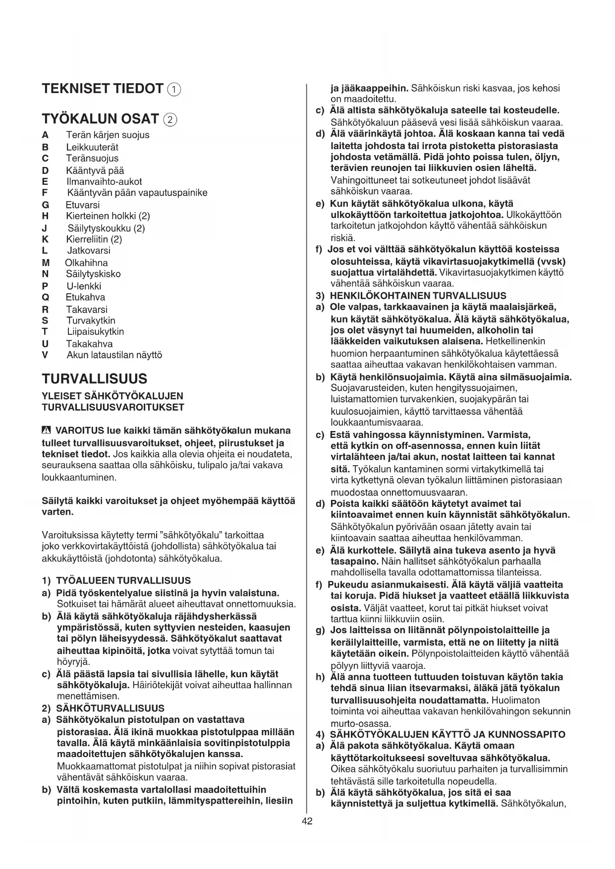 P U-lenkki Q Etukahva R Takavarsi S Turvakytkin T Liipaisukytkin U Takakahva V Akun lataustilan näyttö TURVALLISUUS