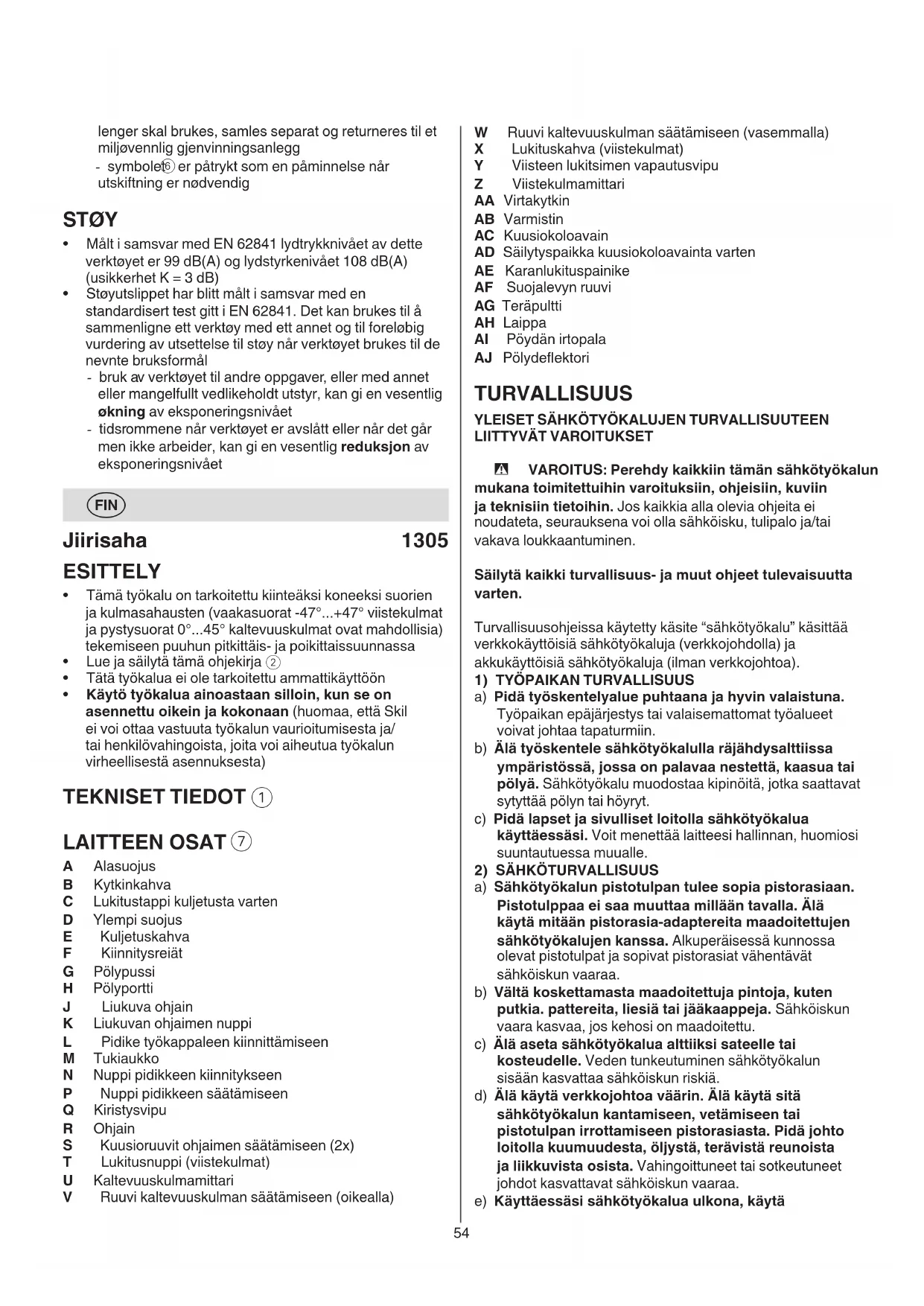 A Alasuojus B Kytkinkahva C Lukitustappi kuljetusta varten D Ylempi suojus E Kuljetuskahva F Kiinnitysreiät G Pölypussi H Pölyportti J Liukuva ohjain K Liukuvan ohjaimen nuppi L Pidike työkappaleen kiinnittämiseen M Tukiaukko N Nuppi pidikkeen kiinnitykseen P Nuppi pidikkeen säätämiseen Q Kiristysvipu R Ohjain S Kuusioruuvit ohjaimen säätämiseen (2x) T Lukitusnuppi (viistekulmat) U Kaltevuuskulmamittari V Ruuvi kaltevuuskulman säätämiseen (oikealla)55 käyttää sähkötyökalua, jotka eivät tunne sitä tai jotka eivät ole lukeneet tätä käyttöohjetta. Sähkötyökalut ovat vaarallisia, jos niitä käyttävät kokemattomat henkilöt. e) Pidä sähkötyökalut ja tarvikkeet hyvässä kunnossa. Tarkista, että liikkuvat osat toimivat moitteettomasti, eivätkä ole puristuksessa sekä, että siinä ei ole murtuneita tai vahingoittuneita osia, jotka saattaisivat vaikuttaa haitallisesti sähkötyökalun toimintaan. Anna korjauttaa mahdolliset viat ennen käyttöönottoa. Monen tapaturman syyt löytyvät huonosti huolletuista laitteista. f) Pidä leikkausterät terävinä ja puhtaina. Huolellisesti hoidetut leikkaustyökalut, joiden leikkausreunat ovat teräviä, eivät tartu helposti kiinni ja niitä on helpompi hallita. g) Käytä sähkötyökaluja, tarvikkeita, vaihtotyökaluja jne. näiden ohjeiden mukaisesti. Ota tällöin huomioon työolosuhteet ja suoritettava toimenpide. Sähkötyökalun käyttö muuhun kuin sille määrättyyn käyttöön, saattaa johtaa vaarallisiin tilanteisiin. h) Pidä kahvat ja kädensijat kuivina ja puhtaina (öljyttöminä ja rasvattomina). Jos kahvat ja kädensijat ovat liukkaita, et pysty yllättävissä tilanteissa ohjaamaan ja hallitsemaan työkalua turvallisesti.