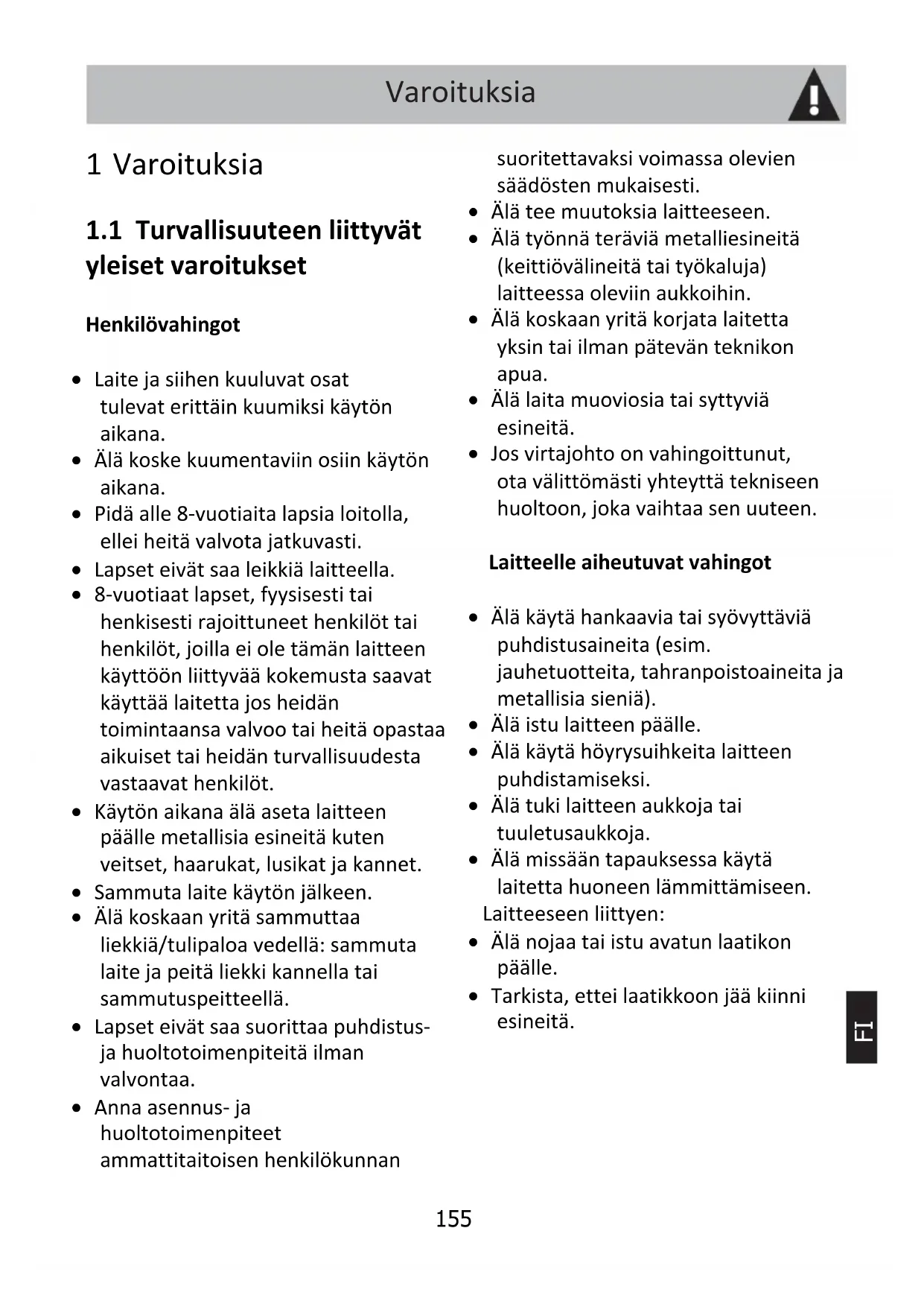 - 8-vuotiaat lapset, fyysisesti tai henkisesti rajoittuneet henkilöt tai henkilöt, joilla ei ole tämän laitteen käyttöön liittyvää kokemusta saavat käyttää laitetta jos heidän toimintaansa valvoo tai heitä opastaa aikuiset tai heidän turvallisuudesta vastaavat henkilöt.
