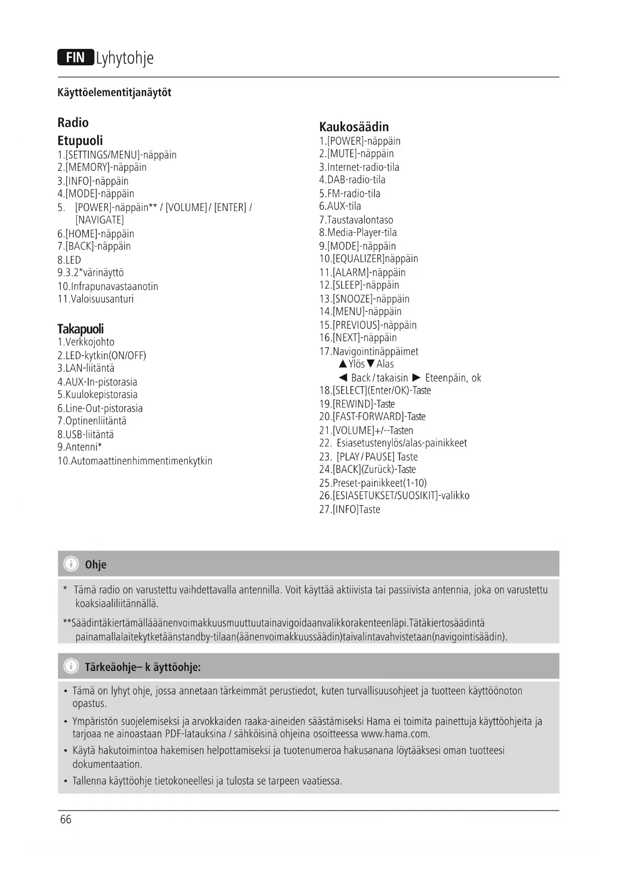 Ohje *Tämä radio on varustettu vaihdettavalla antennil la. Voit käyttää aktiivista tai passiivista antennia, joka on varustettu koaksiaaliliitännällä. ** Säädintä kiertämällä äänenvoimakkuus muuttuu tai navigoidaan valikkorakenteen läpi. Tätä kiertosäädintä painamalla laite kytketään standby-tilaan (äänenvoimakkuussäädin) tai valinta vahvistetaan (navigointisäädin). Tärkeä ohje –käyttöohje: