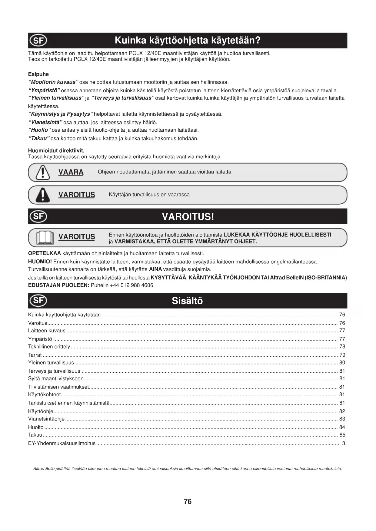 Altrad Belle pidättää itsellään oikeuden muuttaa laitteen teknisiä ominaisuuksia ilmoittamatta siitä etukäteen eikä kanna oikeudellista vastuuta mahdollisista muutoksista. OPETELKAA käyttämään ohjainlaitteita ja huoltamaan laitetta turvallisesti. HUOMIO! Ennen kuin käynnistätte laitteen, varmistakaa, että osaatte pysäyttää laitteen mahdollisessa ongelmatilanteessa. Turvallisuutenne kannalta on tärkeää, että käytätte AINA vaadittuja suojaimia. Jos teillä on laitteen turvallisesta käytöstä tai huollosta KYSYTTÄVÄÄ, KÄÄNTYKÄÄ TYÖNJOHDON TAI Altrad BelleIN (ISO-BRITANNIA) EDUSTAJAN PUOLEEN: Puhelin +44 012 988 4606