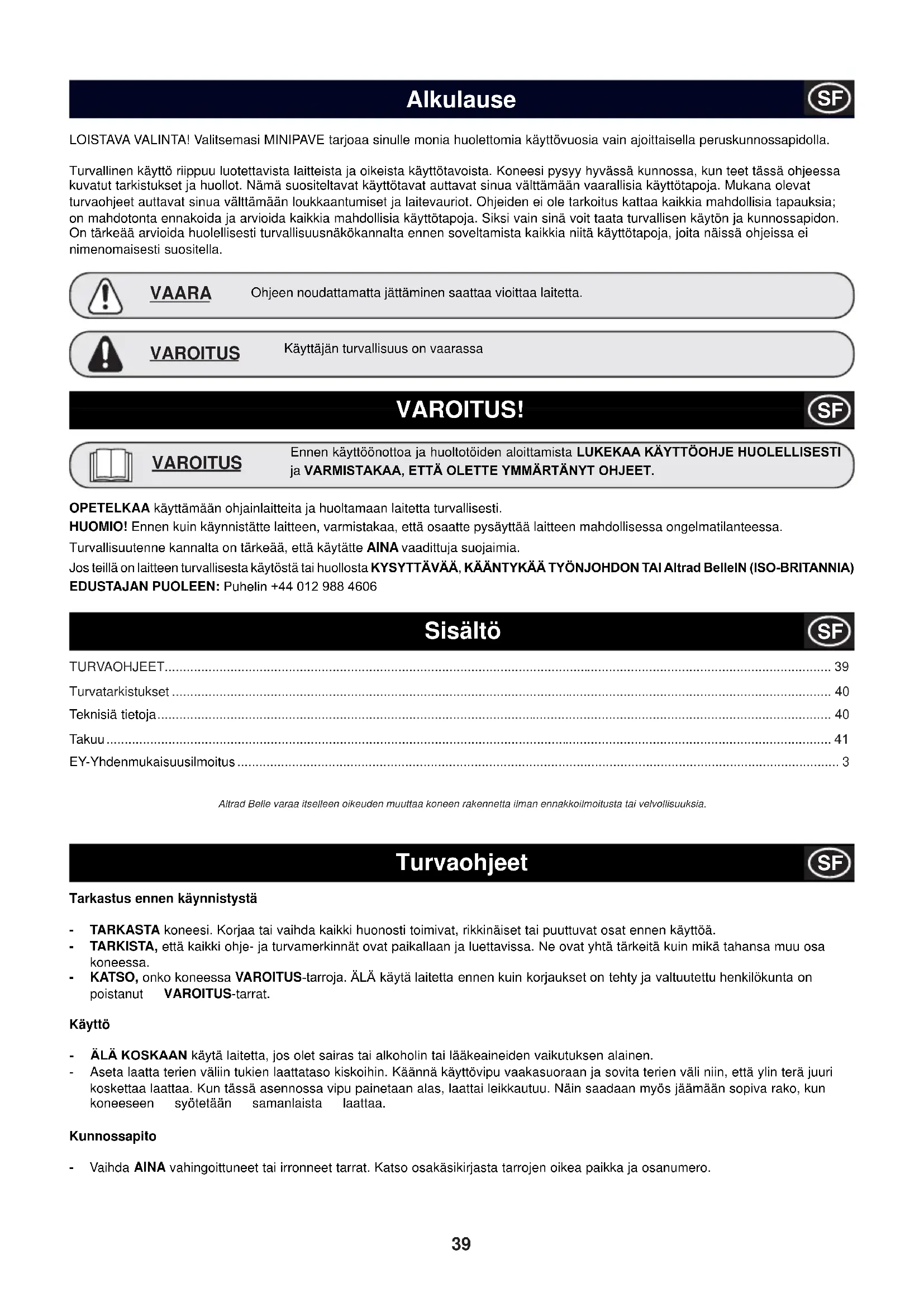LOISTAVA VALINTA! Valitsemasi MINIPAVE tarjoaa sinulle monia huolettomia käyttövuosia vain ajoittaisella peruskunnossapidolla. Turvallinen käyttö riippuu luotettavista laitteista ja oikeista käyttötavoista. Koneesi pysyy hyvässä kunnossa, kun teet tässä ohjeessa kuvatut tarkistukset ja huollot. Nämä suositeltavat käyttötavat auttavat sinua välttämään vaarallisia käyttötapoja. Mukana olevat turvaohjeet auttavat sinua välttämään loukkaantumiset ja laitevauriot. Ohjeiden ei ole tarkoitus kattaa kaikkia mahdollisia tapauksia; on mahdotonta ennakoida ja arvioida kaikkia mahdollisia käyttötapoja. Siksi vain sinä voit taata turvallisen käytön ja kunnossapidon. On tärkeää arvioida huolellisesti turvallisuusnäkökannalta ennen soveltamista kaikkia niitä käyttötapoja, joita näissä ohjeissa ei nimenomaisesti suositella. TURVAOHJEET....................................................................................................................................................................................... Turvatarkistukset ..................................................................................................................................................................................... 40 Teknisiä tietoja ......................................................................................................................................................................................... 40 Takuu ....................................................................................................................................................................................................... EY-Yhdenmukaisuusilmoitus ..................................................................................................................................................................... 3 Altrad Belle varaa itselleen oikeuden muuttaa koneen rakennetta ilman ennakkoilmoitusta tai velvollisuuksia. Turvaohjeet Tarkastus ennen käynnistystä - TARKASTA koneesi. Korjaa tai vaihda kaikki huonosti toimivat, rikkinäiset tai puuttuvat osat ennen käyttöä. - TARKISTA, että kaikki ohje- ja turvamerkinnät ovat paikallaan ja luettavissa. Ne ovat yhtä tärkeitä kuin mikä tahansa muu osa koneessa. - KATSO, onko koneessa VAROITUSWDUURMDb/bNl\WlODLWHWWDHQQHQNXLQNRUMDXNVHWRQWHKW\MDYDOWXXWHWWXKHQNLO|NXQWDRQ poistanut VAROITUS-tarrat. Käyttö b/b.26.$$1 käytä laitetta, jos olet sairas tai alkoholin tai lääkeaineiden vaikutuksen alainen. - Aseta laatta terien väliin tukien laattataso kiskoihin. Käännä käyttövipu vaakasuoraan ja sovita terien väli niin, että ylin terä juuri koskettaa laattaa. Kun tässä asennossa vipu painetaan alas, laattai leikkautuu. Näin saadaan myös jäämään sopiva rako, kun koneeseen syötetään samanlaista laattaa. Kunnossapito - Vaihda AINA vahingoittuneet tai irronneet tarrat. Katso osakäsikirjasta tarrojen oikea paikka ja osanumero.