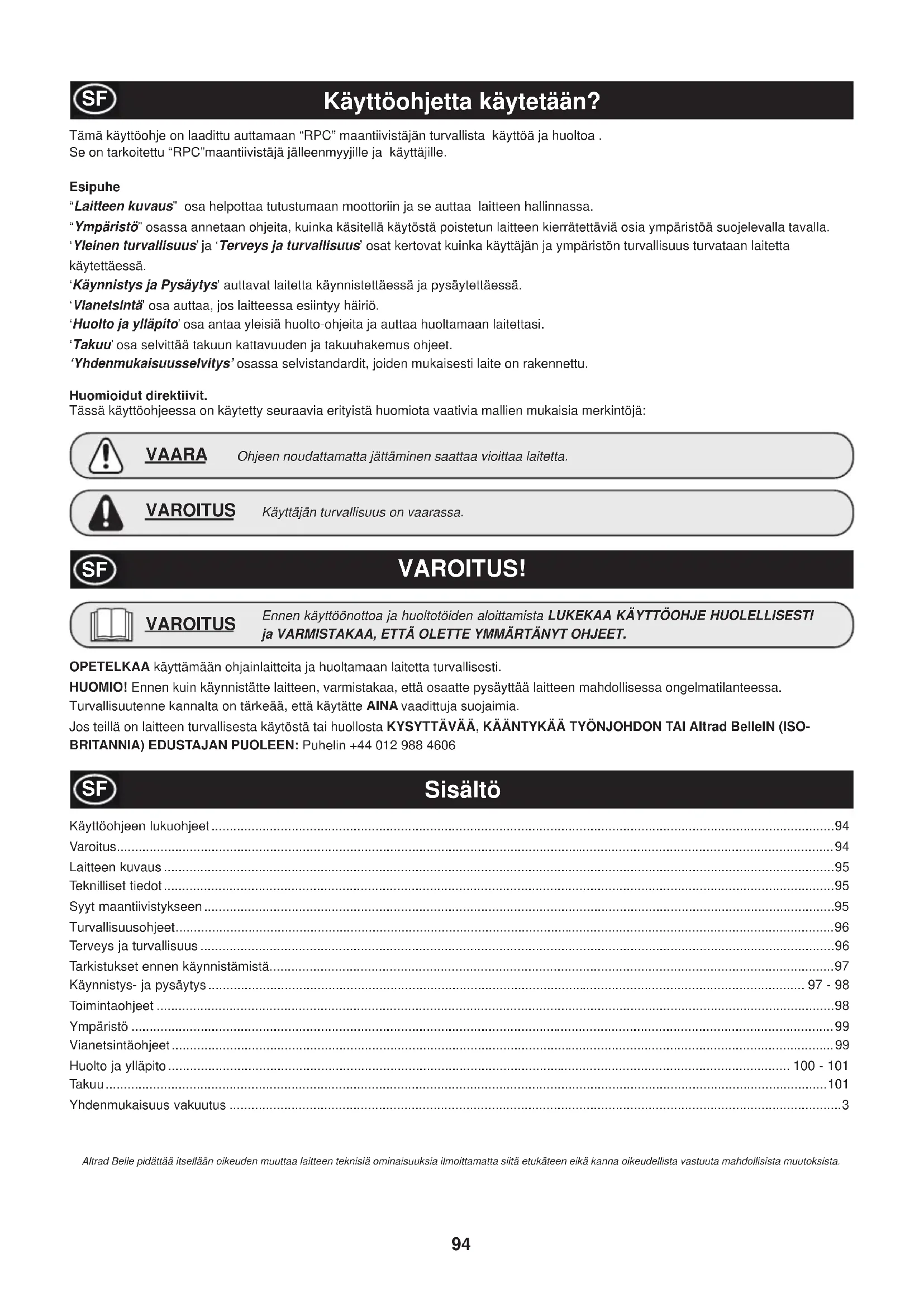 Altrad Belle pidättää itsellään oikeuden muuttaa laitteen teknisiä ominaisuuksia ilmoittamatta siitä etukäteen eikä kanna oikeudellista vastuuta mahdollisista muutoksista. VAROITUS Käyttäjän turvallisuus on vaarassa. OPETELKAA käyttämään ohjainlaitteita ja huoltamaan laitetta turvallisesti. HUOMIO! Ennen kuin käynnistätte laitteen, varmistakaa, että osaatte pysäyttää laitteen mahdollisessa ongelmatilanteessa. Turvallisuutenne kannalta on tärkeää, että käytätte AINA vaadittuja suojaimia. Jos teillä on laitteen turvallisesta käytöstä tai huollosta KYSYTTÄVÄÄ, KÄÄNTYKÄÄ TYÖNJOHDON TAI Altrad BelleIN (ISO- BRITANNIA) EDUSTAJAN PUOLEEN: Puhelin +44 012 988 4606