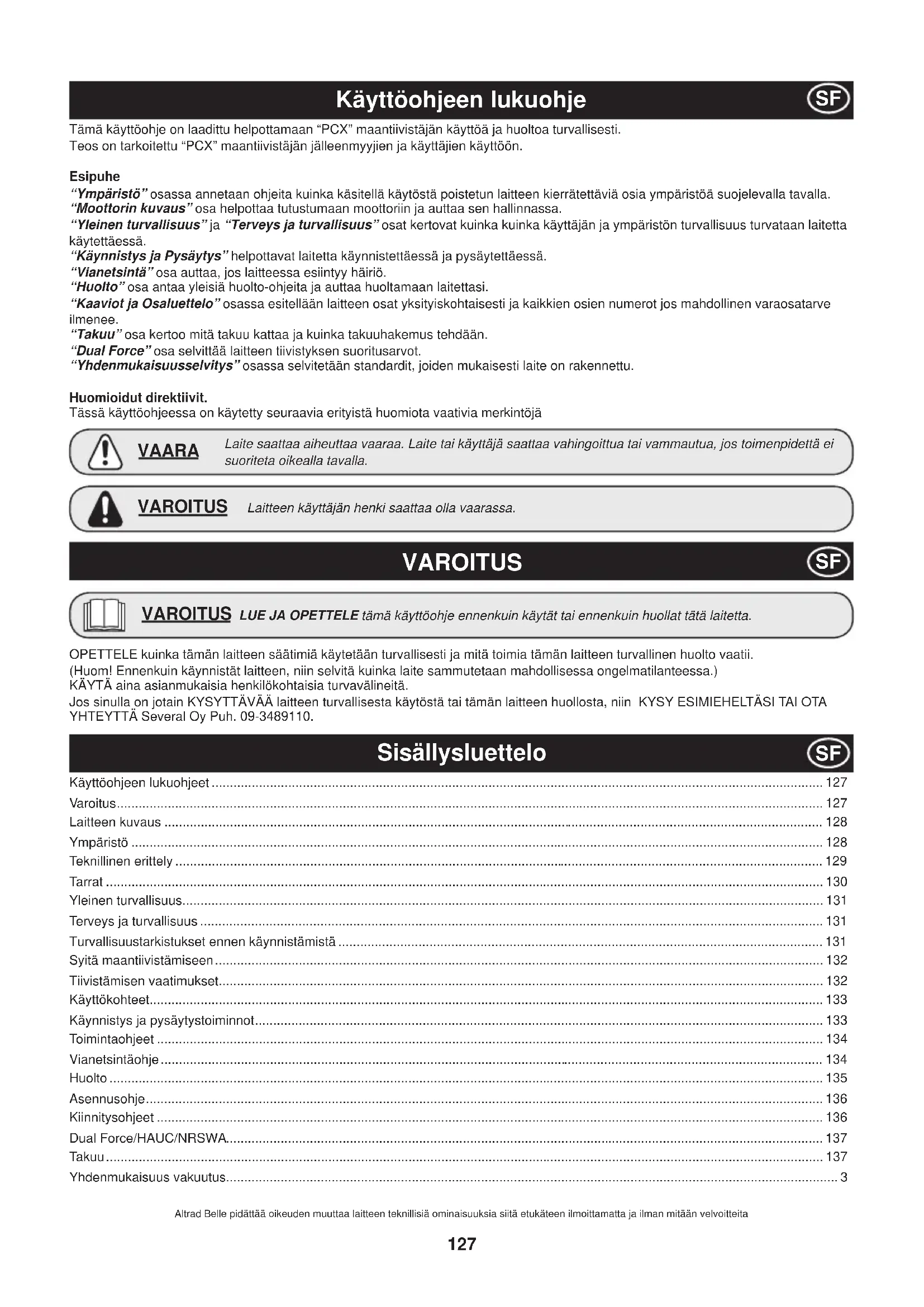 - Tämä käyttöohje on laadittu helpottamaan “PCX” maantiivistäjän käyttöä ja huoltoa turvallisesti. Teos on tarkoitettu “PCX” maantiivistäjän jälleenmyyjien ja käyttäjien käyttöön. Esipuhe “Ympäristö” osassa annetaan ohjeita kuinka käsitellä käytöstä poistetun laitteen kierrätettäviä osia ympäristöä suojelevalla tavalla. “Moottorin kuvaus” osa helpottaa tutustumaan moottoriin ja auttaa sen hallinnassa. “Yleinen turvallisuus” ja “Terveys ja turvallisuus” osat kertovat kuinka kuinka käyttäjän ja ympäristön turvallisuus turvataan laitetta käytettäessä. “Käynnistys ja Pysäytys” helpottavat laitetta käynnistettäessä ja pysäytettäessä. “Vianetsintä” osa auttaa, jos laitteessa esiintyy häiriö. “Huolto” osa antaa yleisiä huolto-ohjeita ja auttaa huoltamaan laitettasi. “Kaaviot ja Osaluettelo” osassa esitellään laitteen osat yksityiskohtaisesti ja kaikkien osien numerot jos mahdollinen varaosatarve ilmenee. “Takuu” osa kertoo mitä takuu kattaa ja kuinka takuuhakemus tehdään. “Dual Force” osa selvittää laitteen tiivistyksen suoritusarvot. “Yhdenmukaisuusselvitys” osassa selvitetään standardit, joiden mukaisesti laite on rakennettu. Huomioidut direktiivit. Tässä käyttöohjeessa on käytetty seuraavia erityistä huomiota vaativia merkintöjä LUE JA OPETTELE tämä käyttöohje ennenkuin käytät tai ennenkuin huollat tätä laitetta. VAROITUS OPETTELE kuinka tämän laitteen säätimiä käytetään turvallisesti ja mitä toimia tämän laitteen turvallinen huolto vaatii. (Huom! Ennenkuin käynnistät laitteen, niin selvitä kuinka laite sammutetaan mahdollisessa ongelmatilanteessa.) KÄYTÄ aina asianmukaisia henkilökohtaisia turvavälineitä. Jos sinulla on jotain KYSYTTÄVÄÄ laitteen turvallisesta käytöstä tai tämän laitteen huollosta, niin KYSY ESIMIEHELTÄSI TAI OTA YHTEYTTÄ Several Oy Puh. 09-3489110. Käyttöohjeen lukuohjeet p. 127