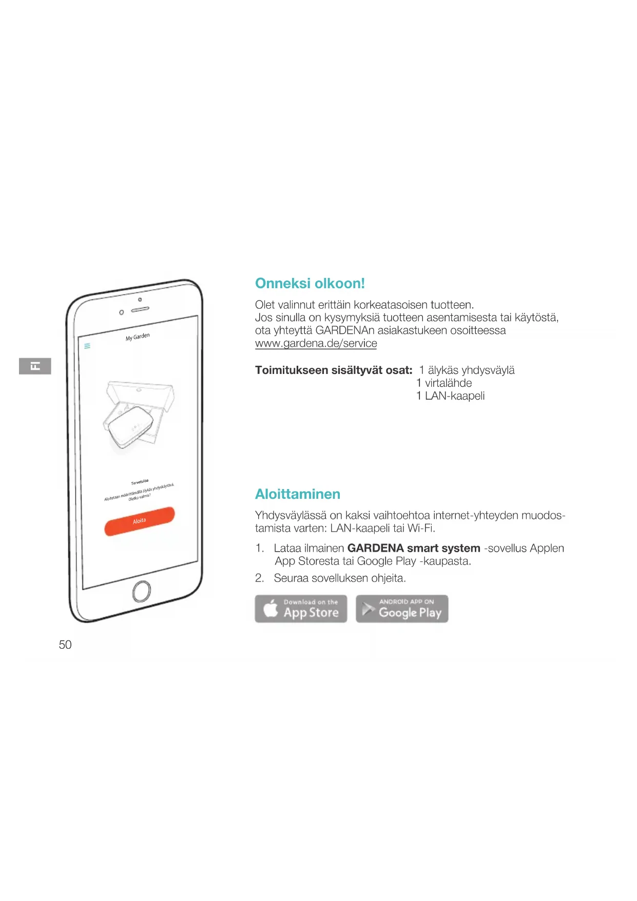 Onneksi olkoon! Olet valinnut erittäin korkeatasoisen tuotteen. Jos sinulla on kysymyksiä tuotteen asentamisesta tai käytöstä, ota yhteyttä GARDENAn asiakastukeen osoitteessa www.gardena.de/service Toimitukseen sisältyvät osat: 1 älykäs yhdysväylä 1 virtalähde 1 LAN-kaapeli Aloittaminen Yhdysväylässä on kaksi vaihtoehtoa internet-yhteyden muodos- tamista varten: LAN-kaapeli tai Wi-Fi.