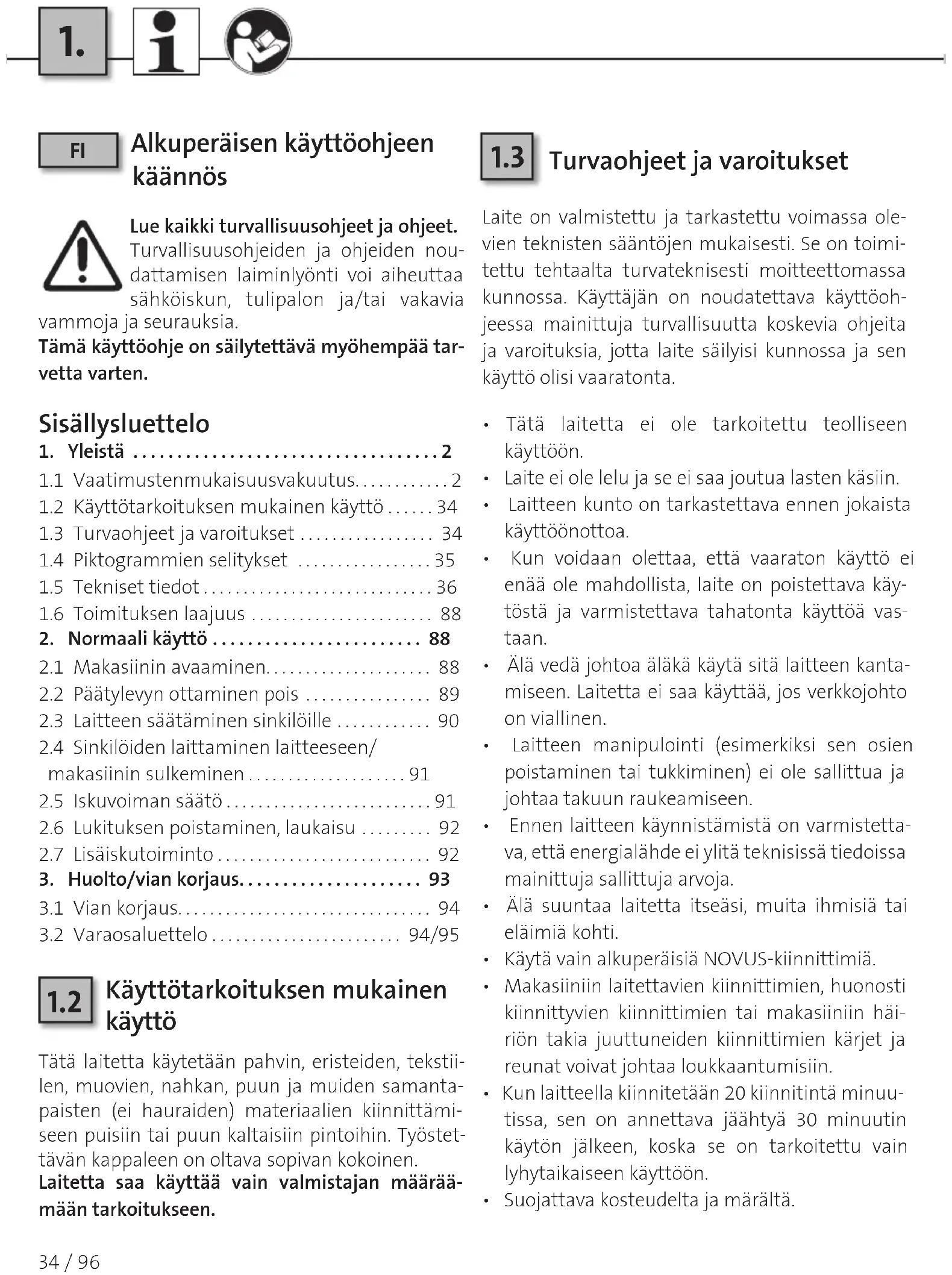 . Vaatimustenmukaisuusvakuutus............ . Käyttötarkoituksen mukainen käyttö ...... . Turvaohjeet ja varoitukset ................. . Piktogrammien selitykset ................. . Tekniset tiedot . . . . . . . . . . . . . . . . . . . . . . . . . . . . . . Toimituksen laajuus .......................