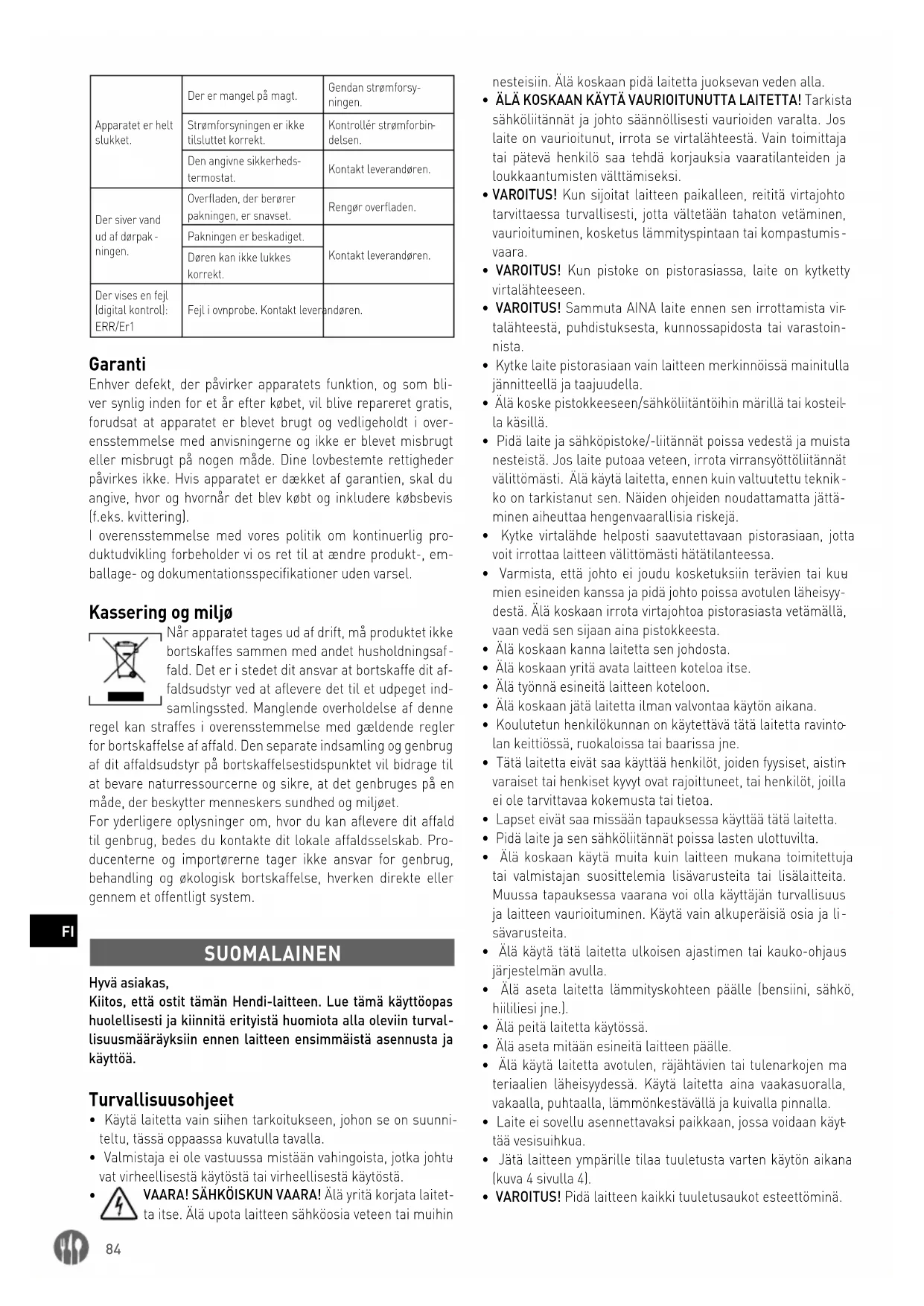 ducenterne og importørerne tager ikke ansvar for genbrug, behandling og økologisk bortskaffelse, hverken direkte eller gennem et offentligt system. SUOMALAINEN Hyvä asiakas, Kiitos, että ostit tämän Hendi-laitteen. Lue tämä käyttöopas huolellisesti ja kiinnitä erityistä huomiota alla oleviin turval
