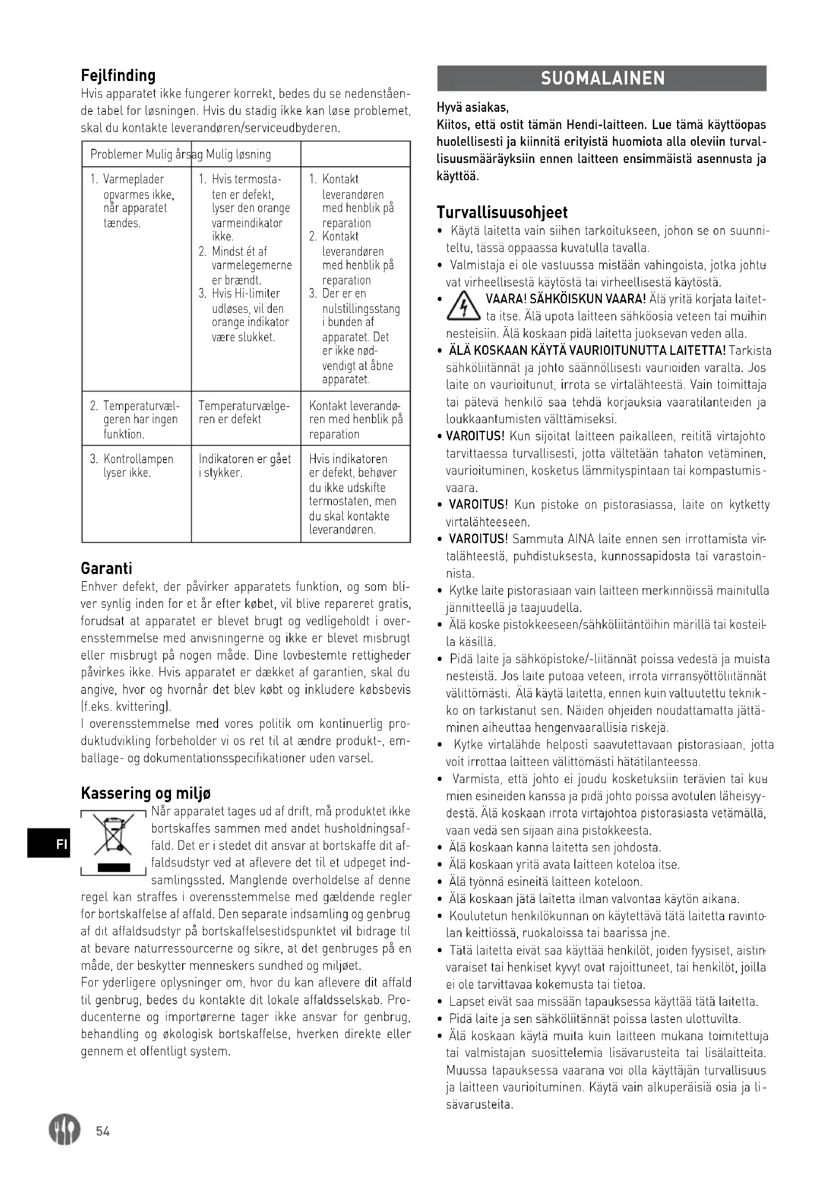 ducenterne og importørerne tager ikke ansvar for genbrug, behandling og økologisk bortskaffelse, hverken direkte eller gennem et offentligt system. SUOMALAINEN Hyvä asiakas, Kiitos, että ostit tämän Hendi-laitteen. Lue tämä käyttöopas huolellisesti ja kiinnitä erityistä huomiota alla oleviin turval