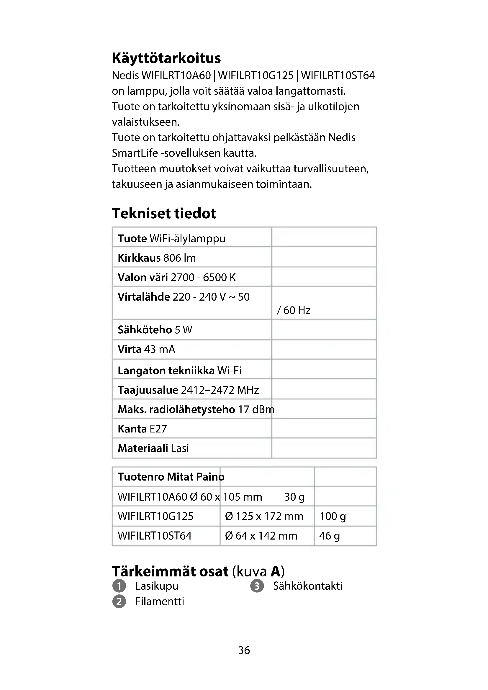 Pika-aloitusopas WiFi-älylamppu WIFILRT10A60 WIFILRT10G125 WIFILRT10ST64 Katso tarkemmat tiedot käyttöoppaan laajemmasta verkkoversiosta: ned.is/wilrt10a60 ned.is/wilrt10g125 ned.is/wilrt10st6436 Käyttötarkoitus Nedis WIFILRT10A60 | WIFILRT10G125 | WIFILRT10ST64 on lamppu, jolla voit säätää valoa langattomasti. Tuote on tarkoitettu yksinomaan sisä- ja ulkotilojen valaistukseen. Tuote on tarkoitettu ohjattavaksi pelkästään Nedis SmartLife -sovelluksen kautta. Tuotteen muutokset voivat vaikuttaa turvallisuuteen, takuuseen ja asianmukaiseen toimintaan. Tekniset tiedot Tuote WiFi-älylamppu Kirkkaus 806 lm Valon väri 2700 - 6500 K Virtalähde 220 - 240 V ~ 50 / 60 Hz Sähköteho 5 W Virta 43 mA Langaton tekniikka Wi-Fi Taajuusalue 2412–2472 MHz Maks. radiolähetysteho 17 dBm Kanta E27 Materiaali Lasi Tuotenro Mitat Paino WIFILRT10A60 Ø 60 x 105 mm 30 g WIFILRT10G125 Ø 125 x 172 mm 100 g WIFILRT10ST64 Ø 64 x 142 mm 46 g Tärkeimmät osat (kuva A) 1 Lasikupu 2 Filamentti 3 Sähkökontakti37 Turvallisuusohjeet